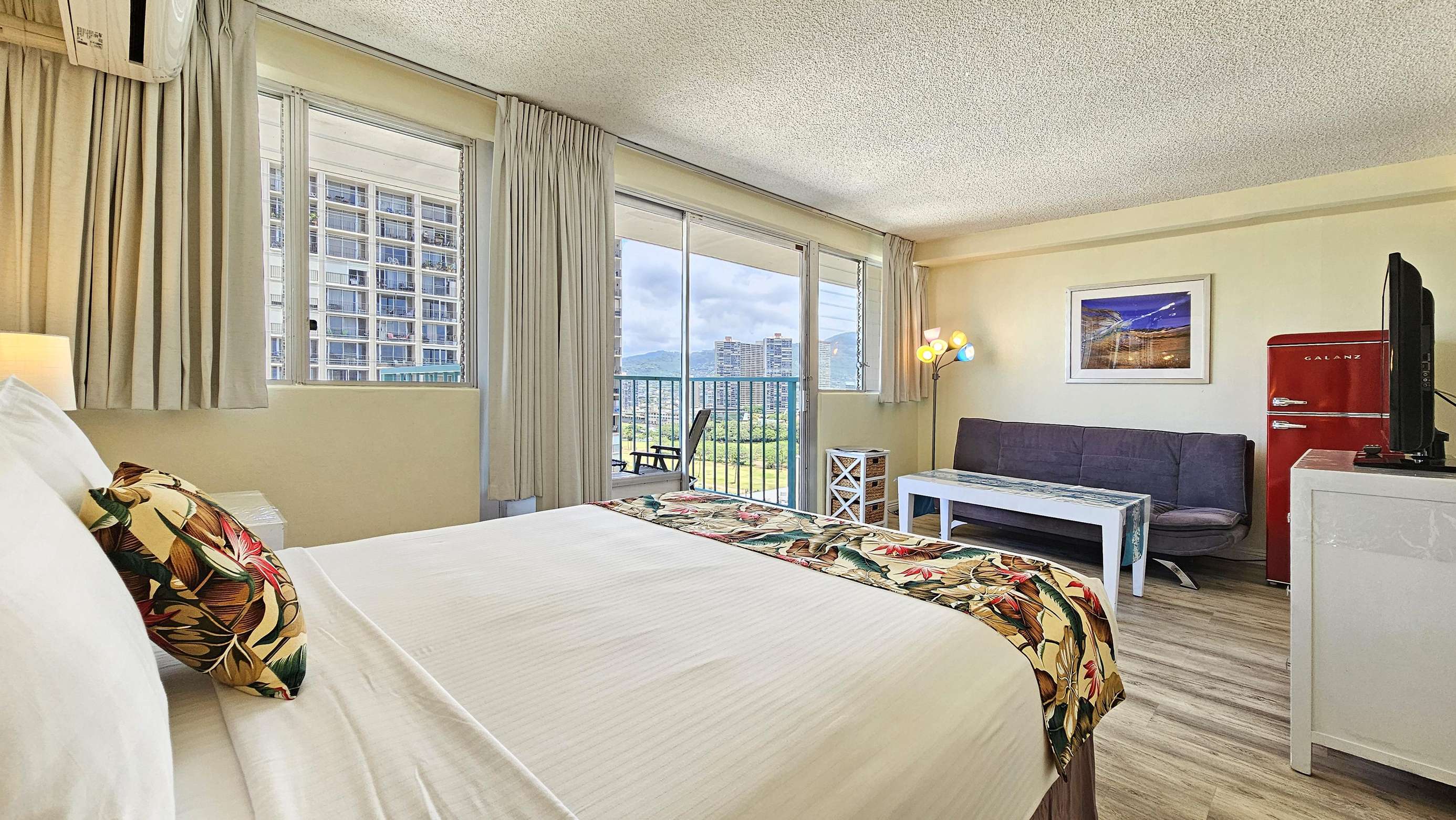This high floor Studio unit has everything you need for comfortable stay, and all the convenience of a central Waikiki location. Enjoy morning coffee and mountain views for the balcony. Featuring a Queen size bed & a futon.