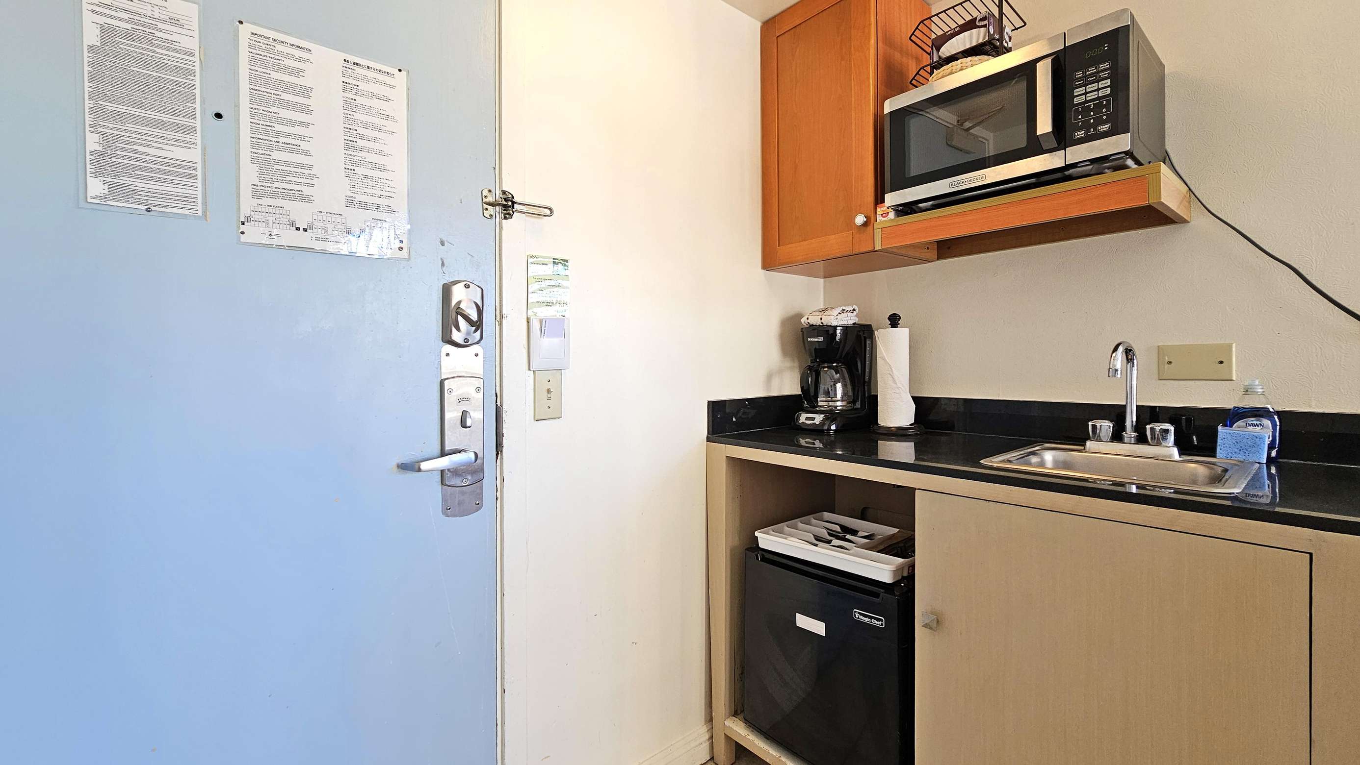 Our studio has a new air-conditioner, kitchenette area with small refrigerator, microwave, coffee-maker, color cable TV, hair dryer, iron/ironing board, and free Internet access.