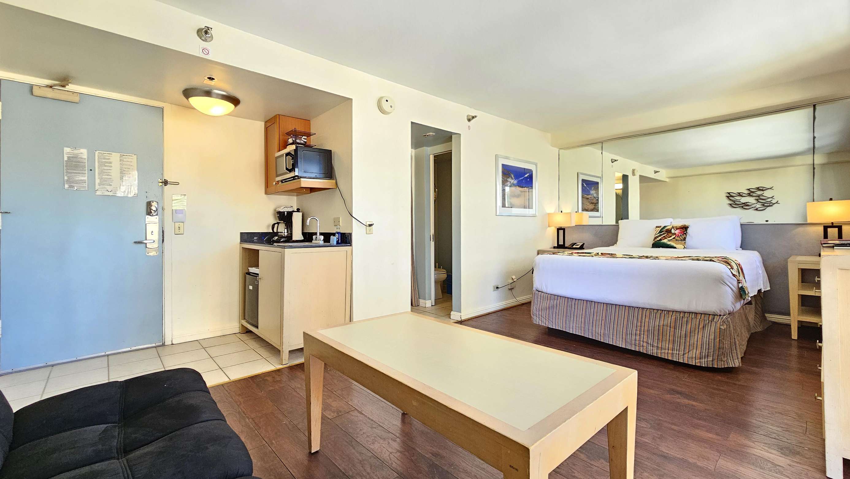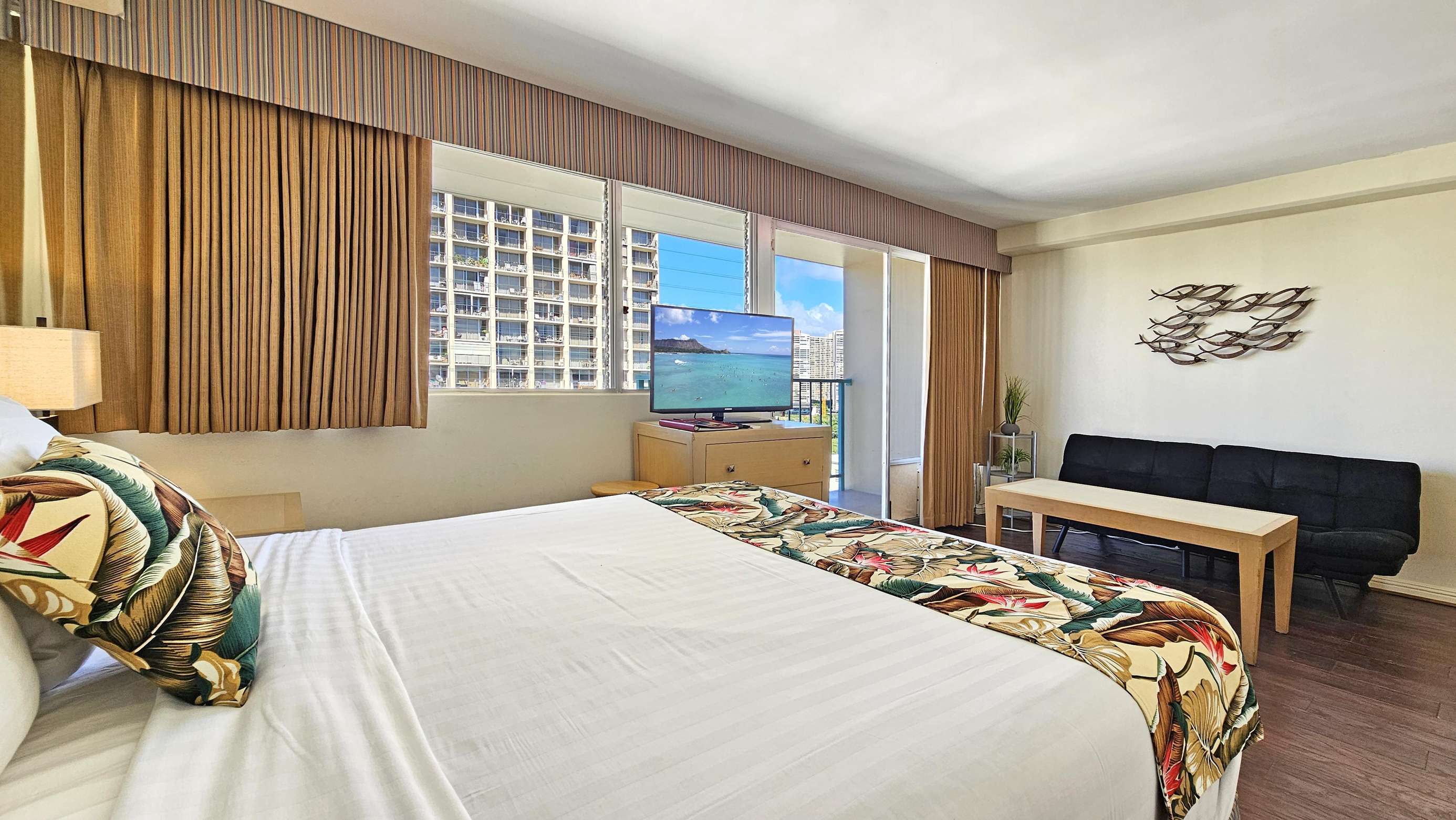 This high floor Studio unit has everything you need for comfortable stay, and all the convenience of a central Waikiki location. Enjoy morning coffee and mountain views for the balcony. Featuring a queen size bed and a sleeper-sofa.