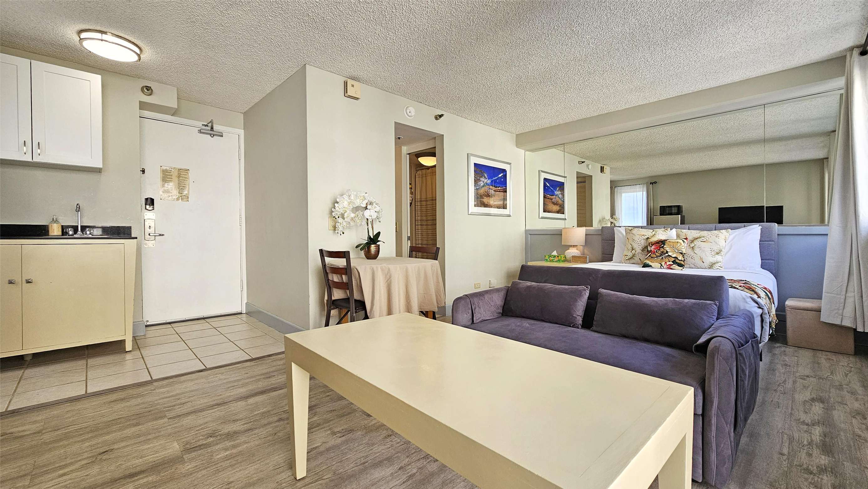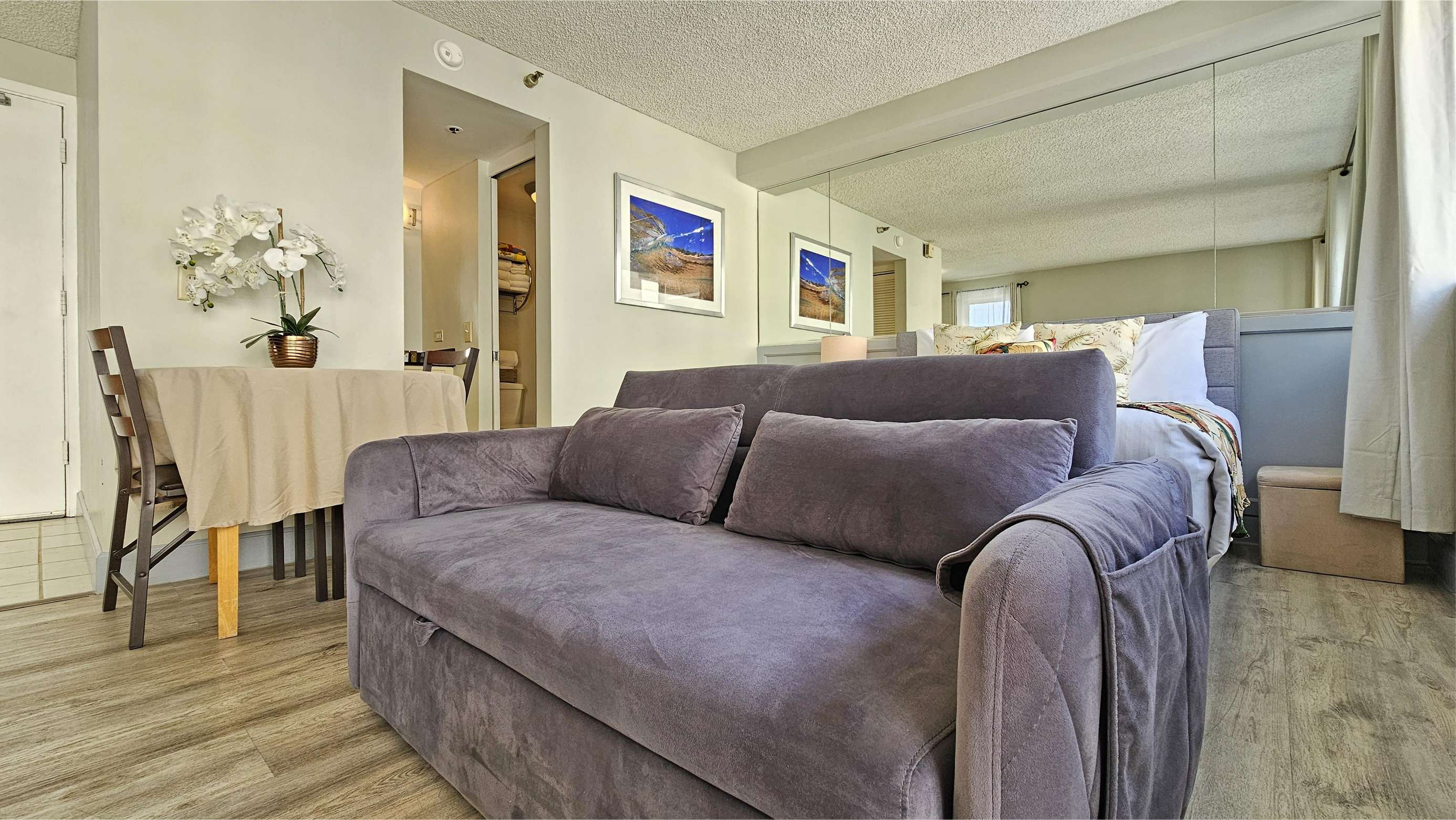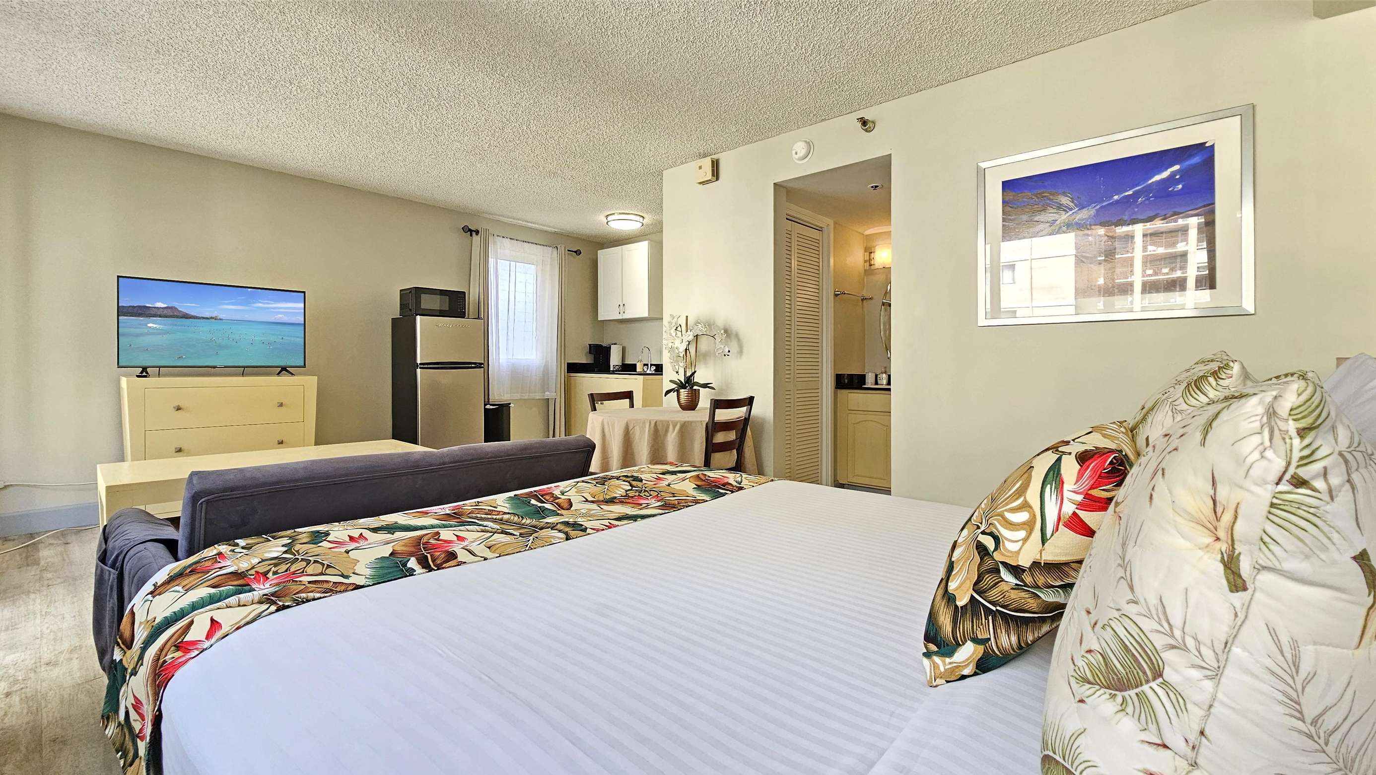 Condo has living area with HD TV, kitchenette, lanai with furniture. Studio has Queen size bed & Sofabed, 2 night stands, lamps and in room phone.