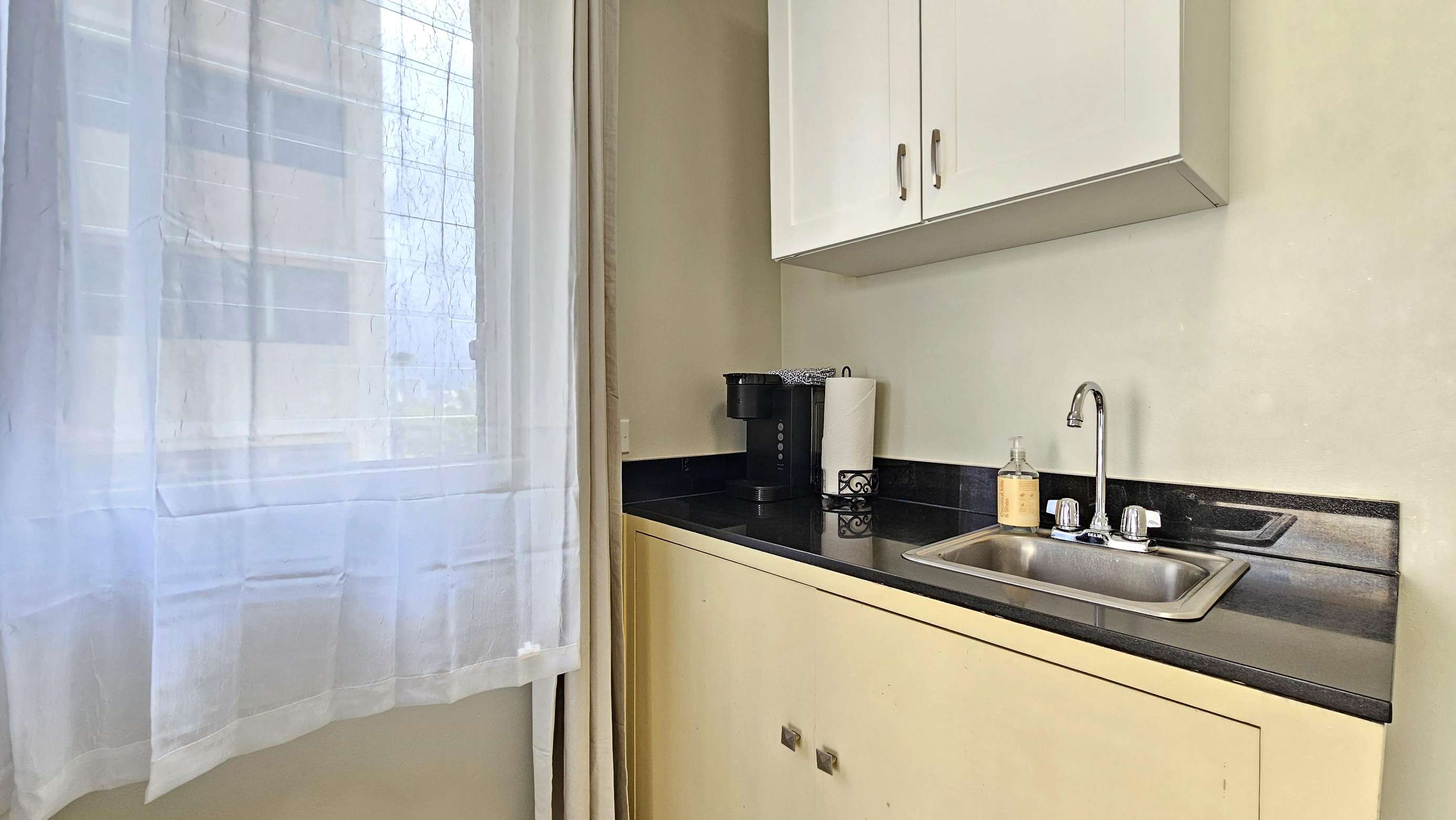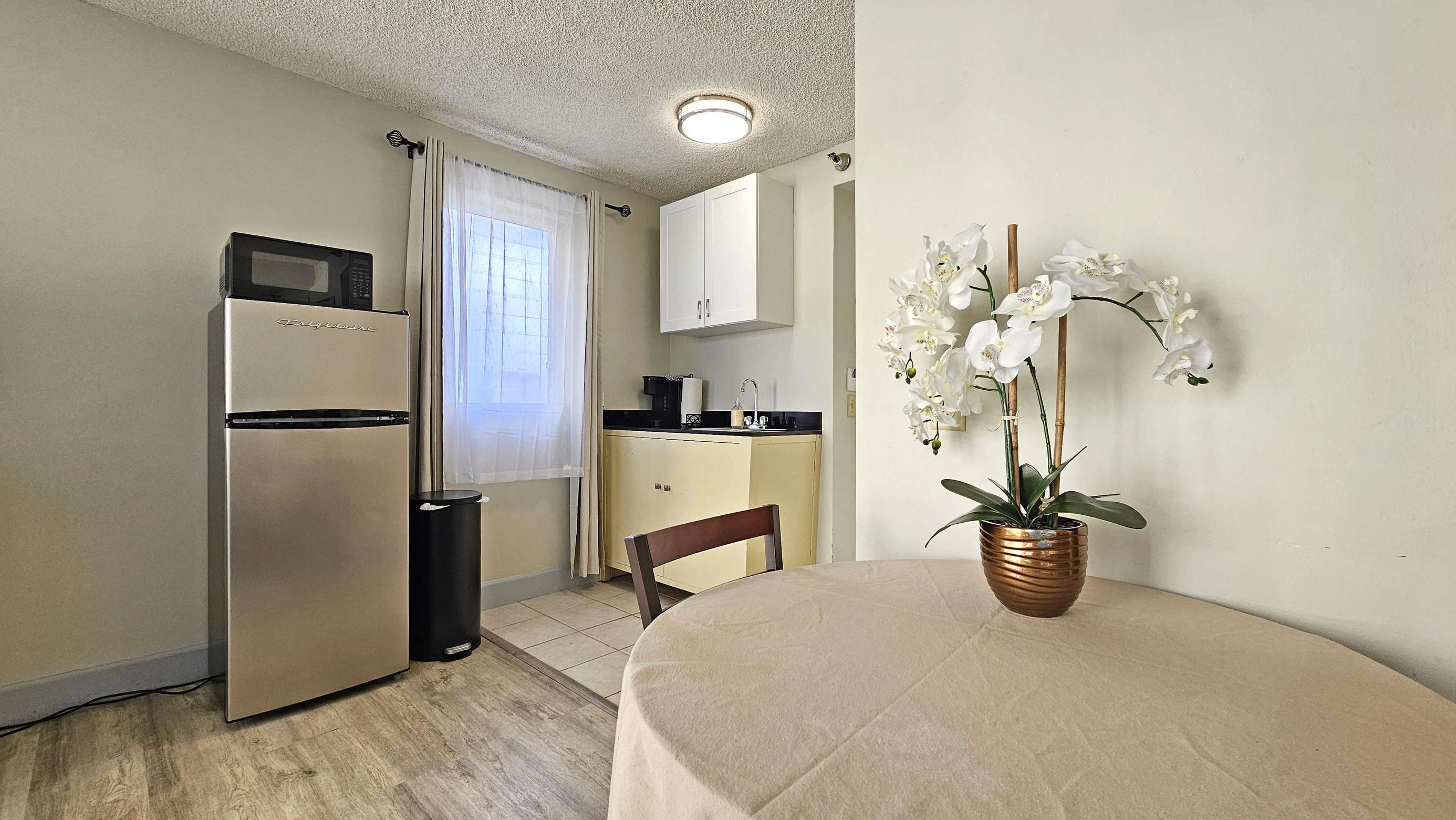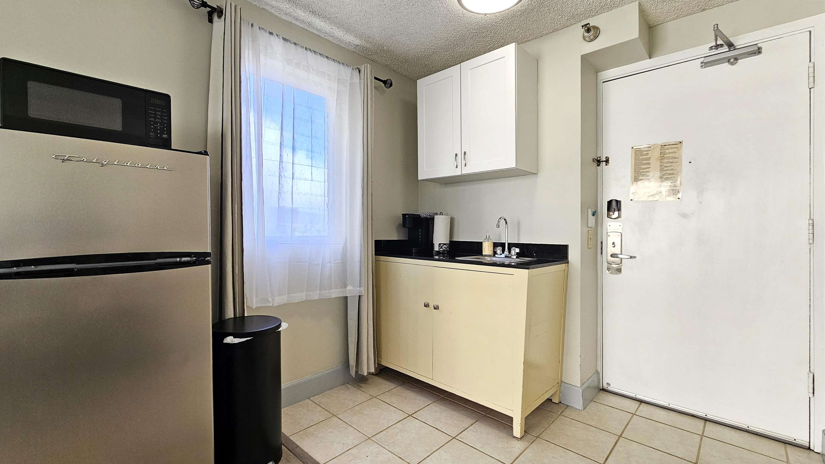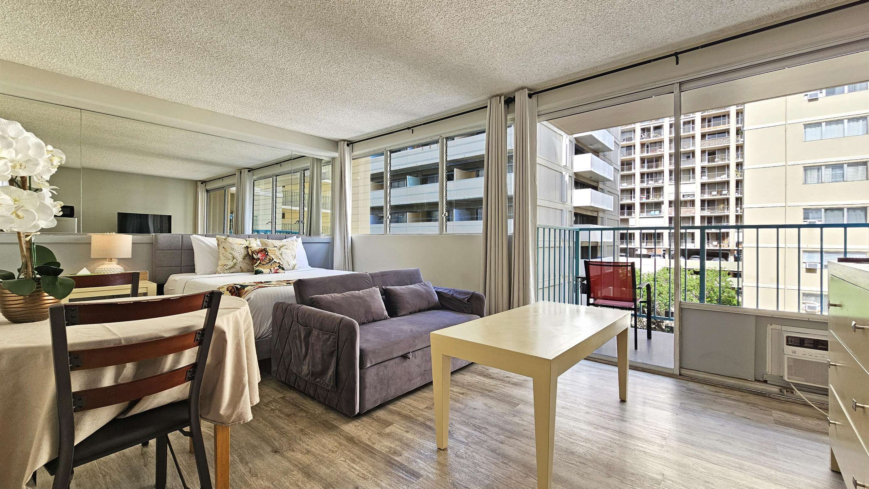 Condo has living area with HD TV, kitchenette, lanai with furniture. Studio has Queen size bed & Sofabed, 2 night stands, lamps and in room phone.