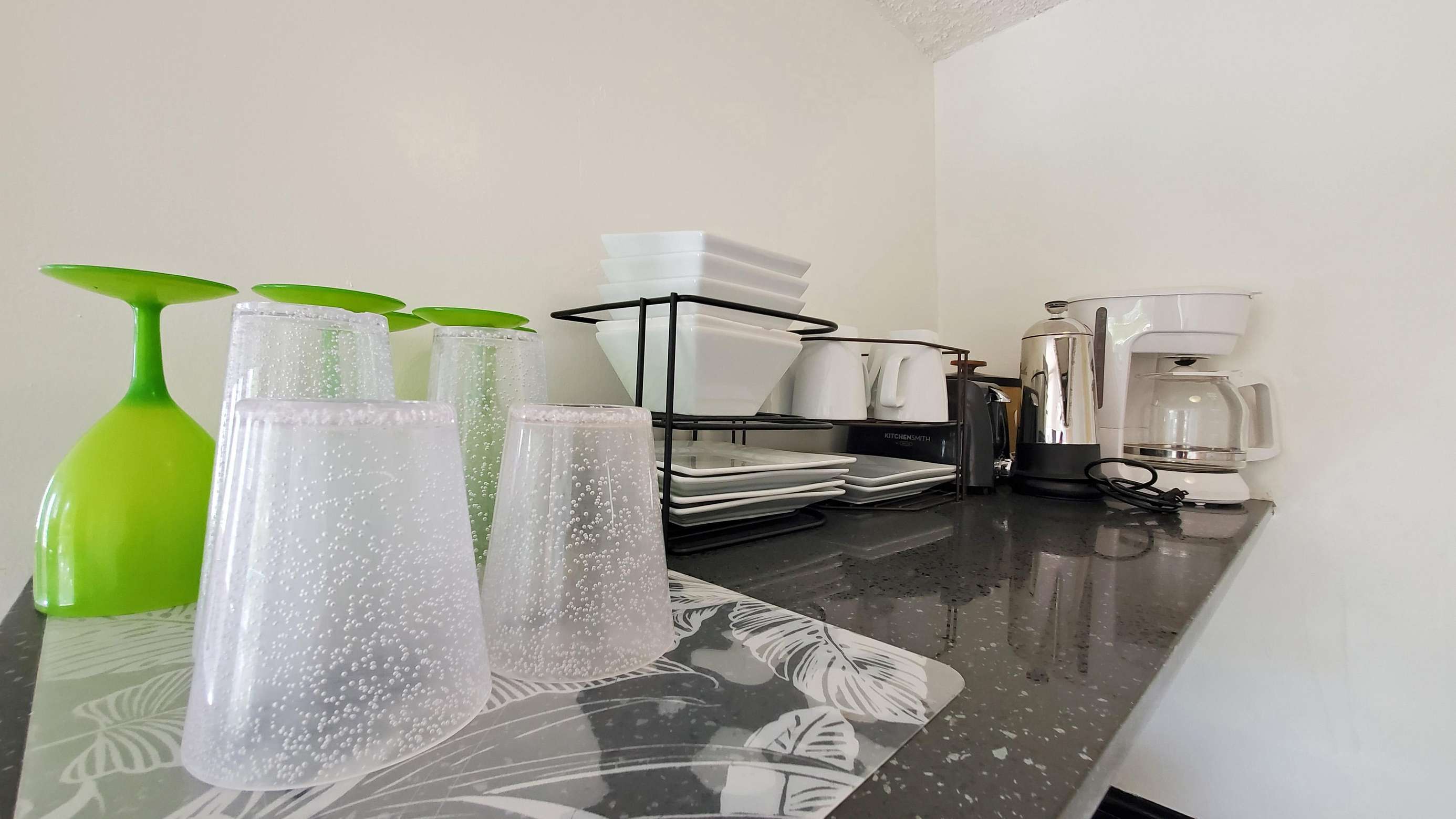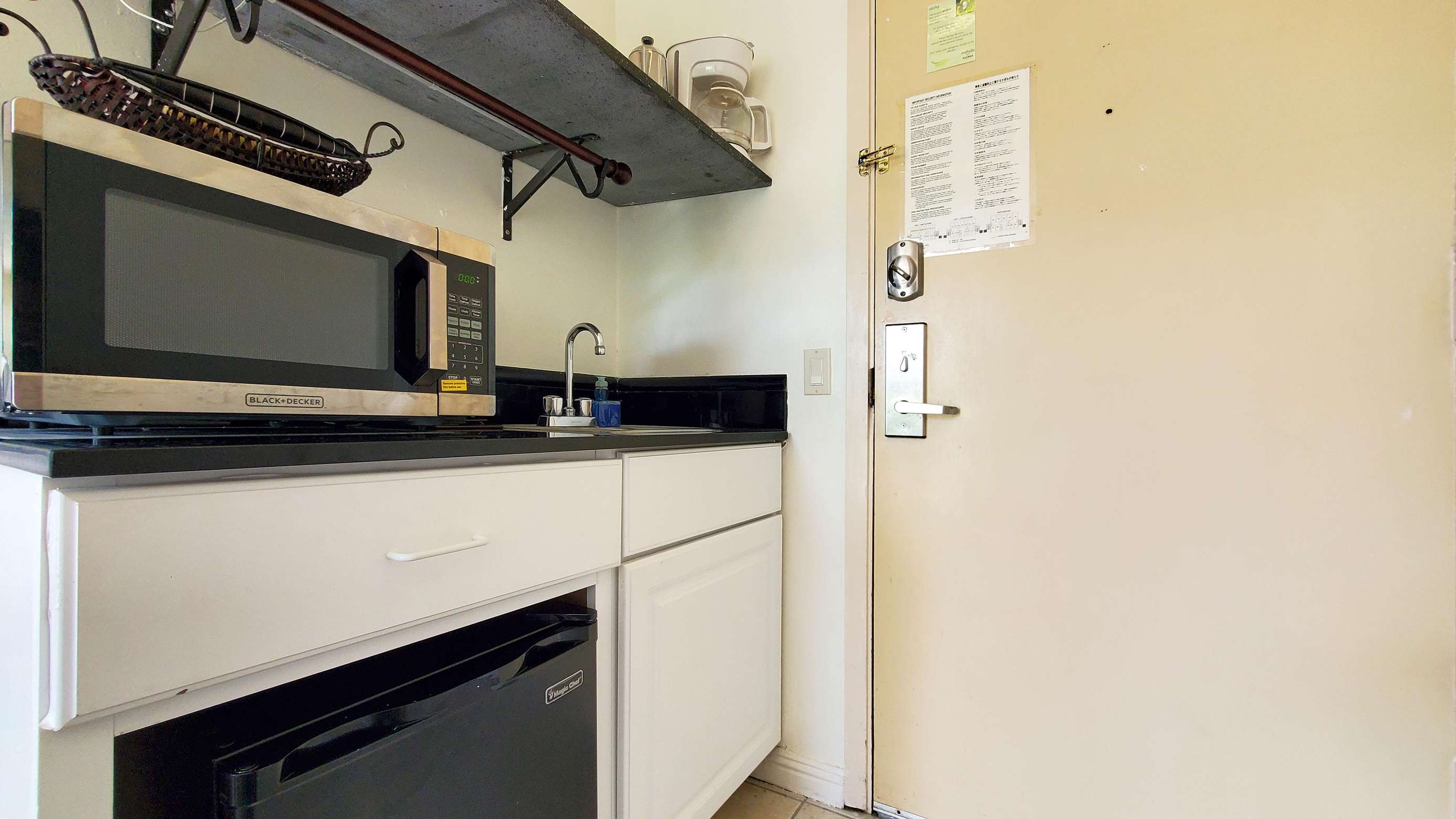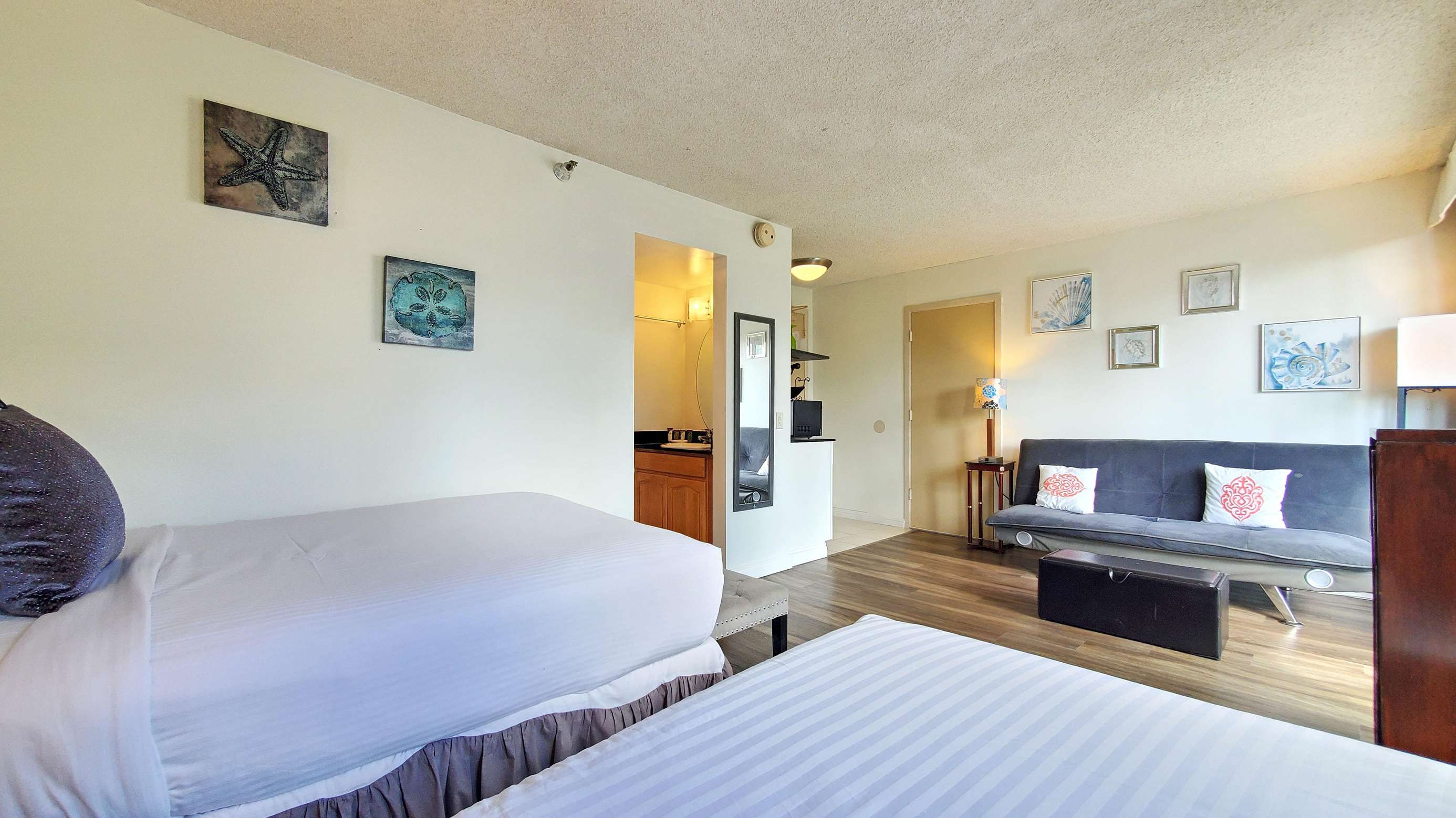 Unit has two full sized beds with a double size sleeper sofa. Kitchenette has a microwave, coffee maker, mini fridge, and kitchenware. Renovated bathroom with beautiful light fixtures, stand up shower, and closet to stow away clothing. Balcony views of the city.