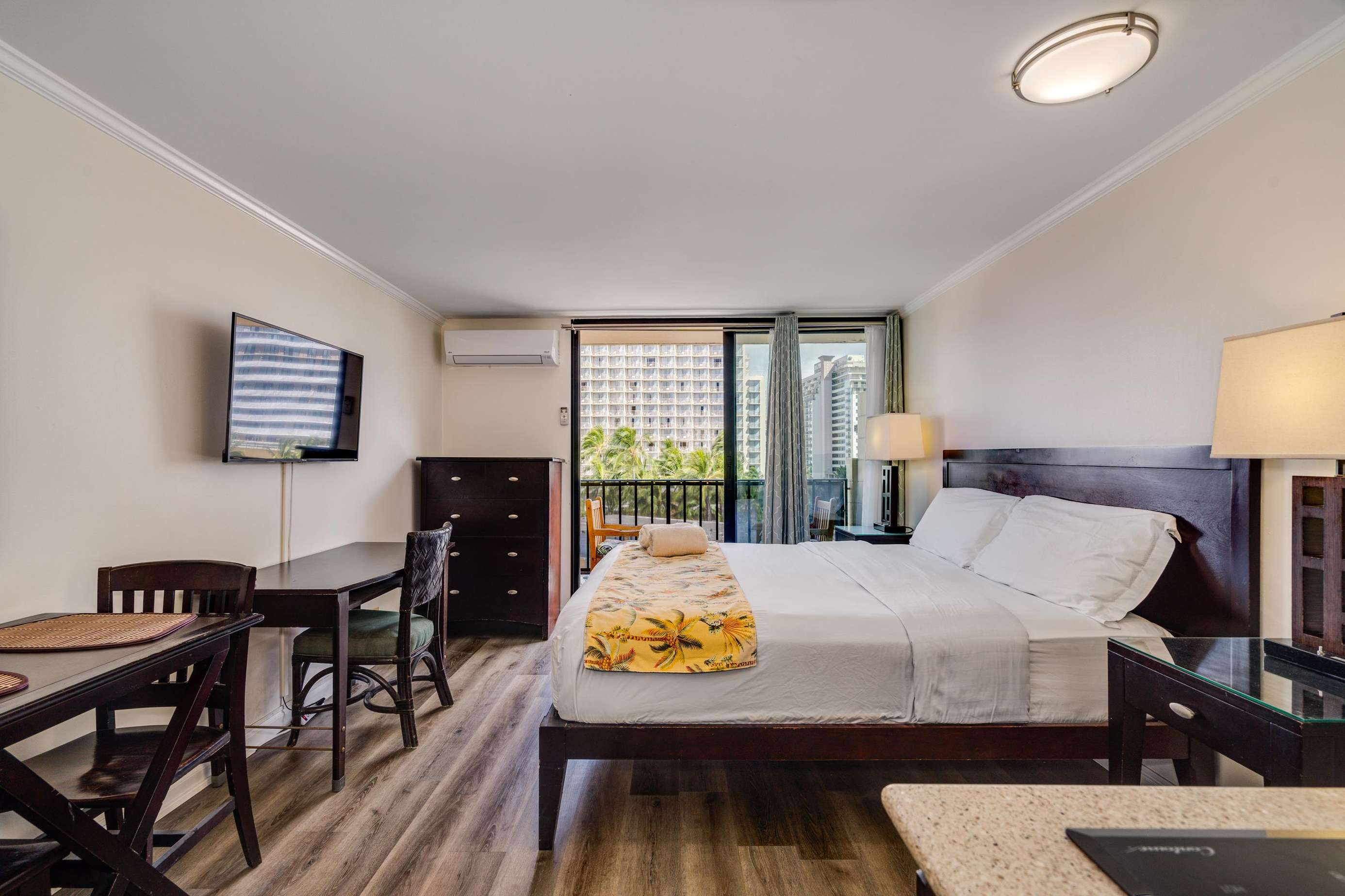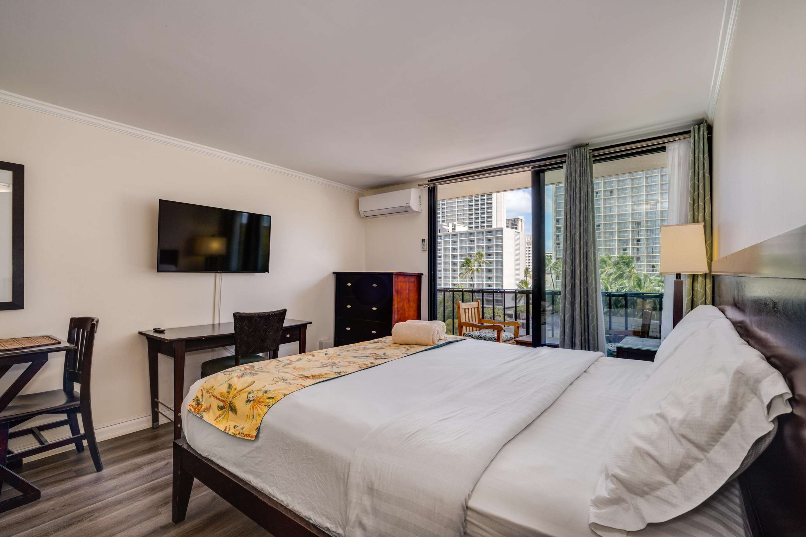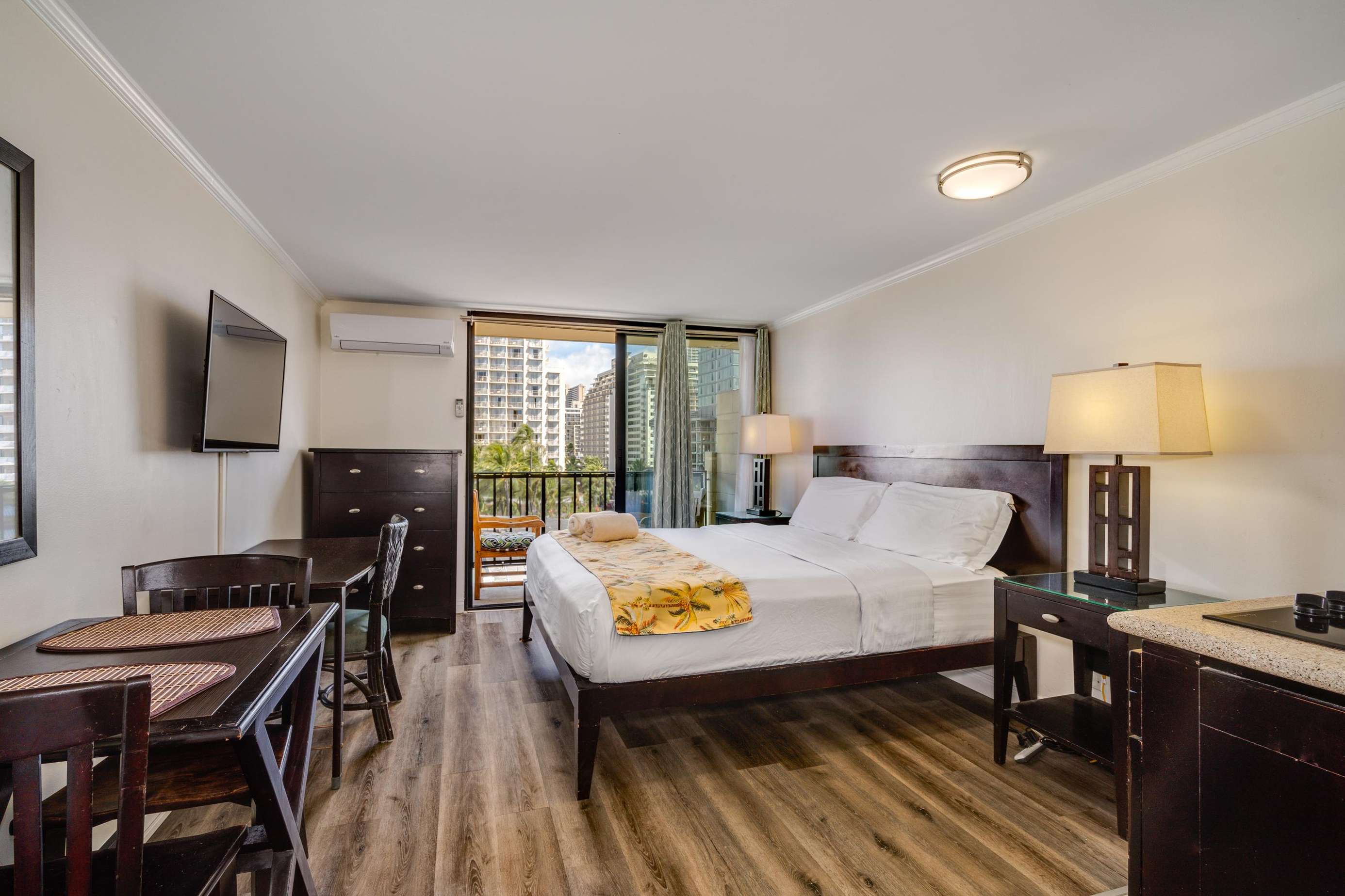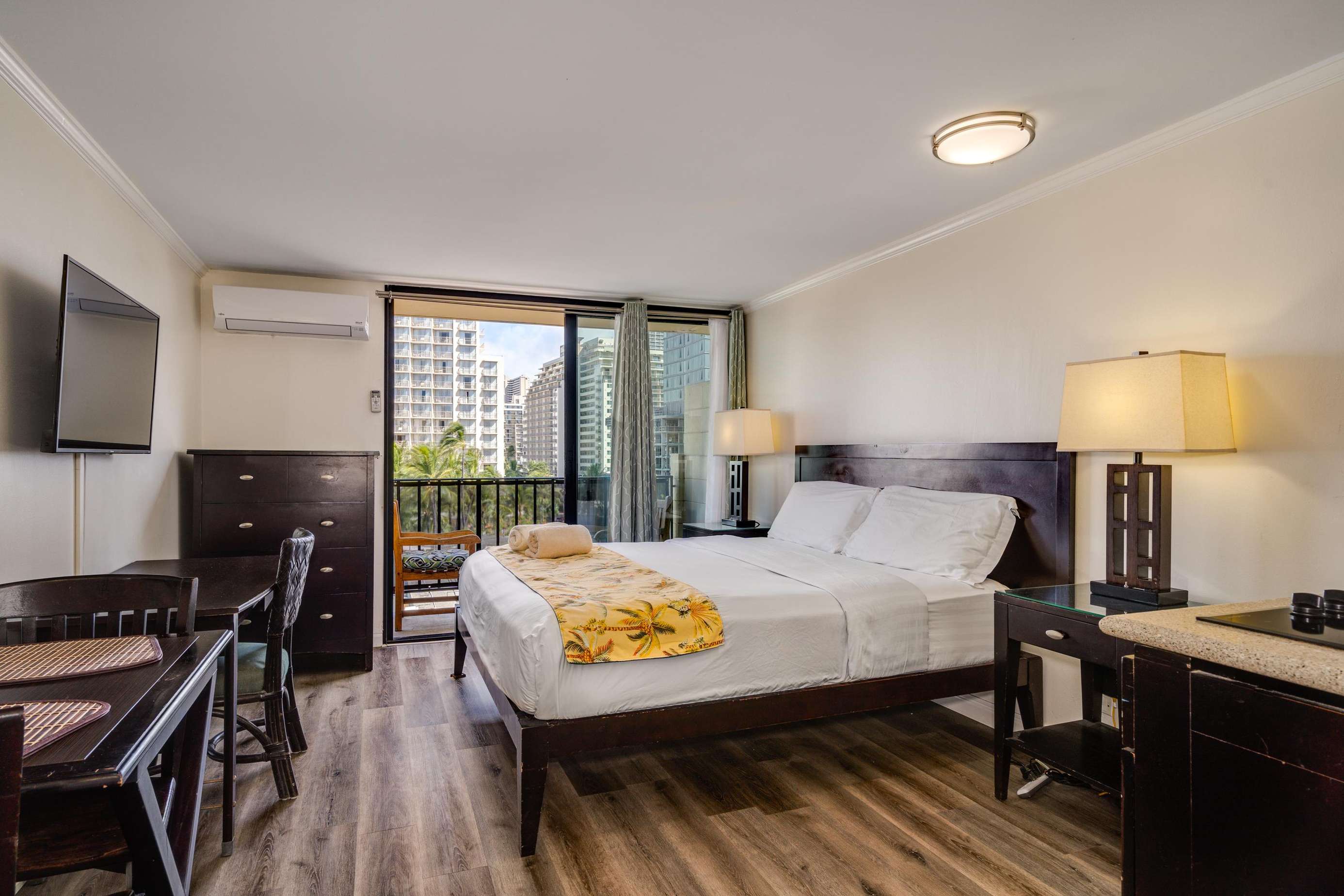 Enjoy the balcony for coffee in the morning and the wall mounted TV for the few times your not out enjoying everything Waikiki has to offer.