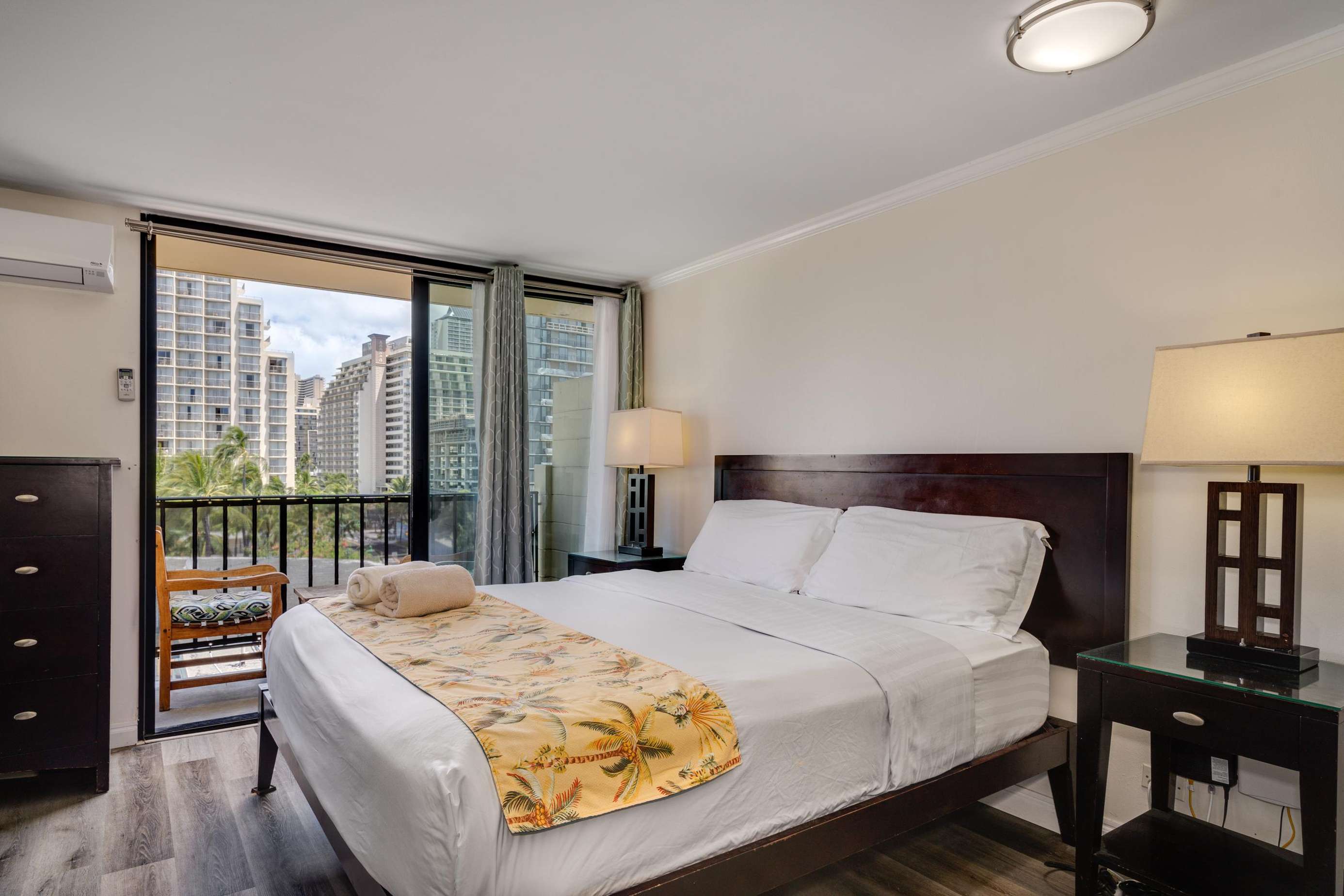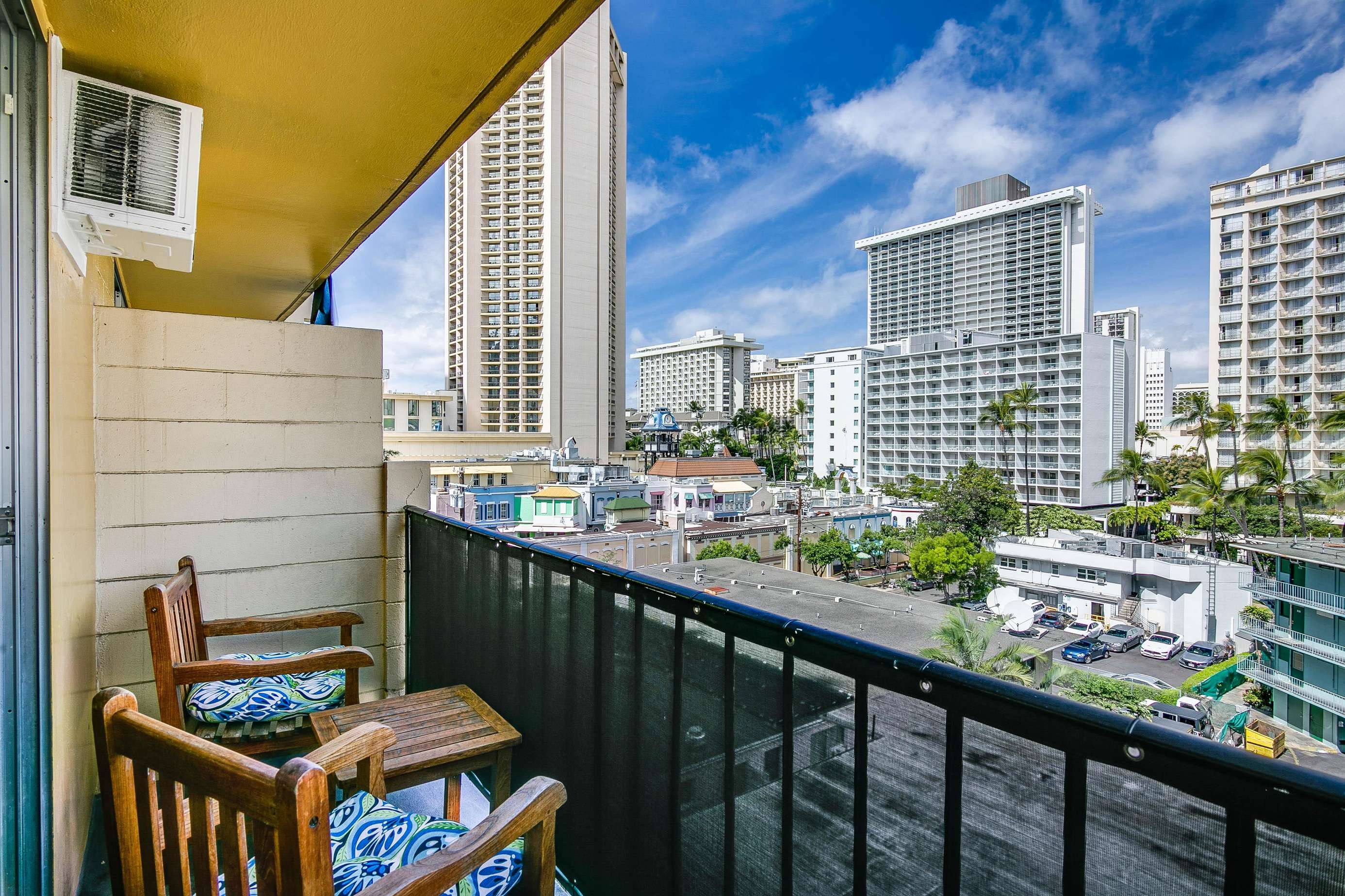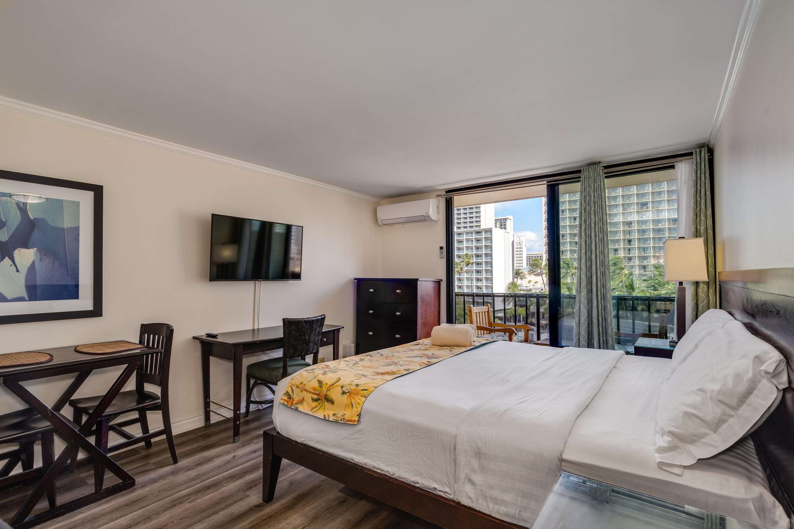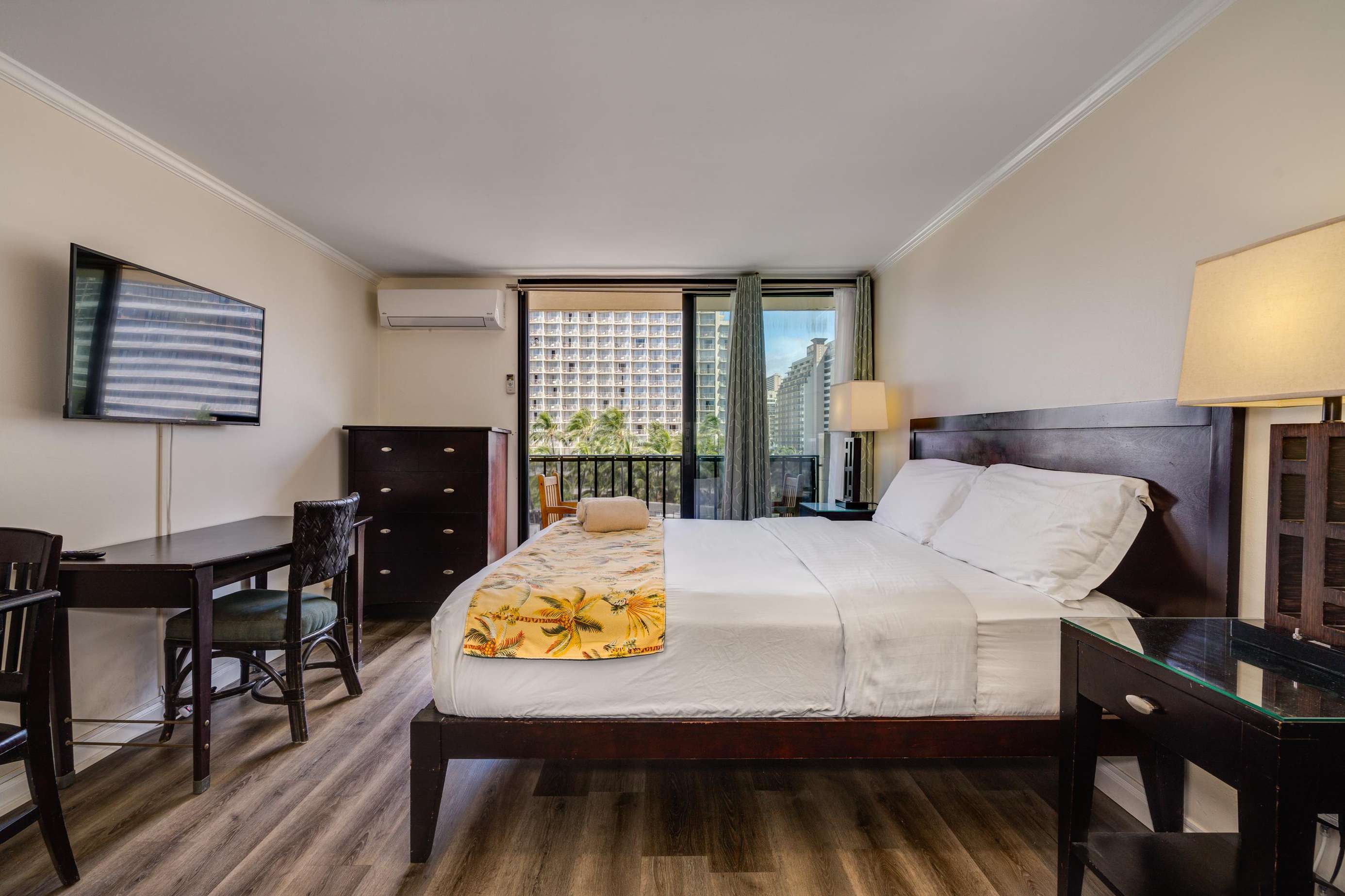 Enjoy the balcony for coffee in the morning and the wall mounted TV for the few times your not out enjoying everything Waikiki has to offer.