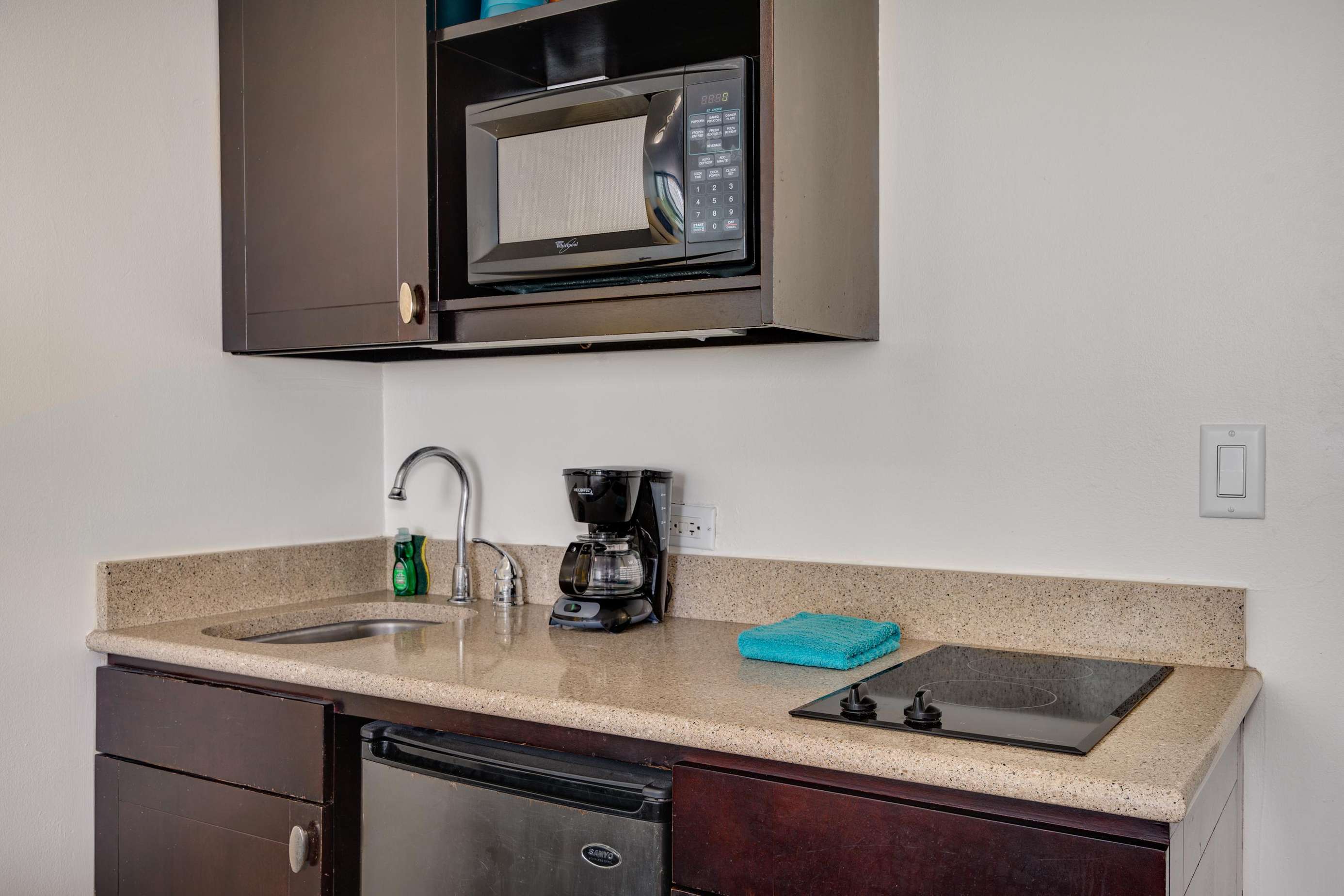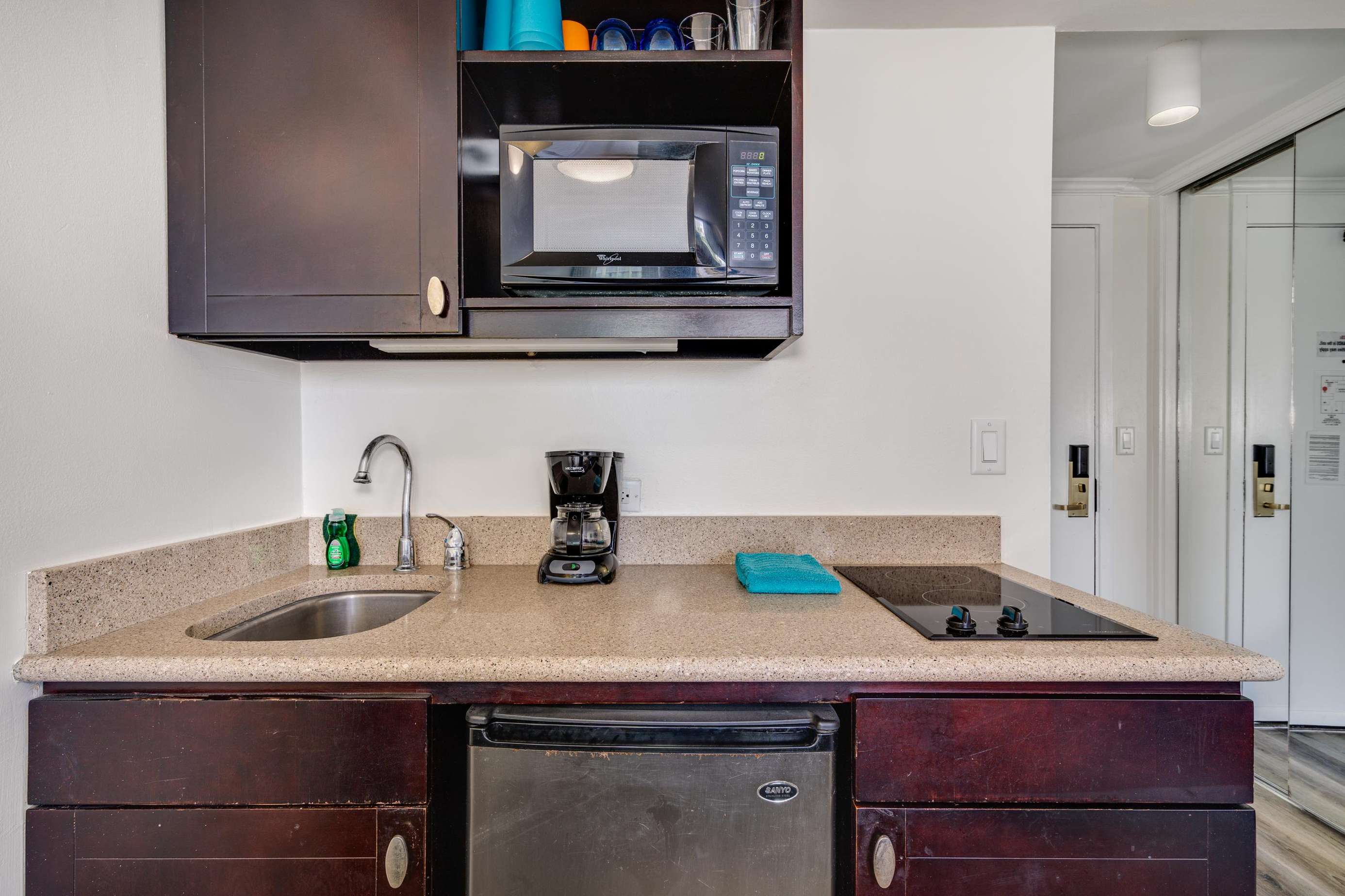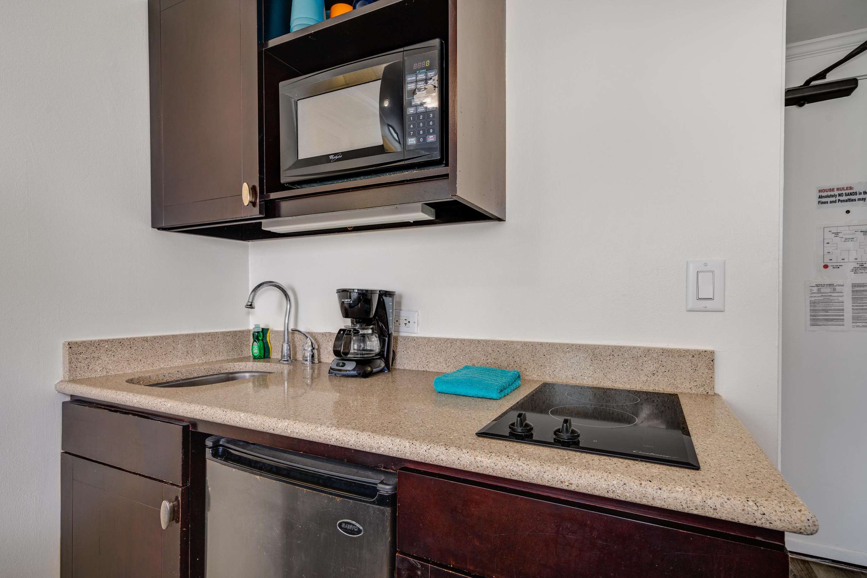 This studio suite is complete with a 2 burner cook-top, microwave, some kitchen prep tools, a coffeemaker, beach towels and a comfortable king size bed.