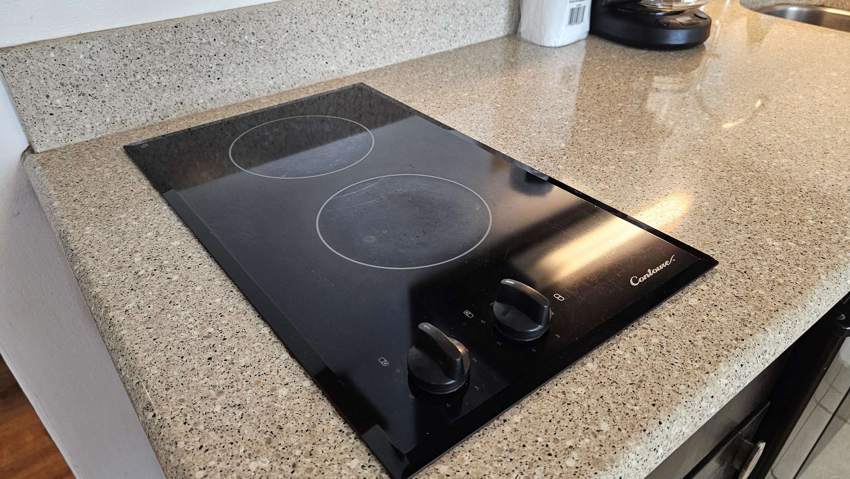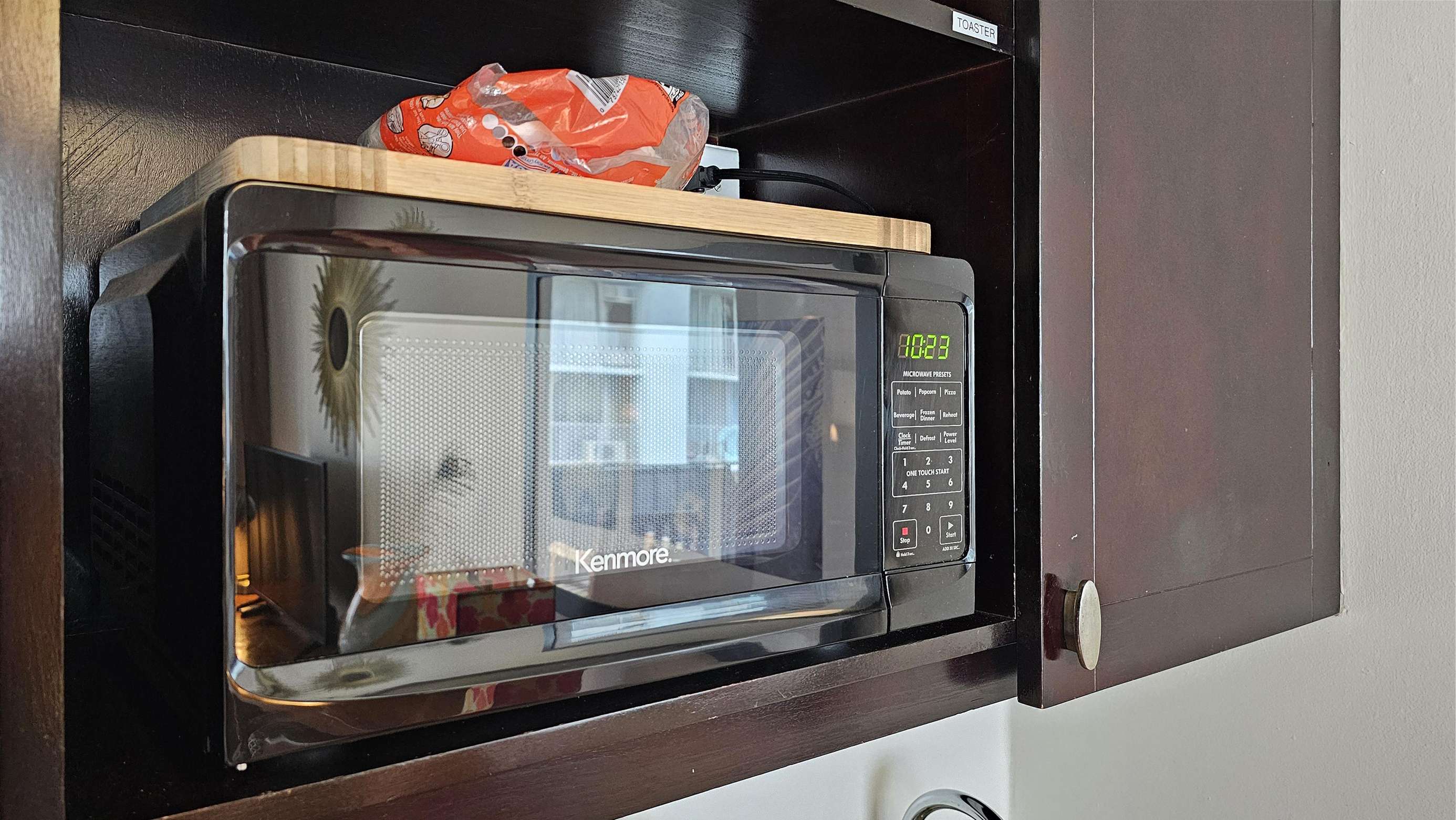 Queen bed, includes Kitchenette area with double Stovetop (including pots and pans), Microwave, Coffee maker, Toaster and a selection of dinner and silverware.