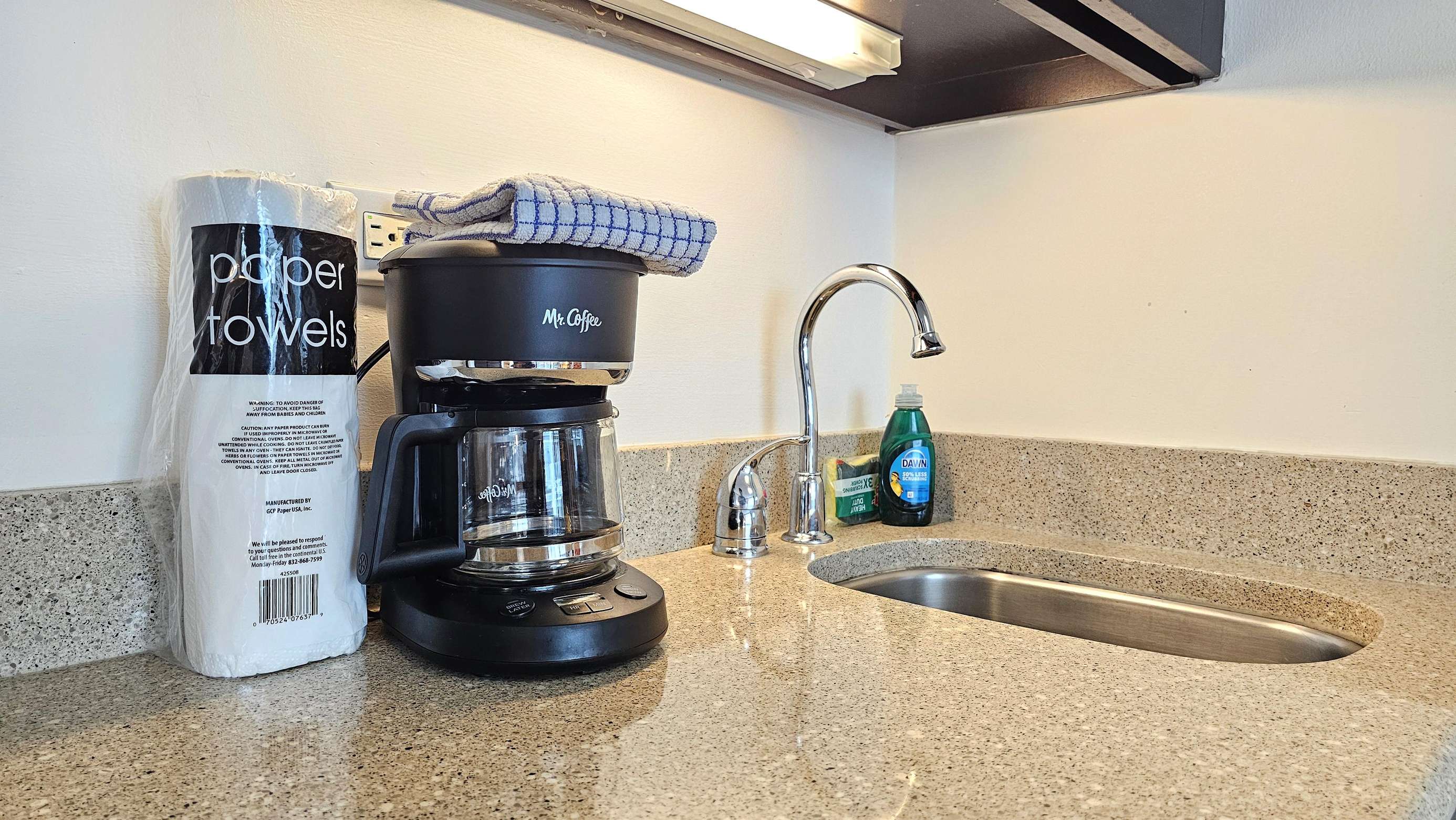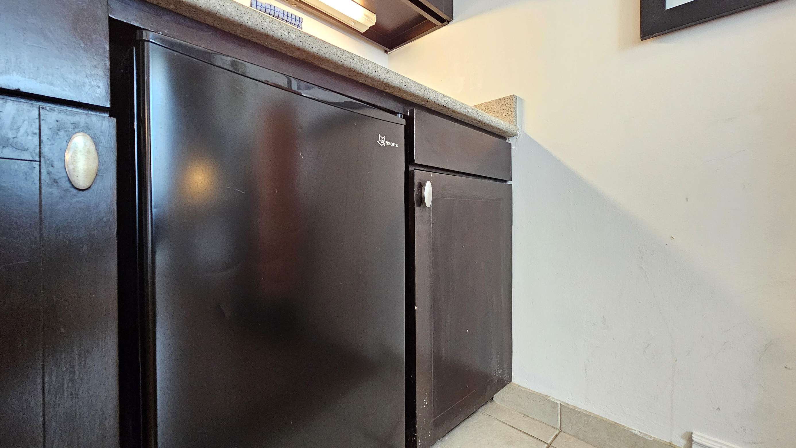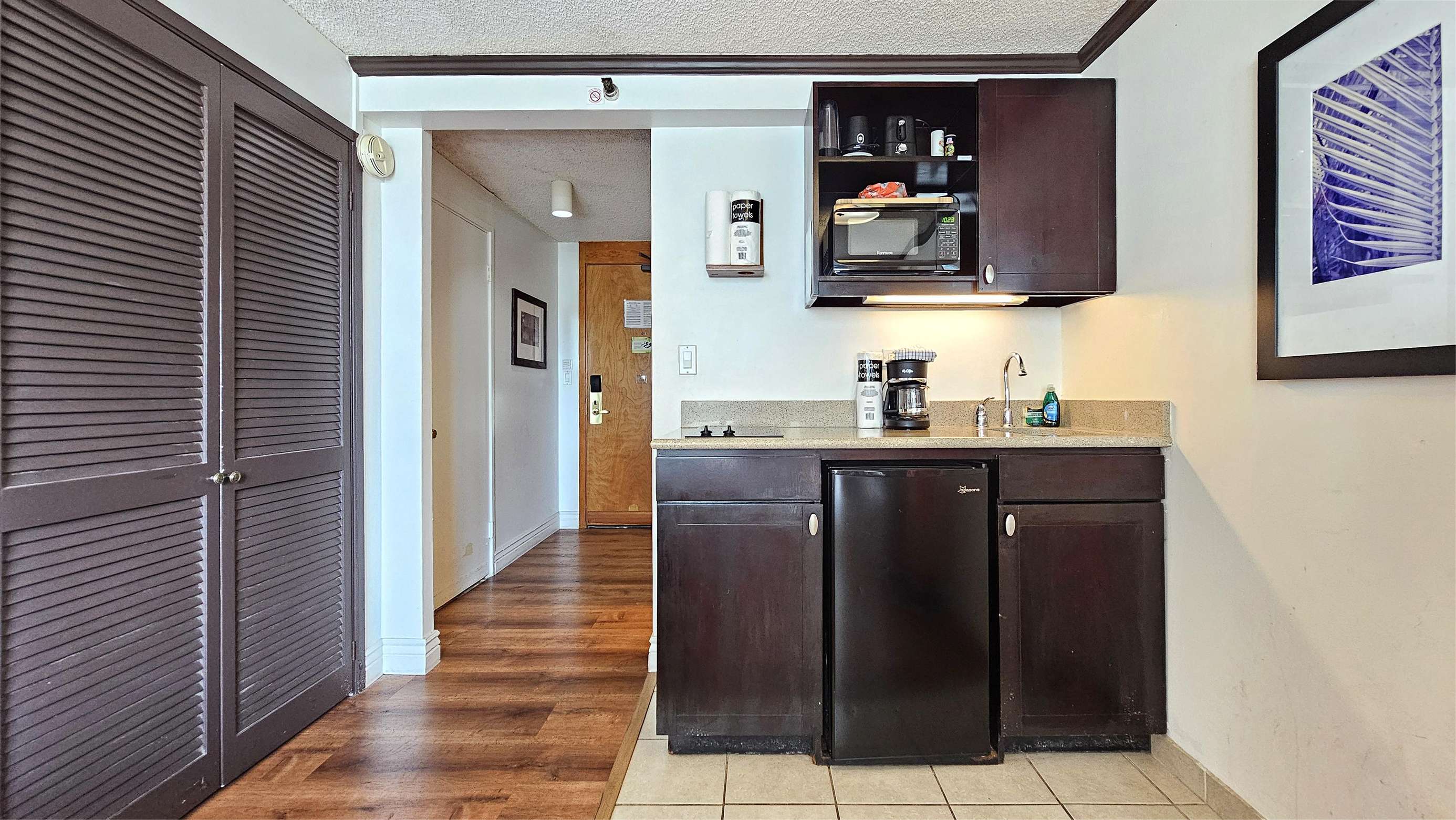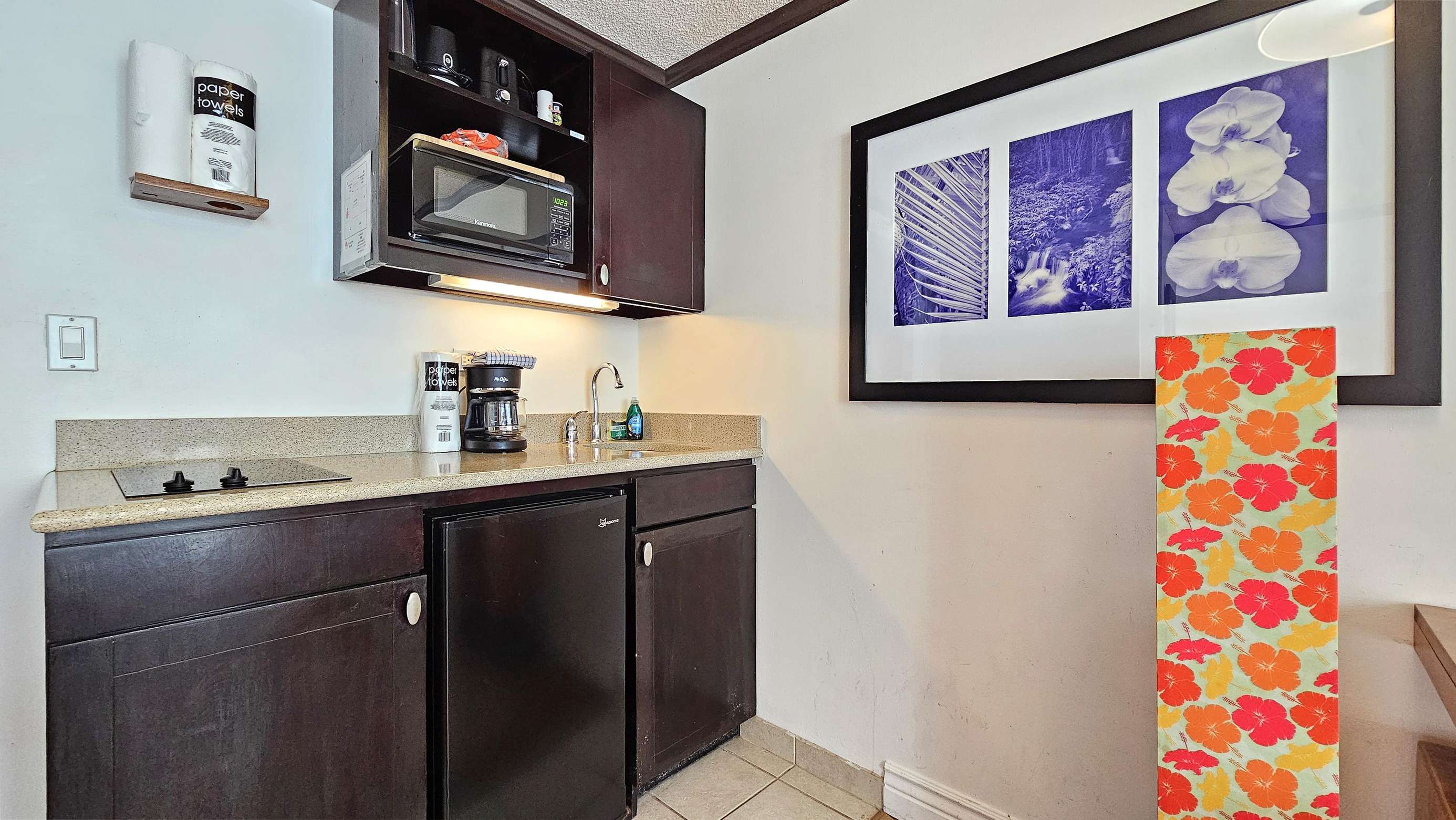 This studio suite is complete with a 2 burner cook-top, microwave, some kitchen prep tools, a coffeemaker, beach towels, beach chairs and a comfortable queen size bed.