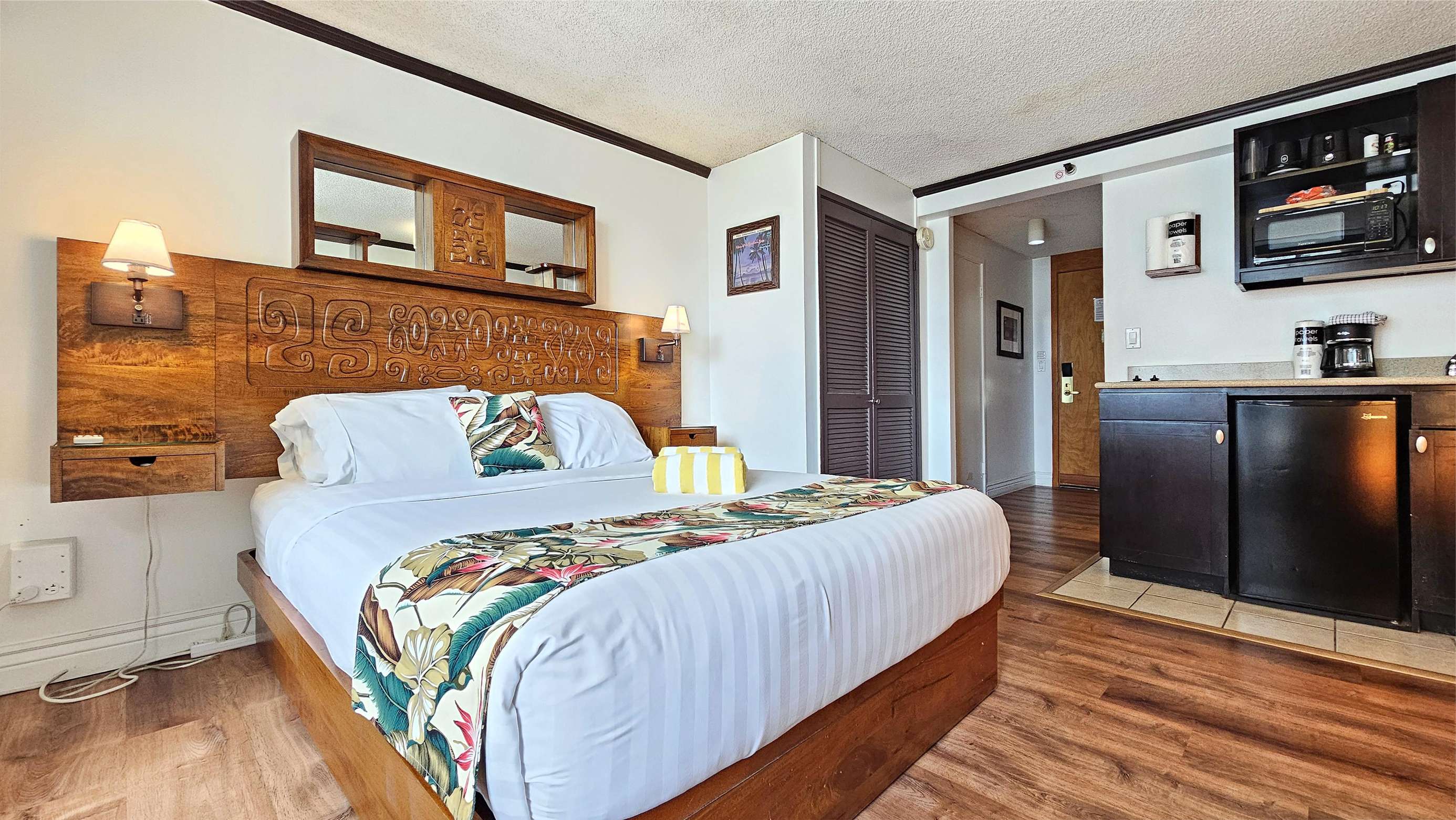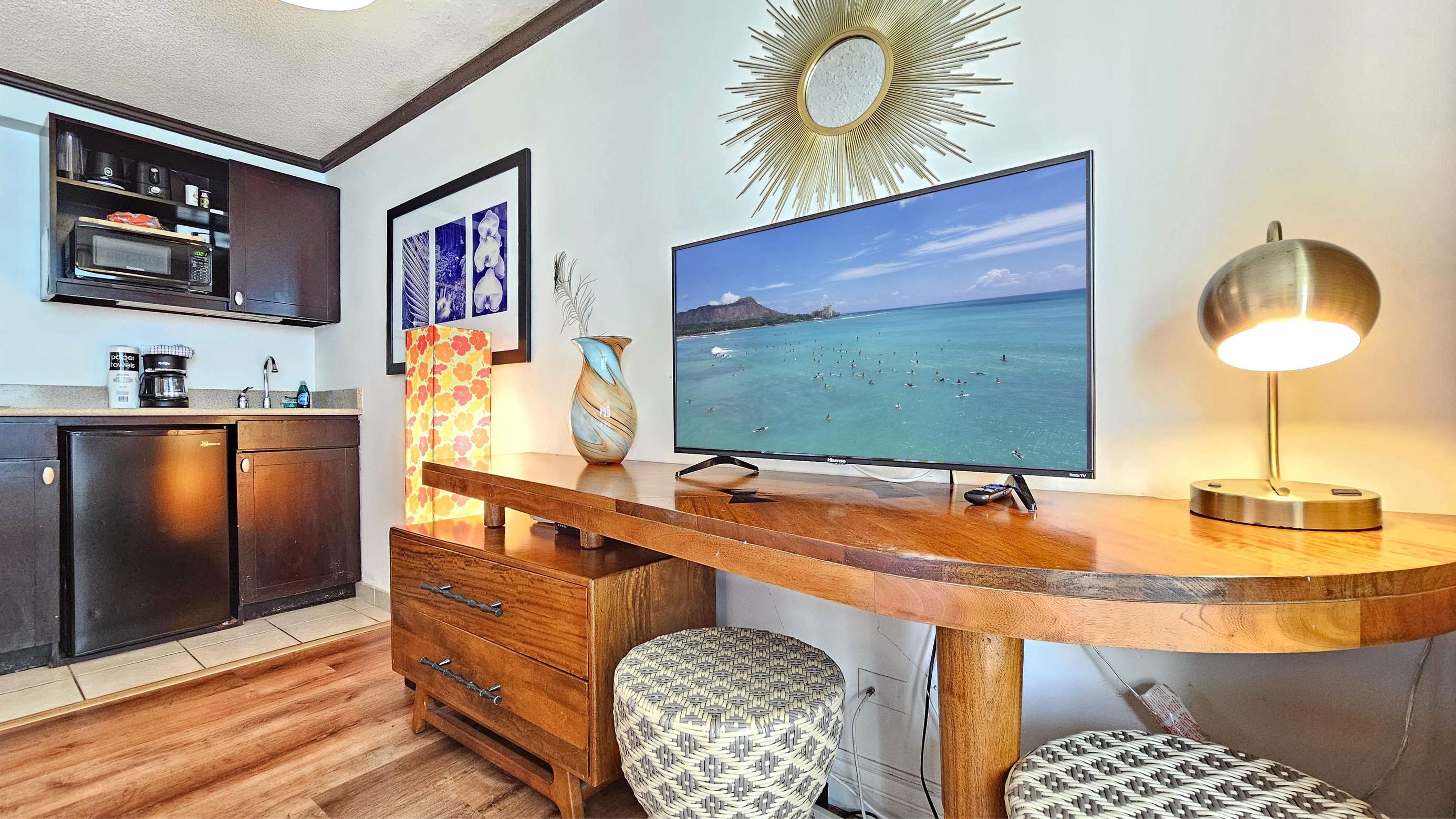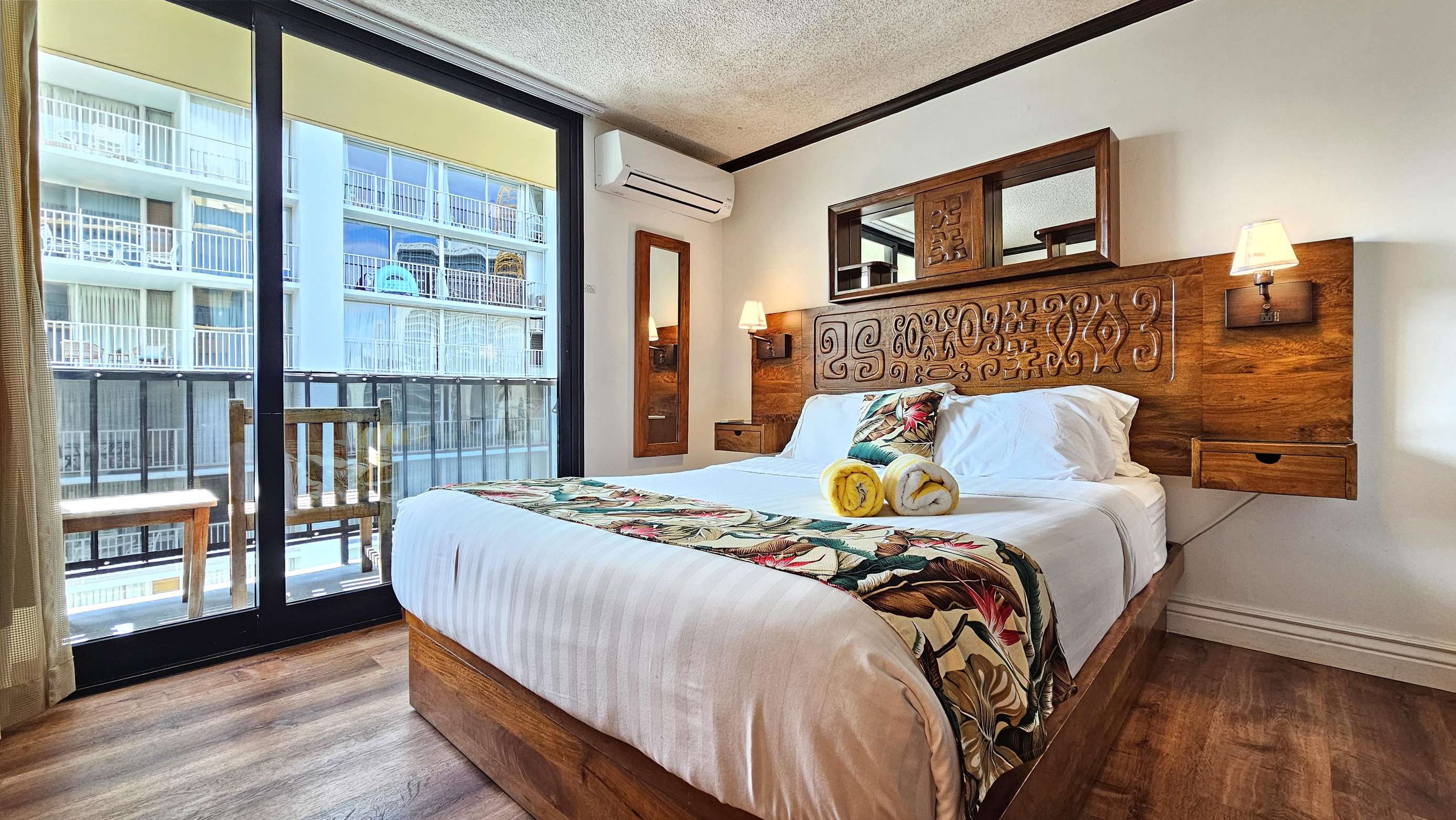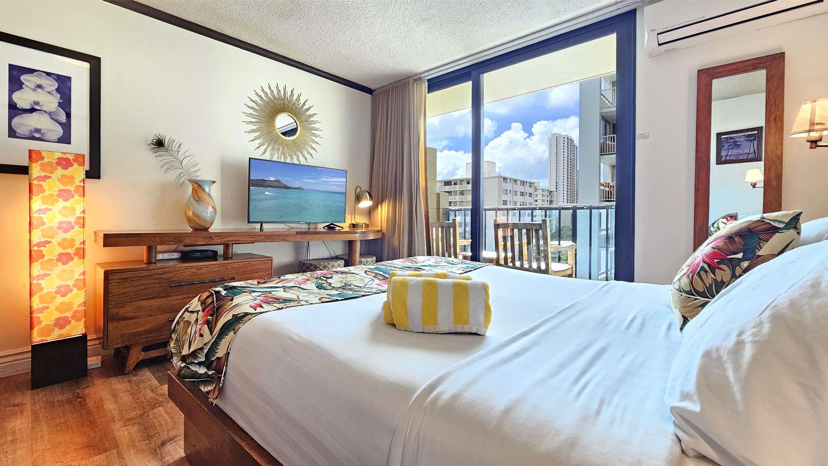Enjoy the balcony for coffee in the morning and the wall mounted TV for the few times your not out enjoying everything Waikiki has to offer.