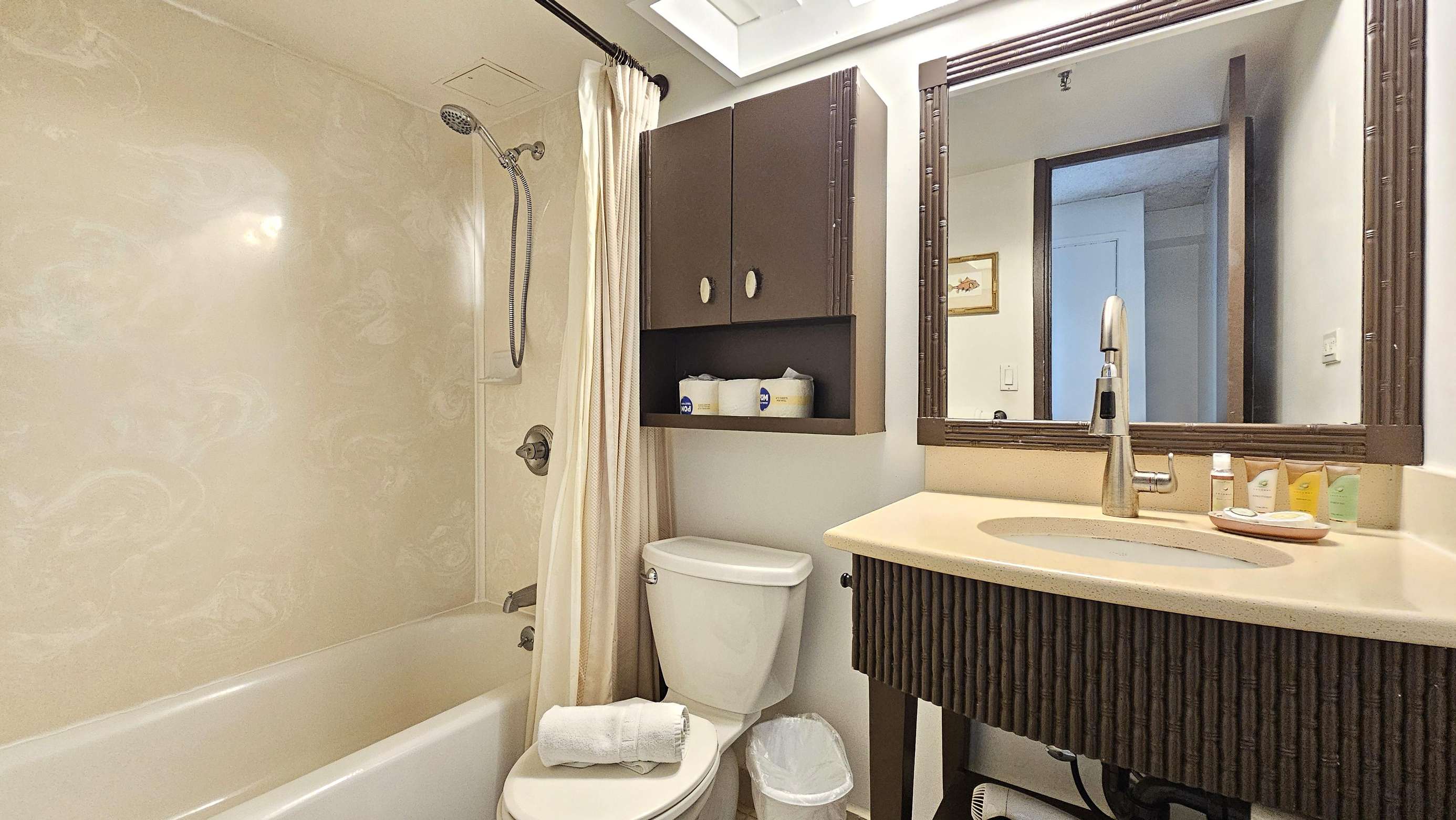 There's a Shower/Tub in the bathroom, it comes with your first couple of nights amenities (shampoo, soap etc.)- We have Beach gear including Towels, Boogie Board and snorkel gear.