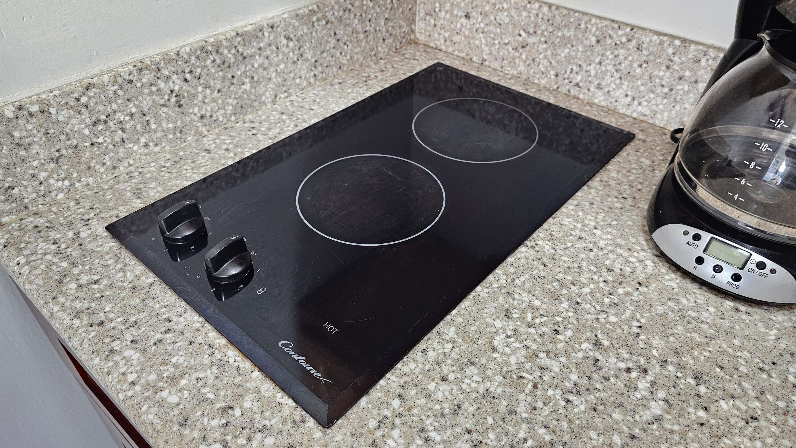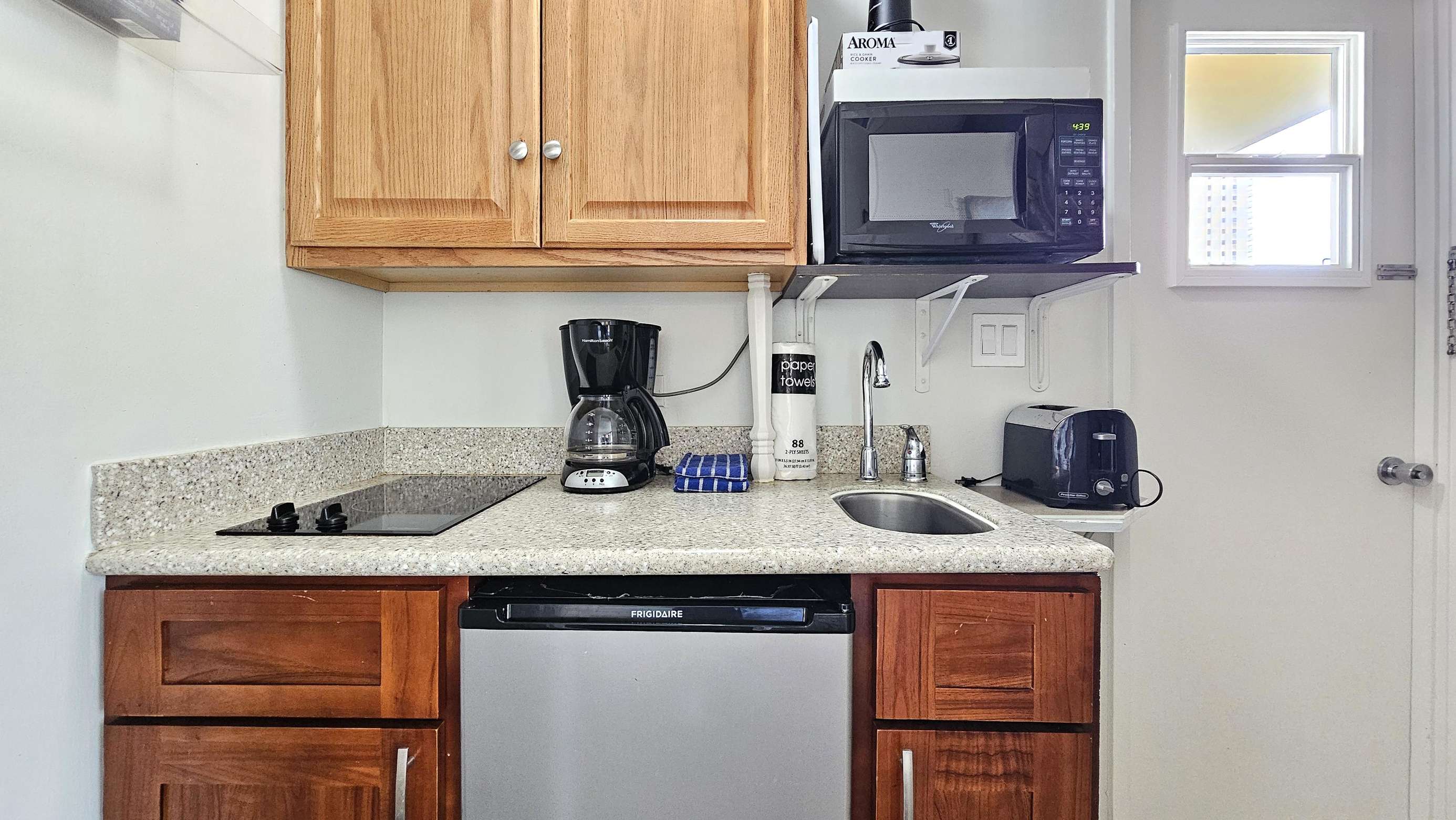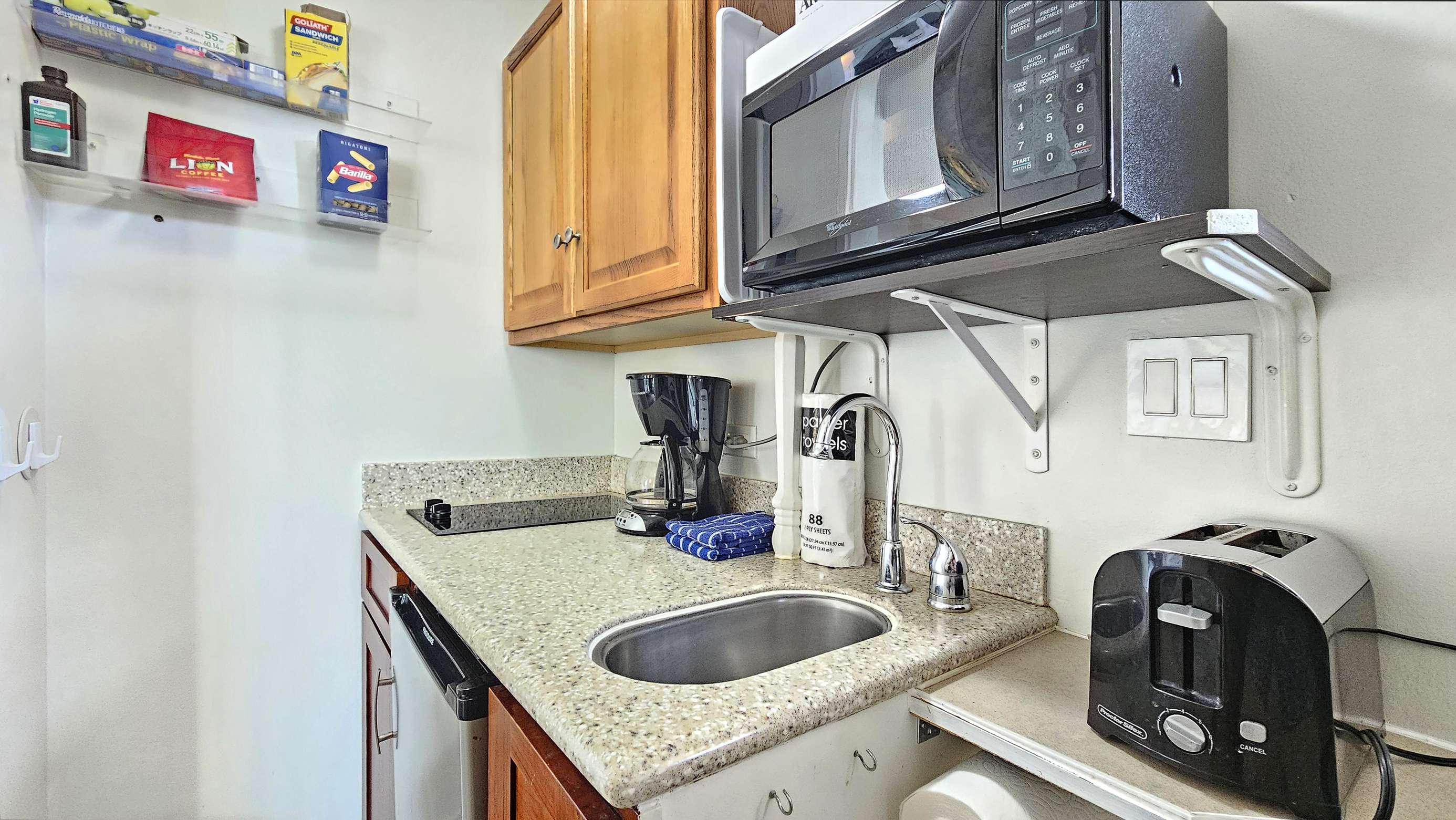 This comfortable queen size bed studio suite is complete with an induction cook top kitchenette, microwave, coffeemaker and small fridge. Enjoy panoramic views from two lanais overlooking the pool & city lights or relax in the bed with our HD TV and cable TV lineup. Staying comfortable won't be a problem with this unit's quiet Air Conditioning and comfortable mattress.