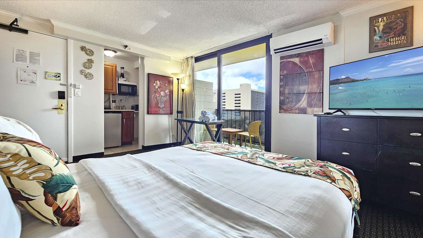 Enjoy the wall mounted HD TV from anywhere in the unit for the few times your not out enjoying everything Waikiki has to offer.