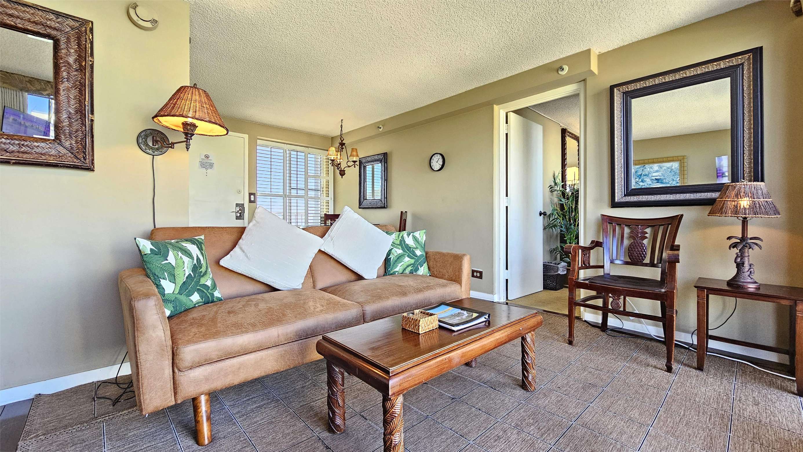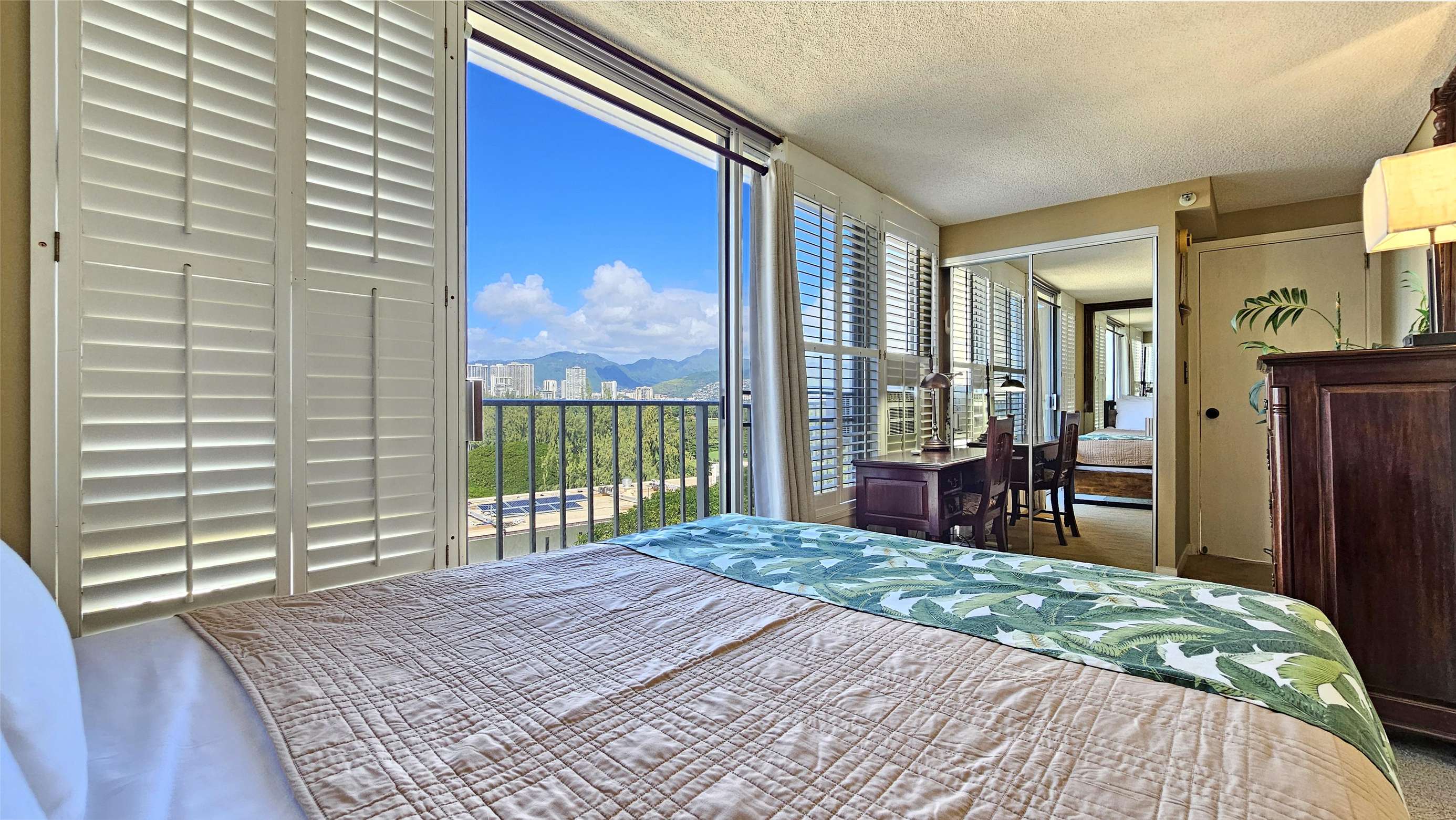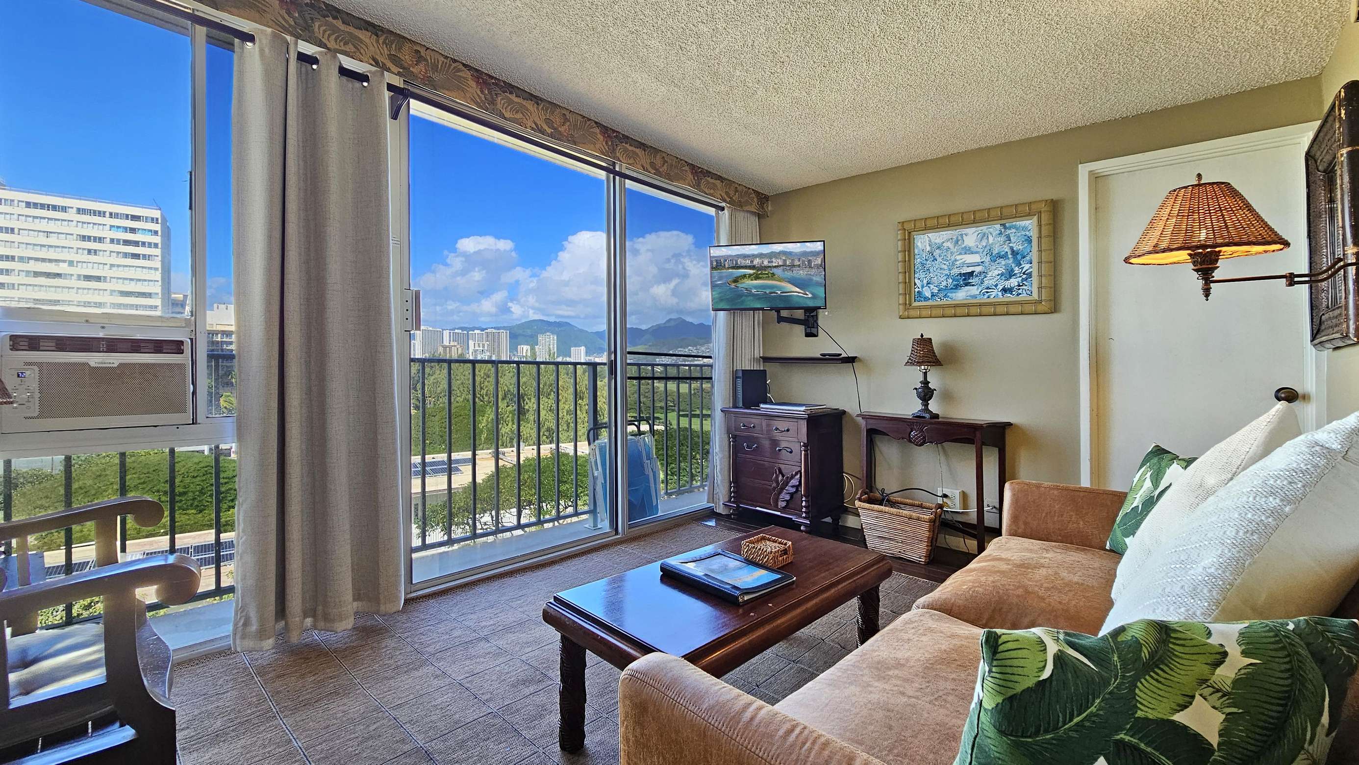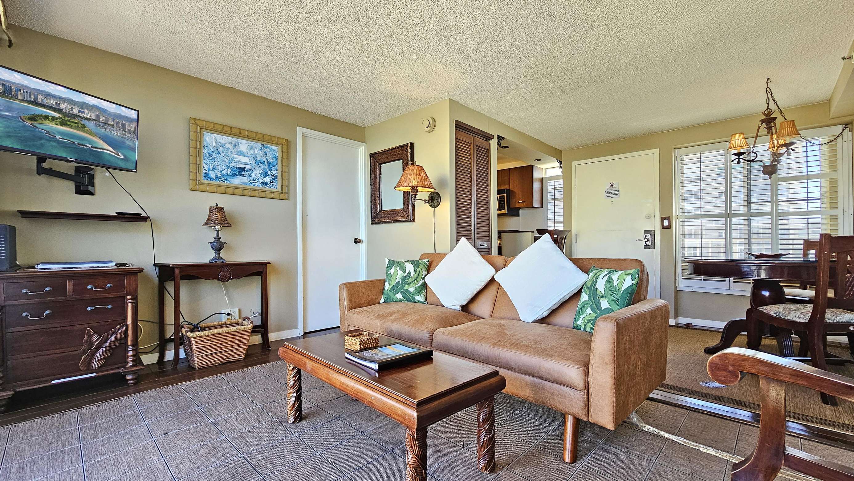 High Floor with Full Kitchen 'Residential' Suite. Look-out in either direction from main living room in this 1-Bedroom condo & see the surf as it breaks. Sit on the cushy sofa & gaze out at the ocean, cityscape, park, & mountains. The beautifully furnished, living room includes Indonesian, dark-wood, plantation-style furniture, flat screen TV & dining table for 2. Open the windows on each side of the unit for the trade winds. A unique feature of the building is that each floor is only one unit wide, so getting a cooling cross breeze is accomplished by opening windows on each side of the unit.