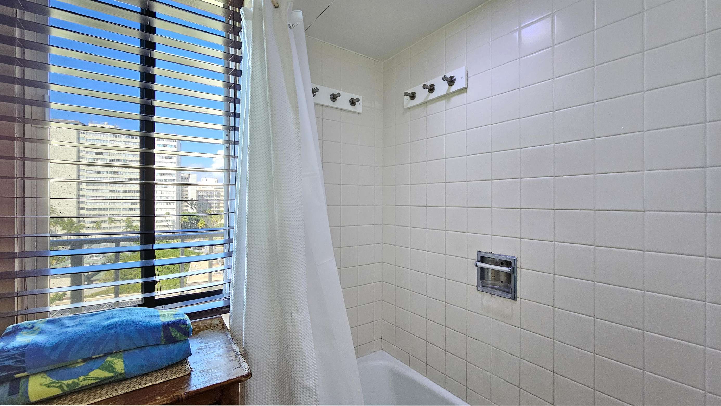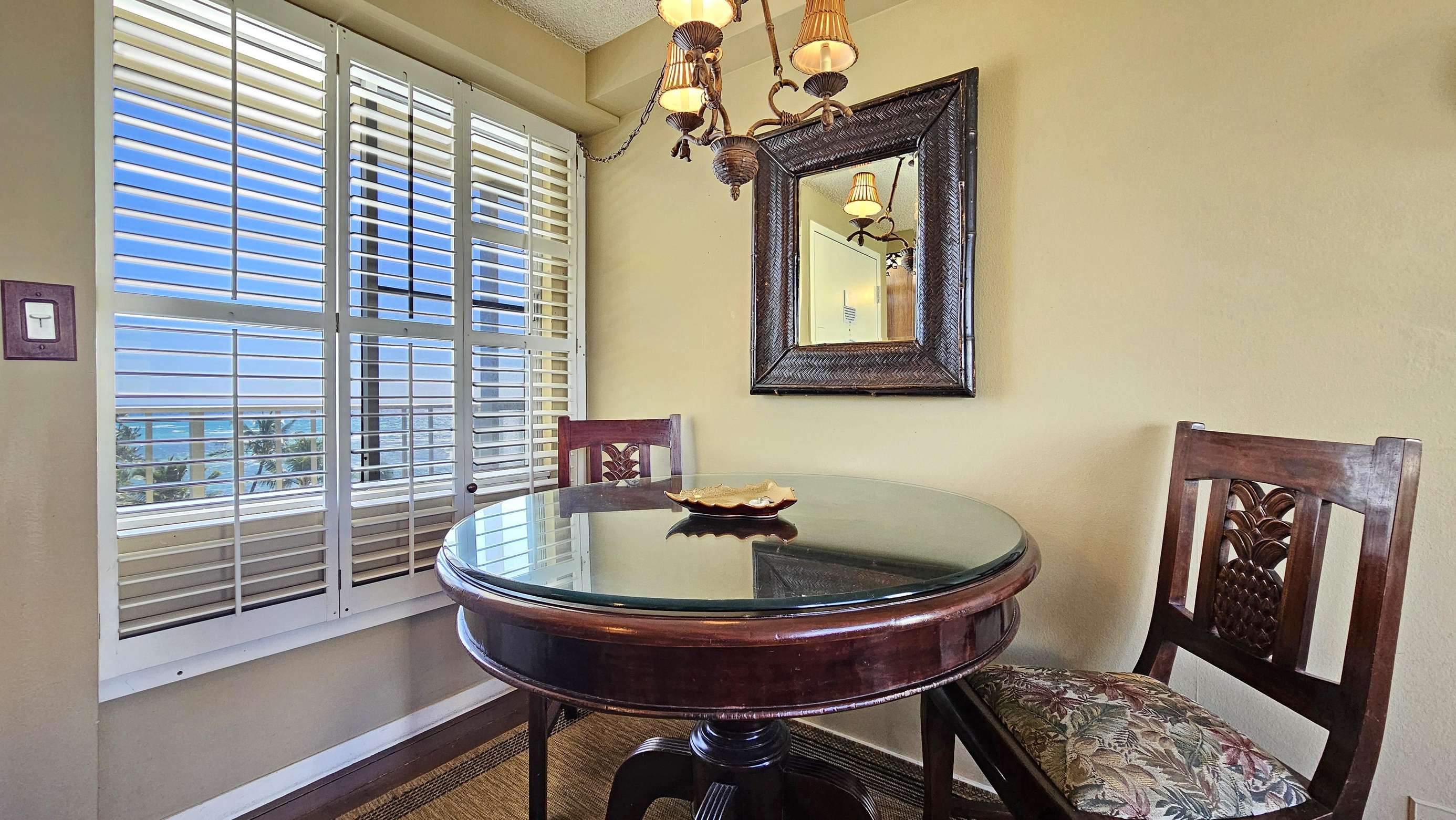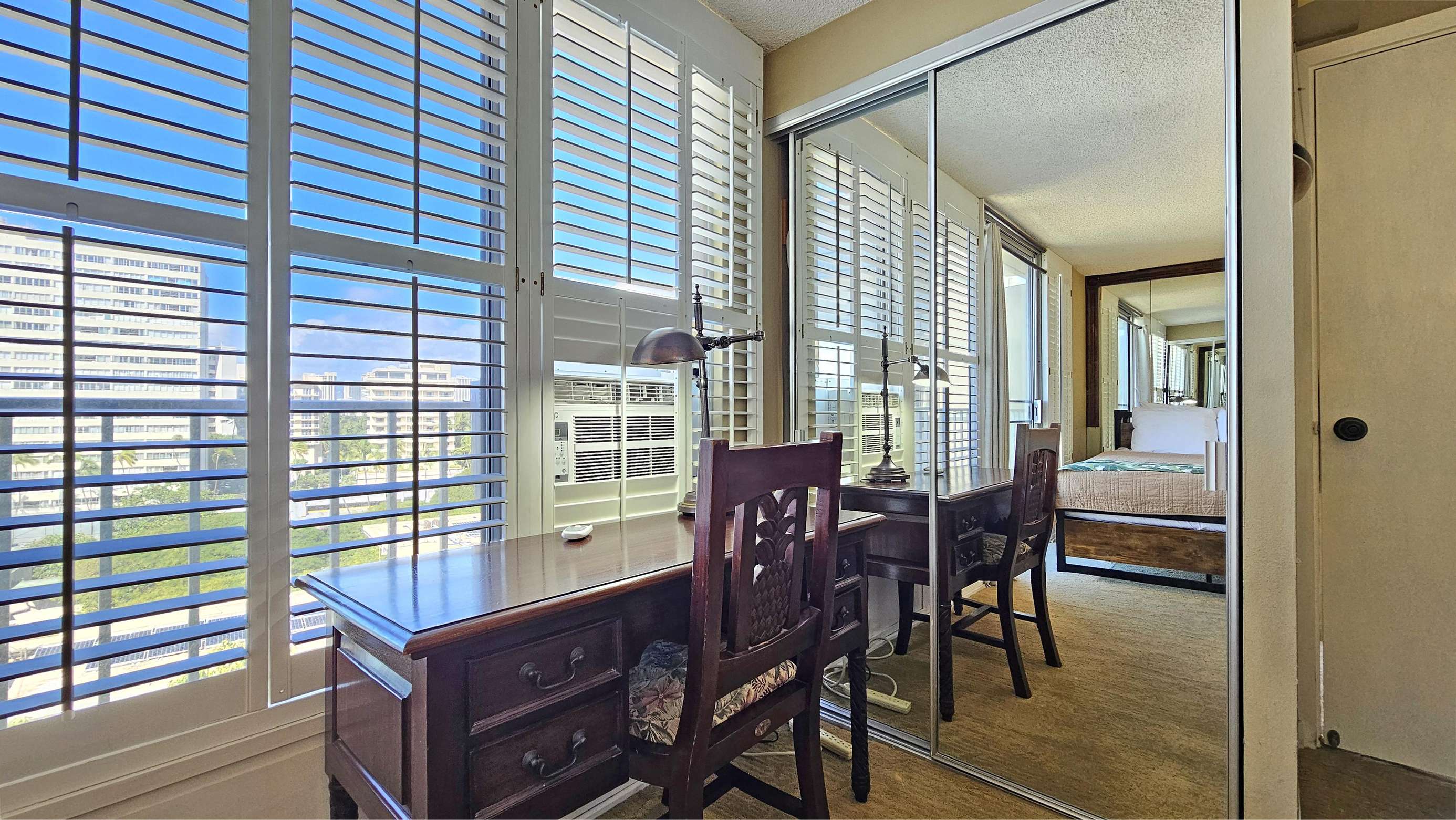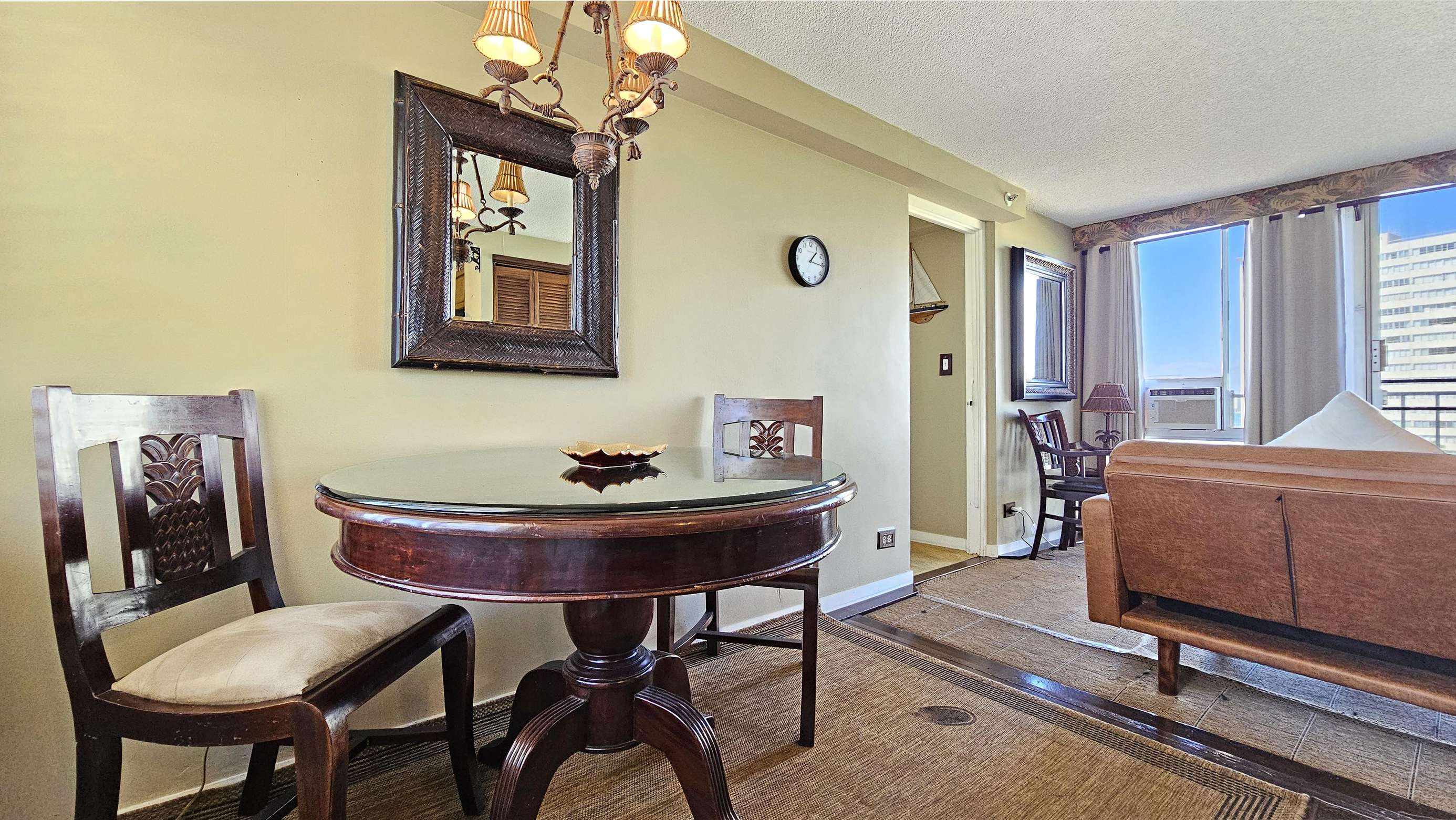 High Floor with Full Kitchen 'Residential' Suite. Look-out in either direction from main living room in this 1-Bedroom condo & see the surf as it breaks. Sit on the cushy sofa & gaze out at the ocean, cityscape, park, & mountains. The beautifully furnished, living room includes Indonesian, dark-wood, plantation-style furniture, flat screen TV & dining table for 2. Open the windows on each side of the unit for the trade winds. A unique feature of the building is that each floor is only one unit wide, so getting a cooling cross breeze is accomplished by opening windows on each side of the unit.