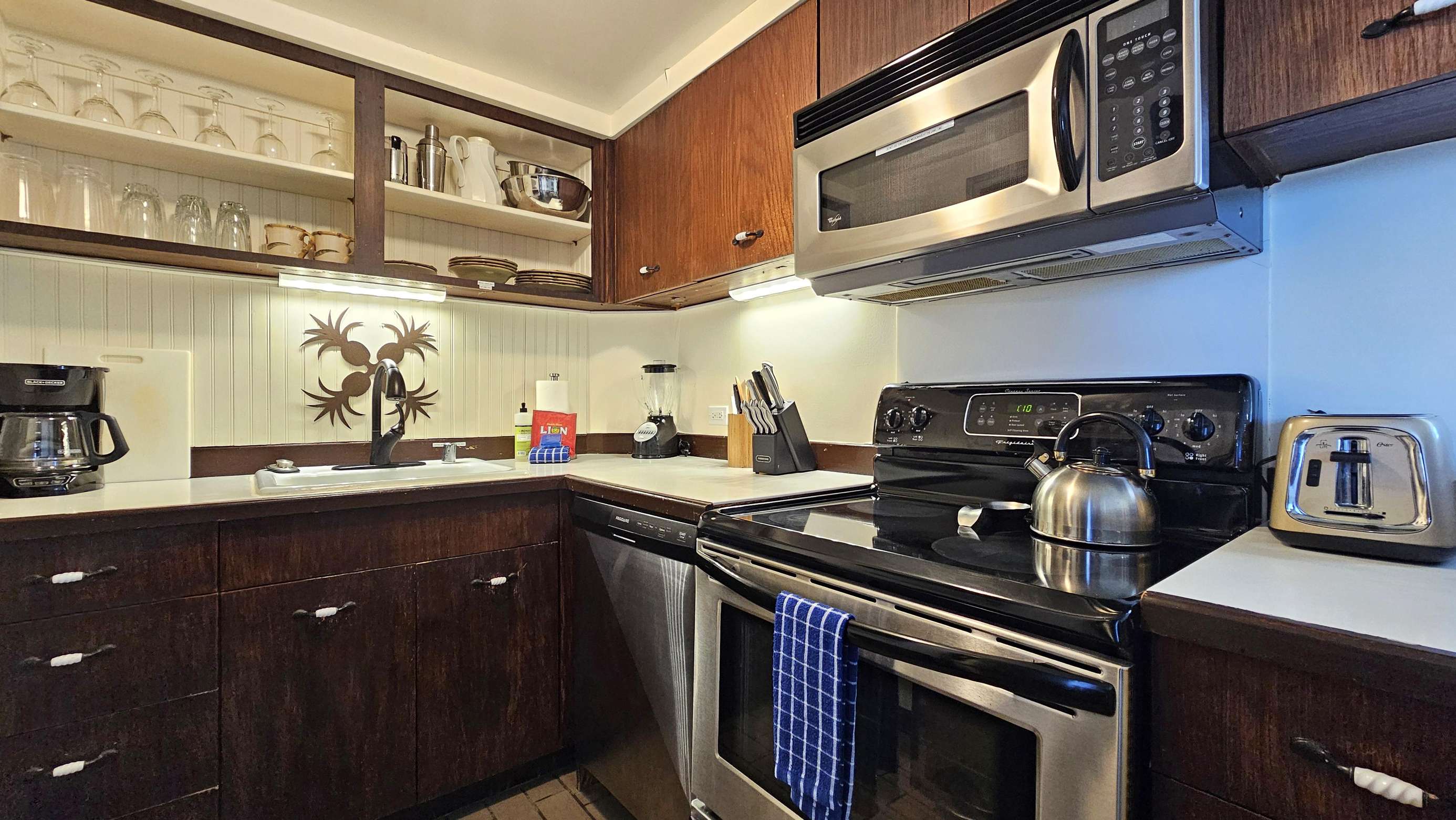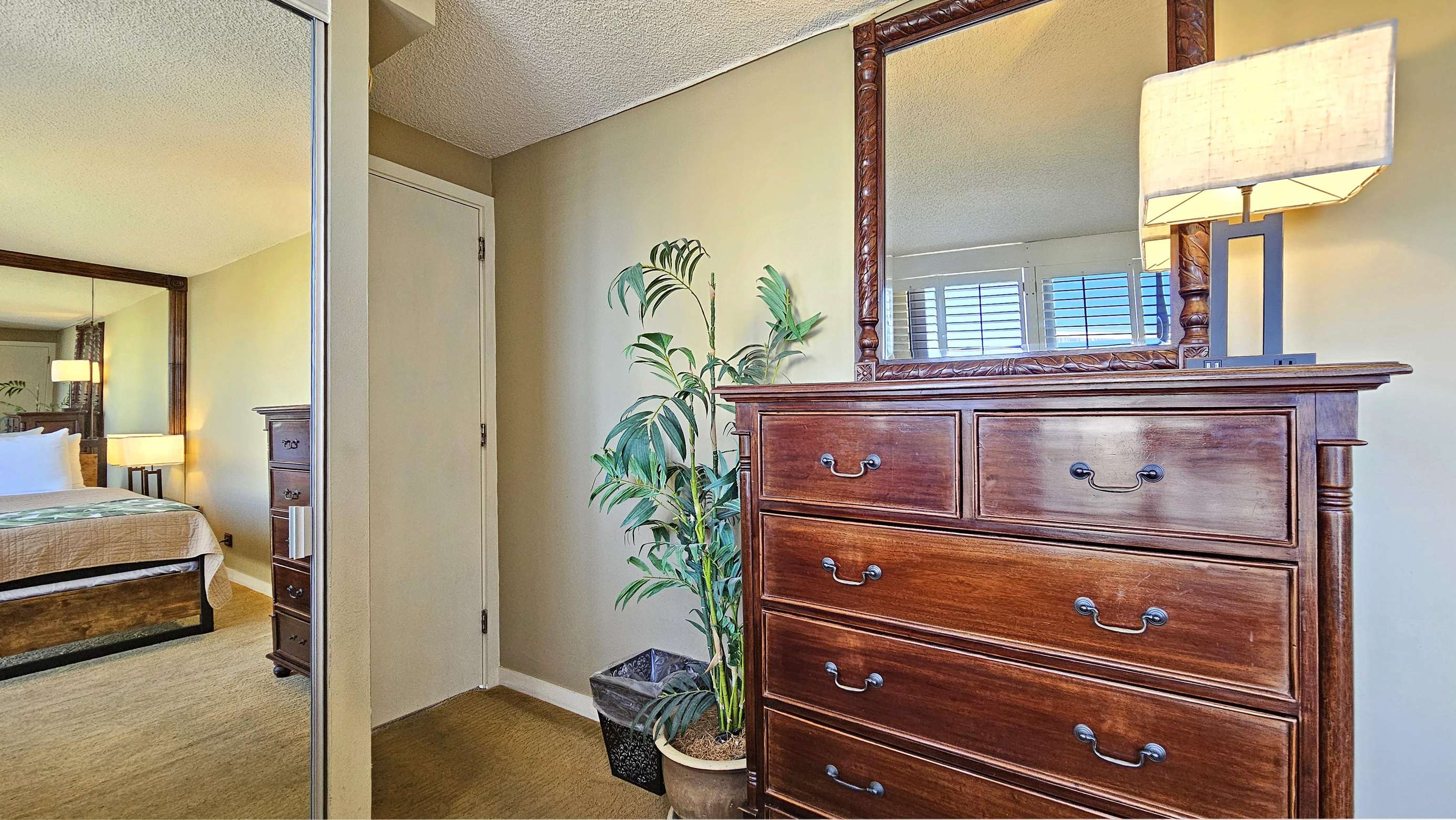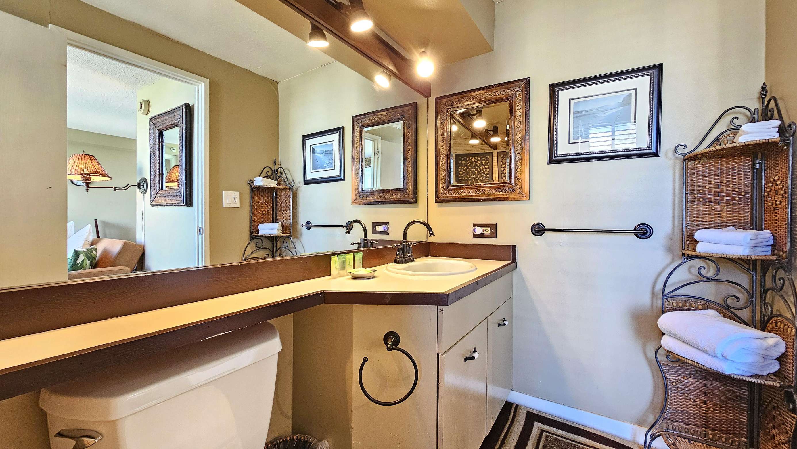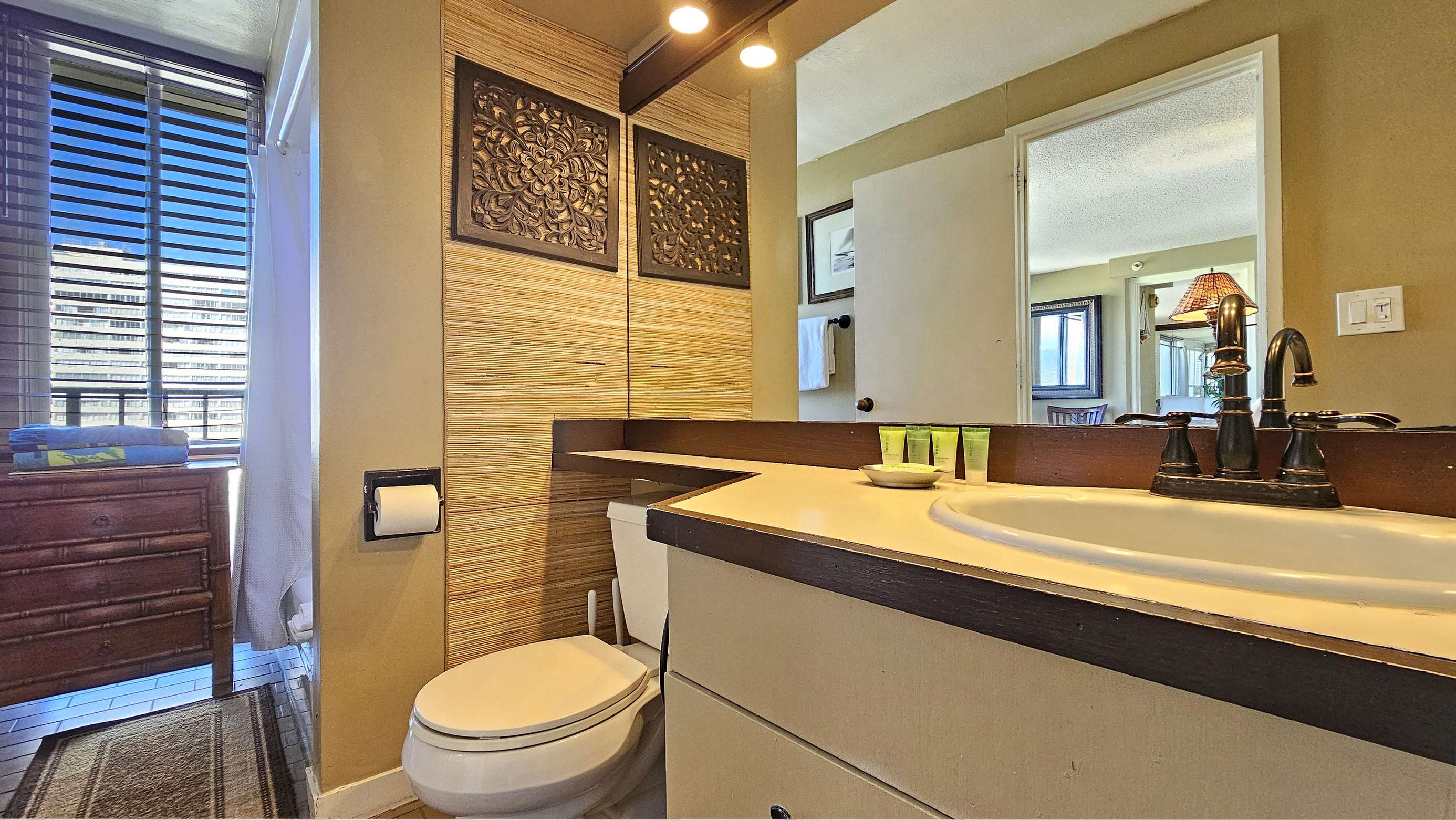 High Floor with Full Kitchen 'Residential' Suite. Look-out in either direction from main living room in this 1-Bedroom condo & see the surf as it breaks. Sit on the cushy sofa & gaze out at the ocean, cityscape, park, & mountains. The beautifully furnished, living room includes Indonesian, dark-wood, plantation-style furniture, flat screen TV & dining table for 2. Open the windows on each side of the unit for the trade winds. A unique feature of the building is that each floor is only one unit wide, so getting a cooling cross breeze is accomplished by opening windows on each side of the unit.