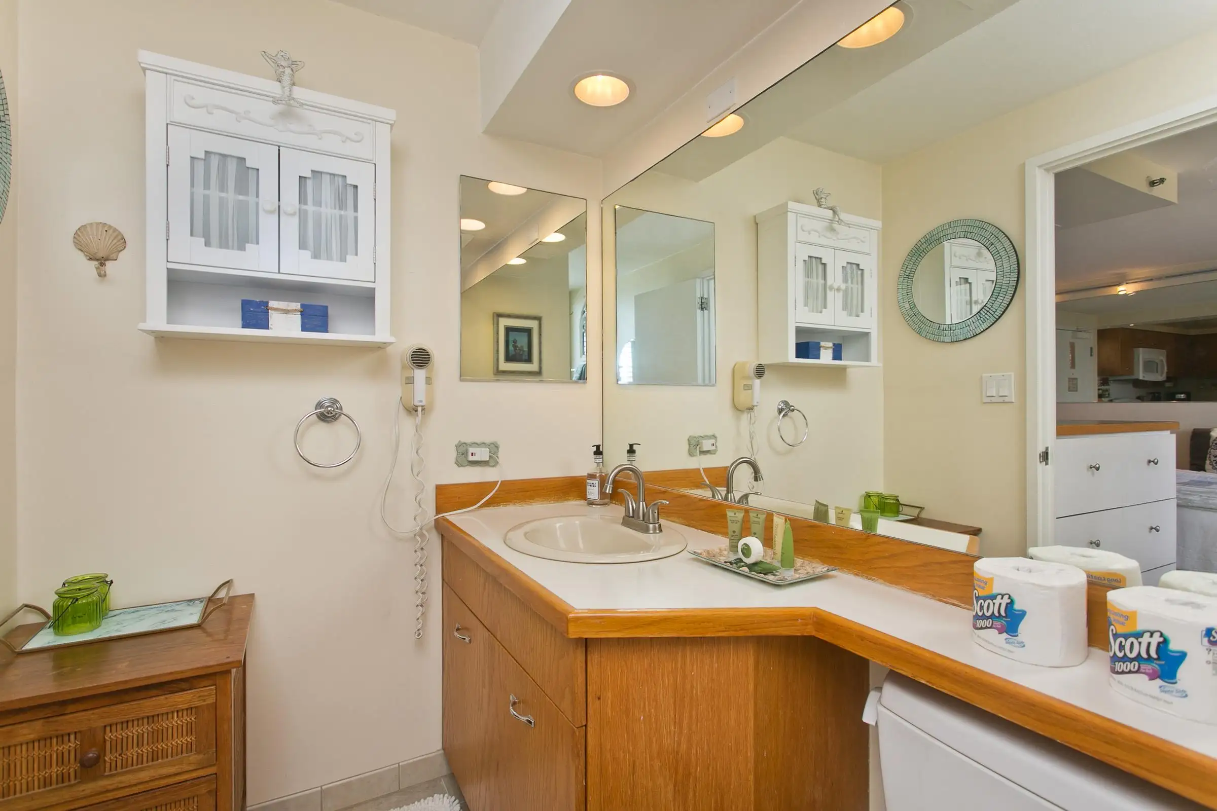 Condo has ocean views from both large windows and you can enjoy the great ocean trade winds from the open lanai while you view the beautiful ocean views.
