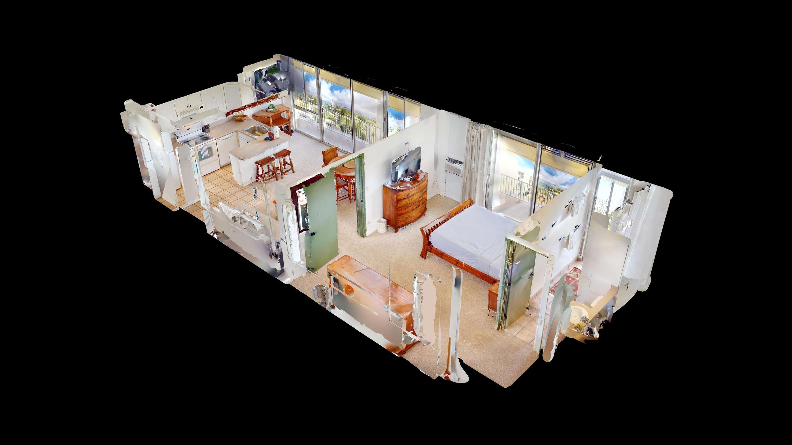 12th Floor with Full Kitchen 'Residential' Suite. Look-out in either direction from main living room in this 1-Bedroom condo & see the surf as it breaks. Relax on the modern comfortable sofabed & gaze out at the ocean, cityscape, park, & mountains. The beautifully furnished, living room, flat screen TV & dining table for 4. Open the windows on each side of the unit for the trade winds. A unique feature of the building is that each floor is only one unit wide, so getting a cooling cross breeze is accomplished by opening windows on each side of the unit should you not wish to use the A/C which is located in all living areas.