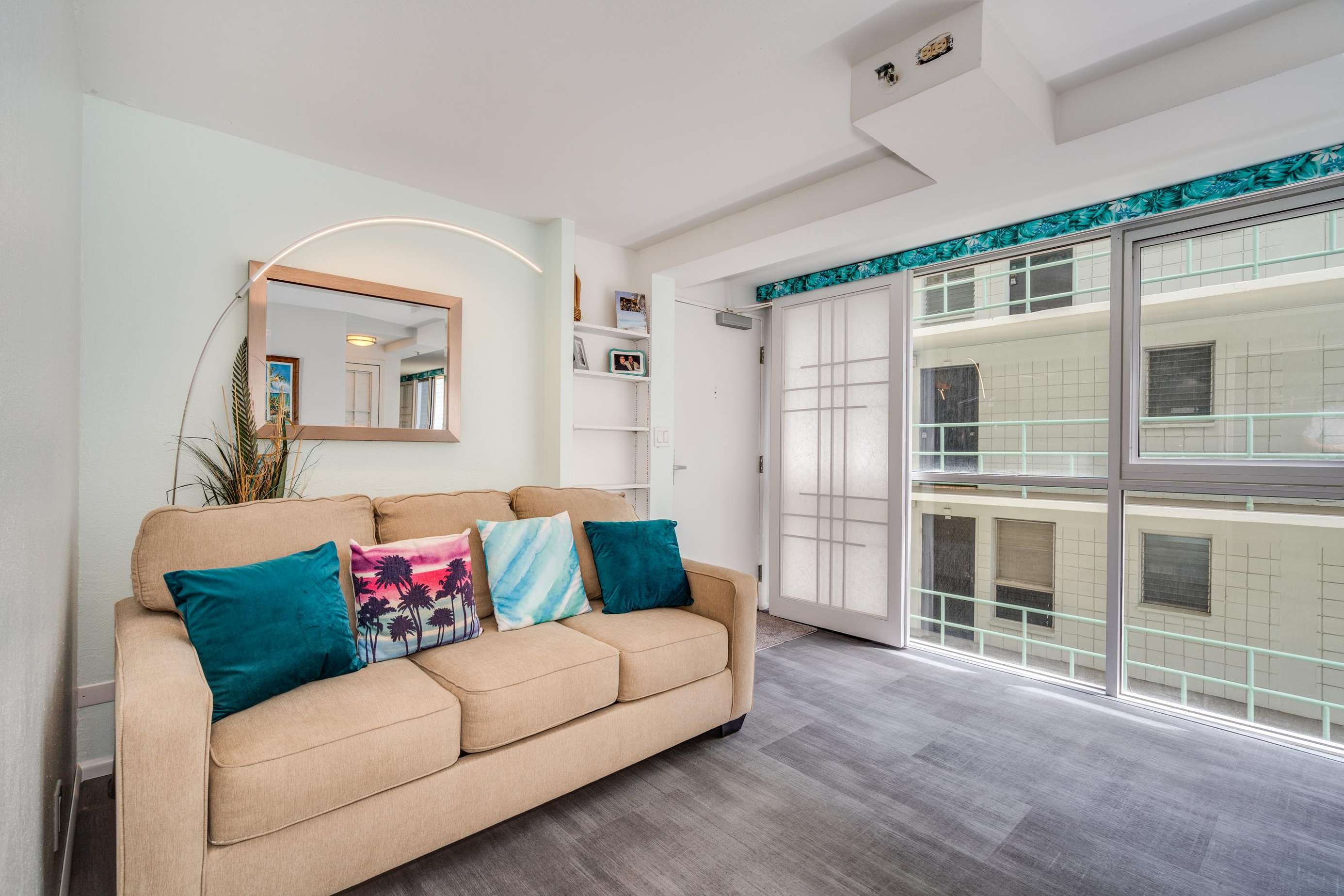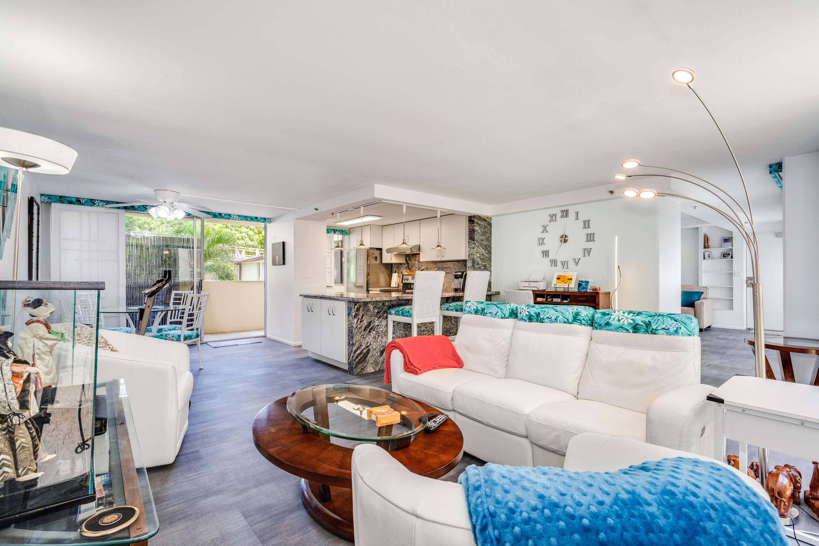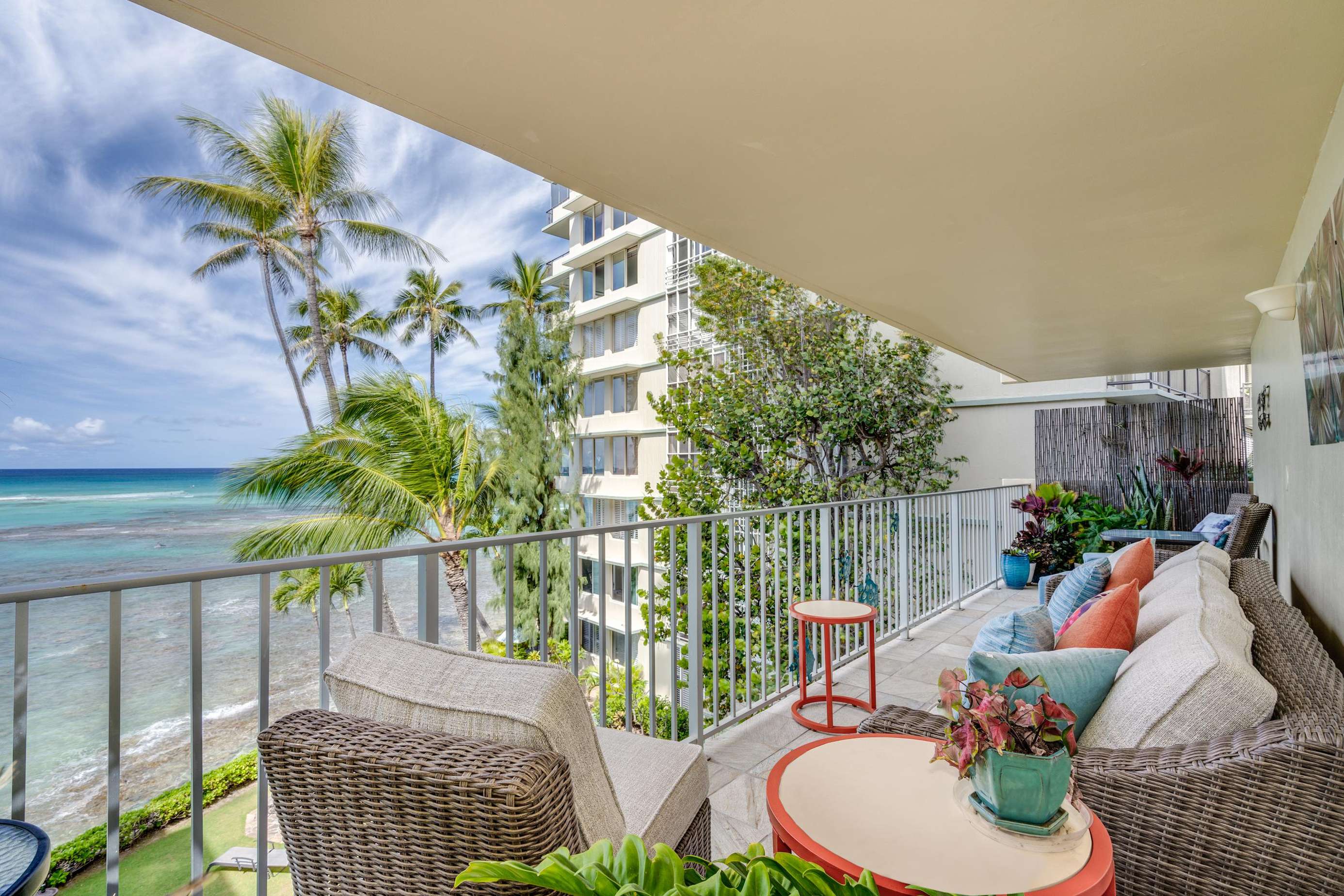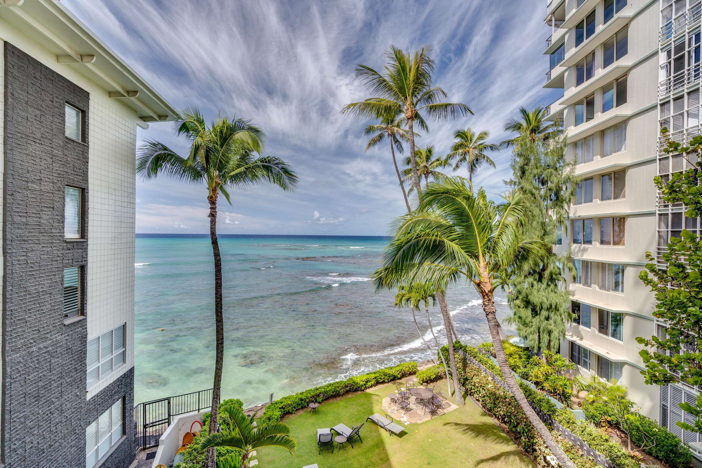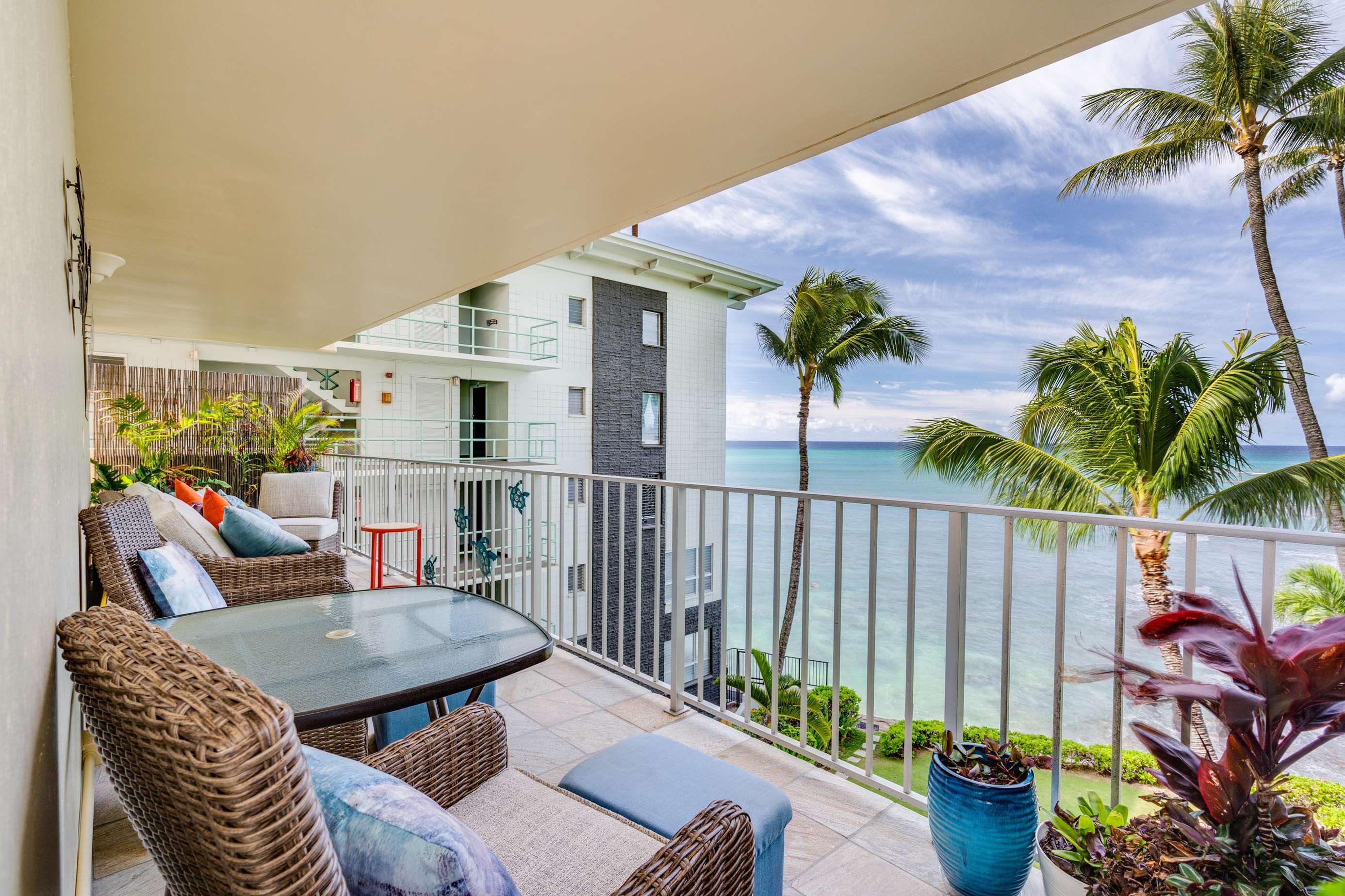 Through the large glass sliding door you access suite 401s notably best feature, the full width private lanai (with ample comfortable furniture) that looks over the property gardens out onto the great Pacific Ocean.