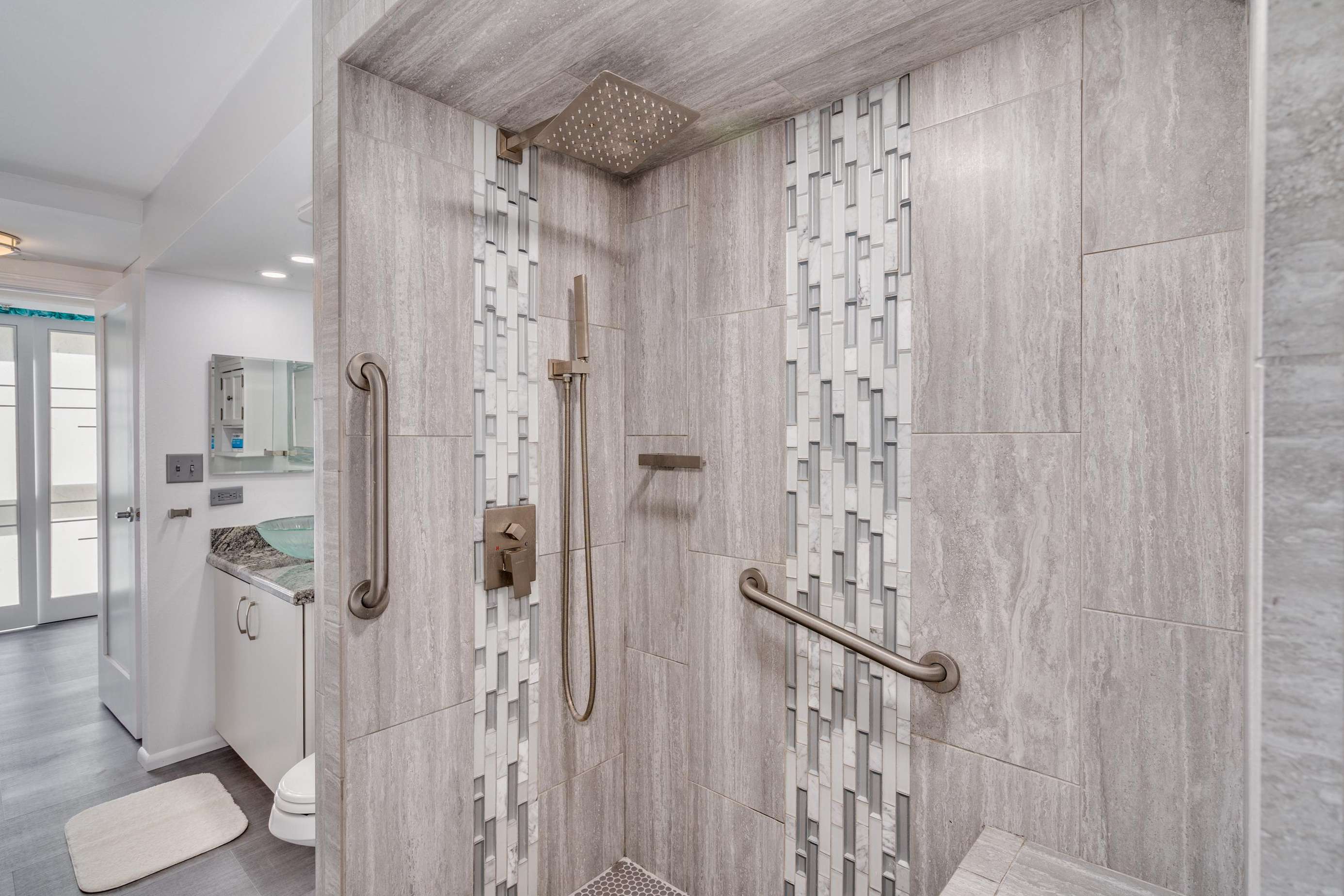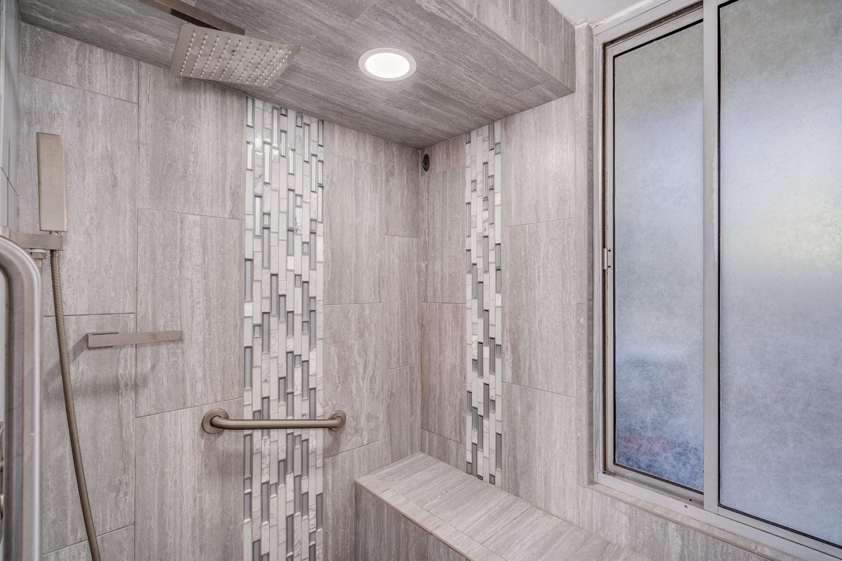 As we walk past the fully remodeled and well lit bathroom with its oversized tiled floor to ceiling massaging shower. we enter the main living room.