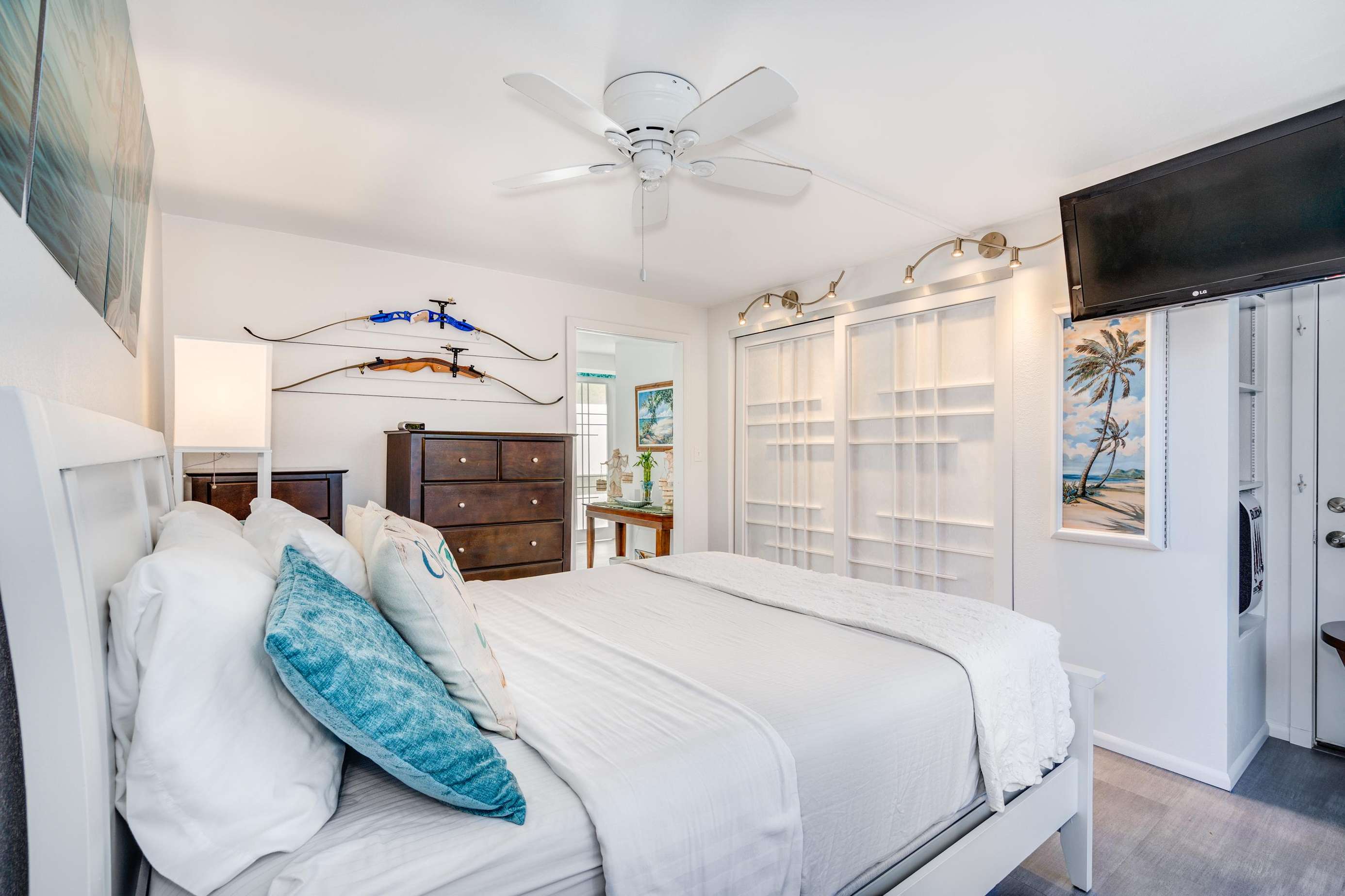 The Bedroom offers a comfortable Queen bed, accent and mood lighting with relaxing beach themed art and pillows.