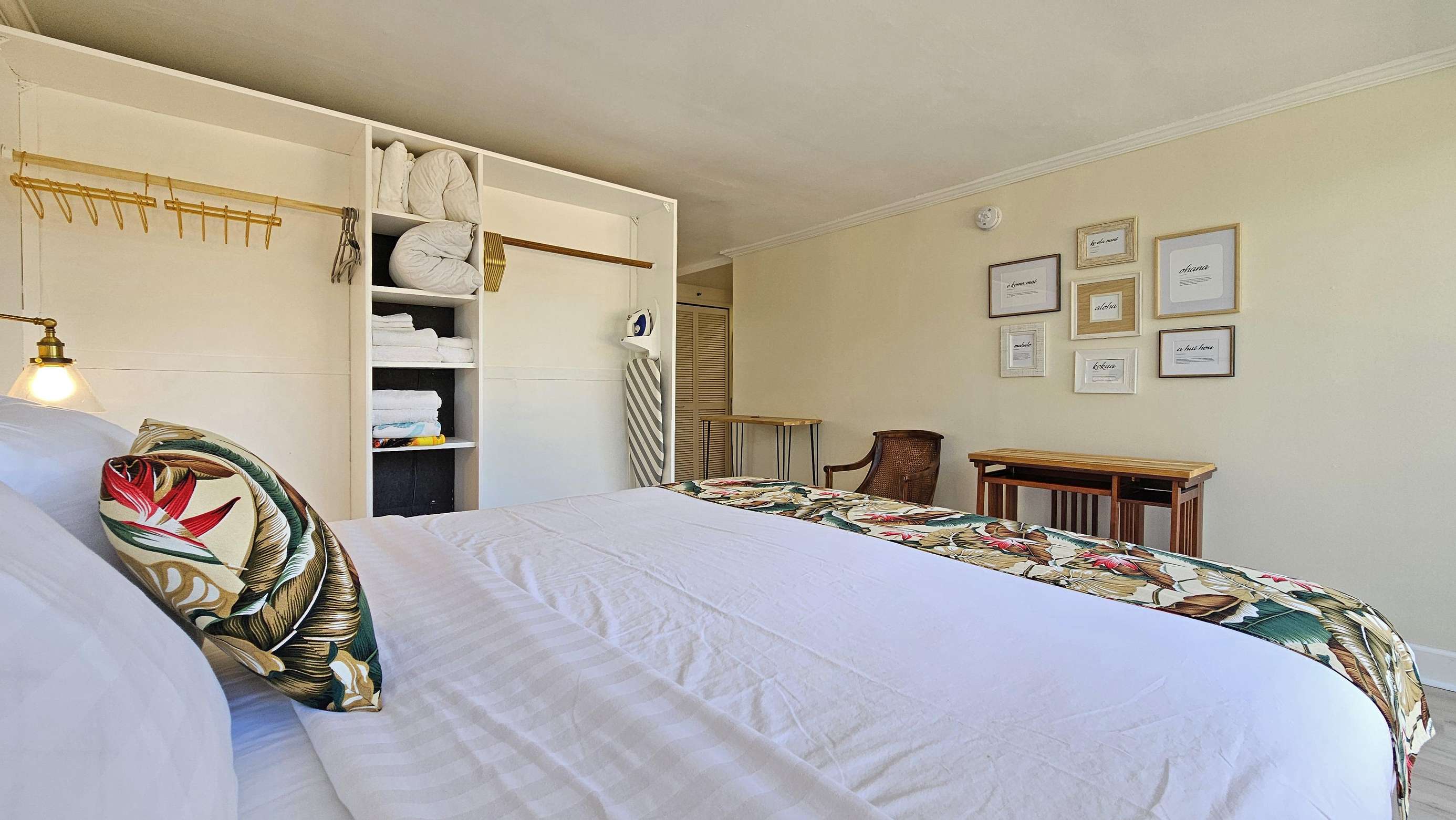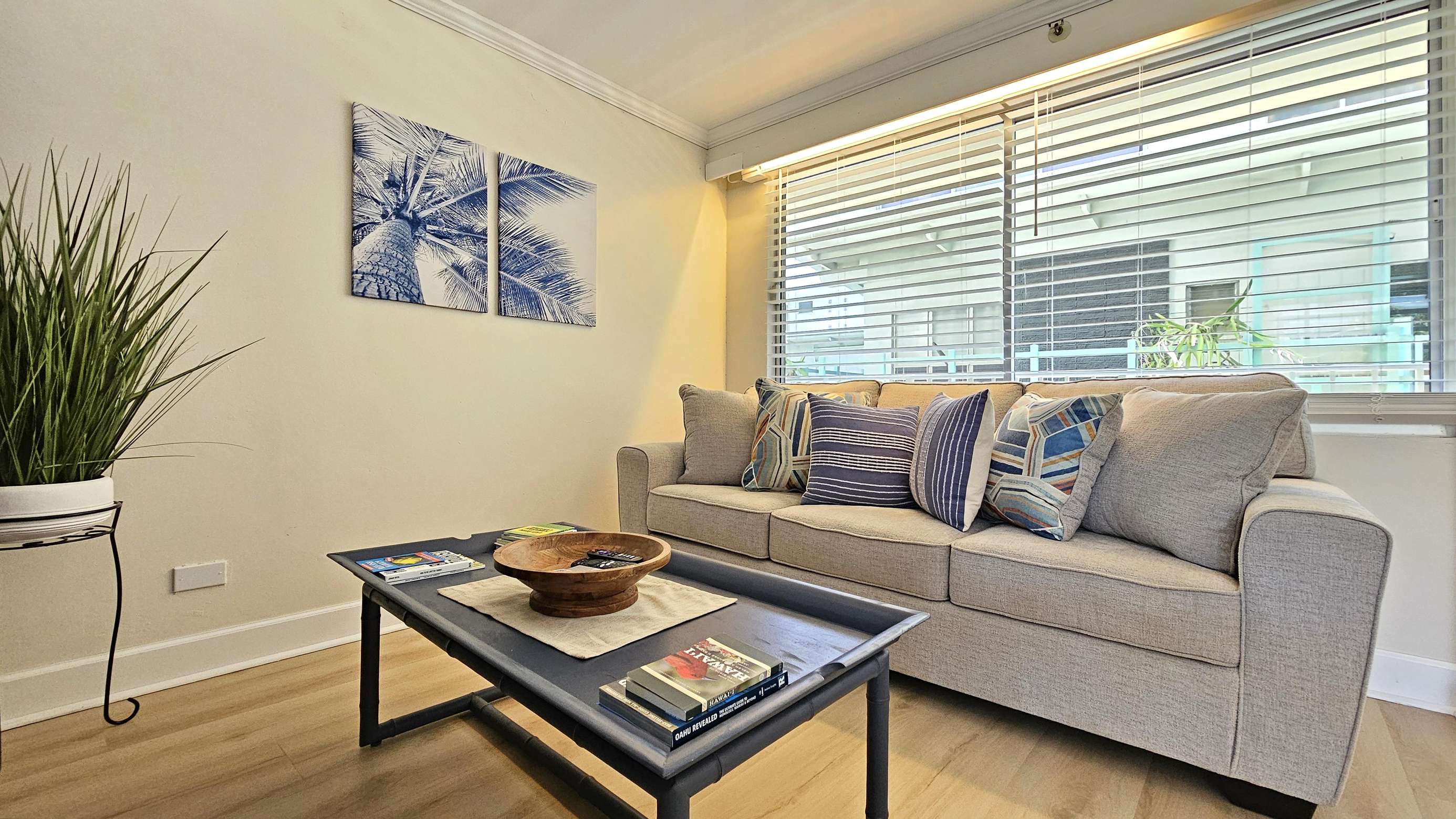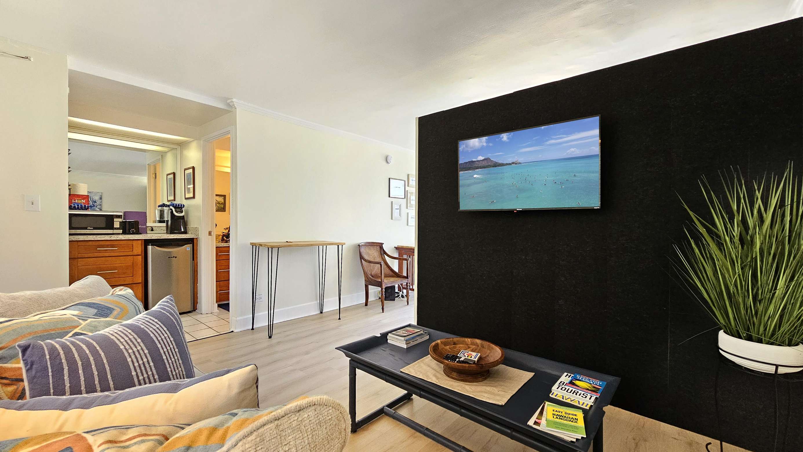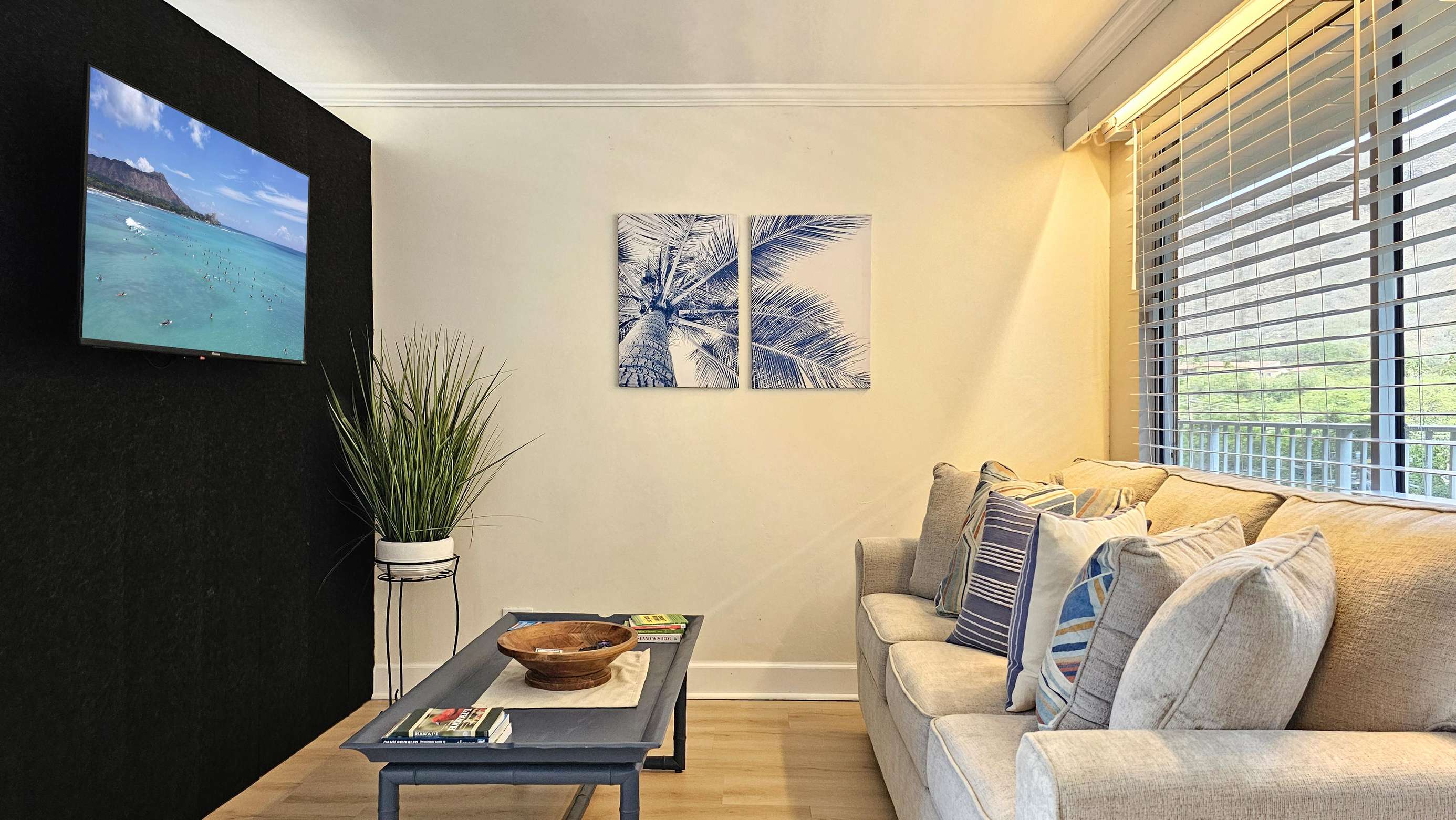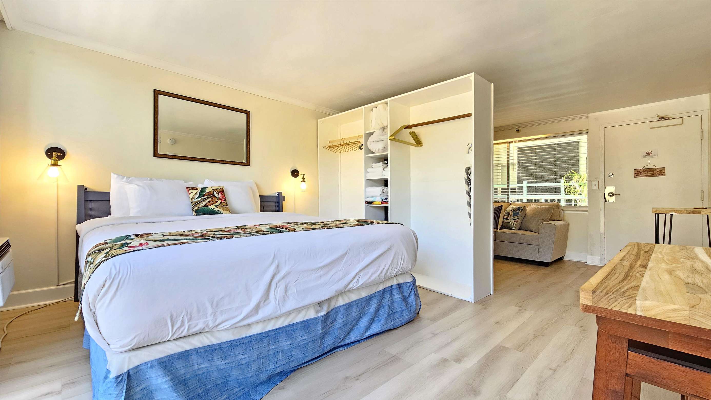 Newly renovated in 2024!!! 5th-floor studio suite (garden rooftop view) at the Diamond Head Beach Hotel. Includes comfortable King bed with Tommy Bahama luxury pillows and Queen sleeper sofa.