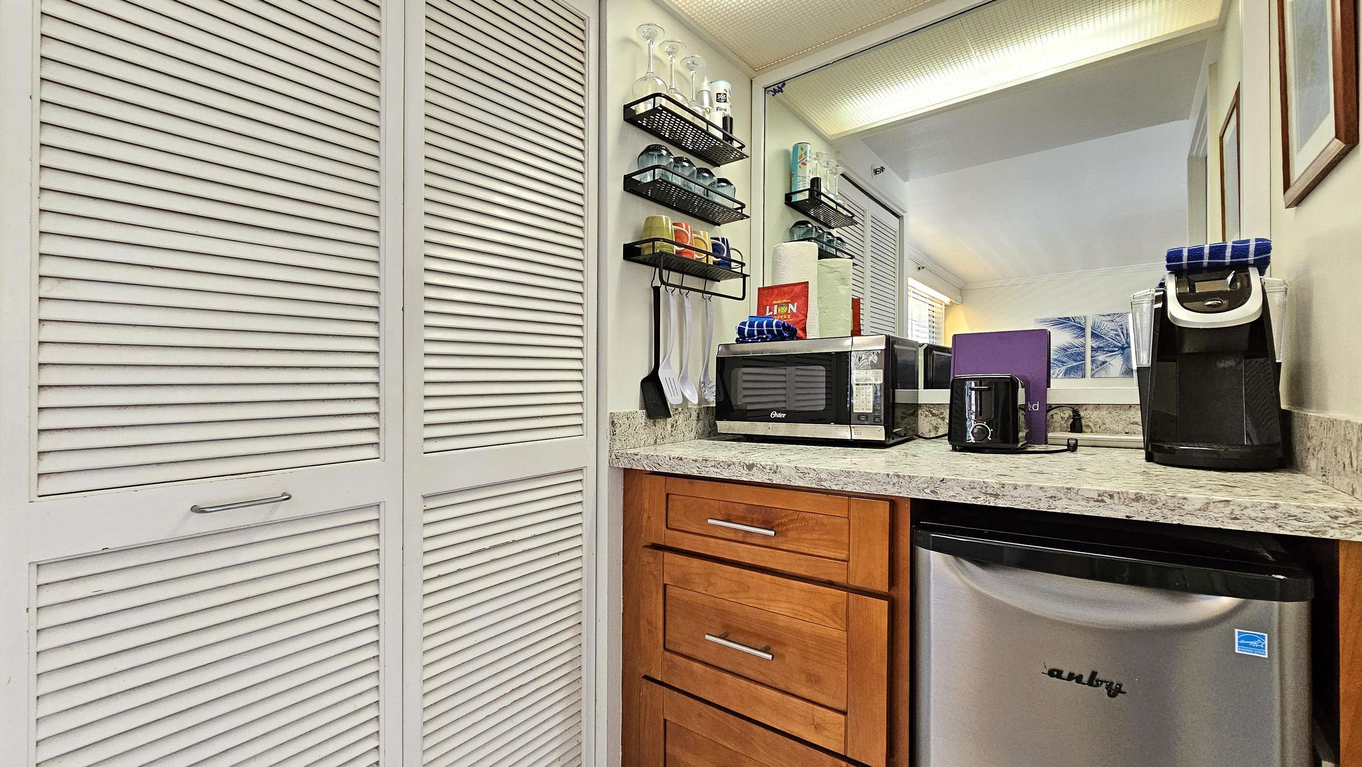 Beautiful 5th-floor studio suite (garden rooftop view) at the Diamond Head Beach Hotel. Includes comfortable king bed with Tommy Bahama luxury pillows. Queen sleeper sofa. New AC unit. TV, HD Cable, WiFI. Kitchen nook (microwave, Keurig, toaster, dishes & utensils). Shower/tub combo. Complimentary beach chairs (2), fresh beach towels, backpack cooler, picnic kit, hammocks (2), umbrellas (2), basketball, soccer ball, frisbee, pickleball rackets (2), trekking poles (2),