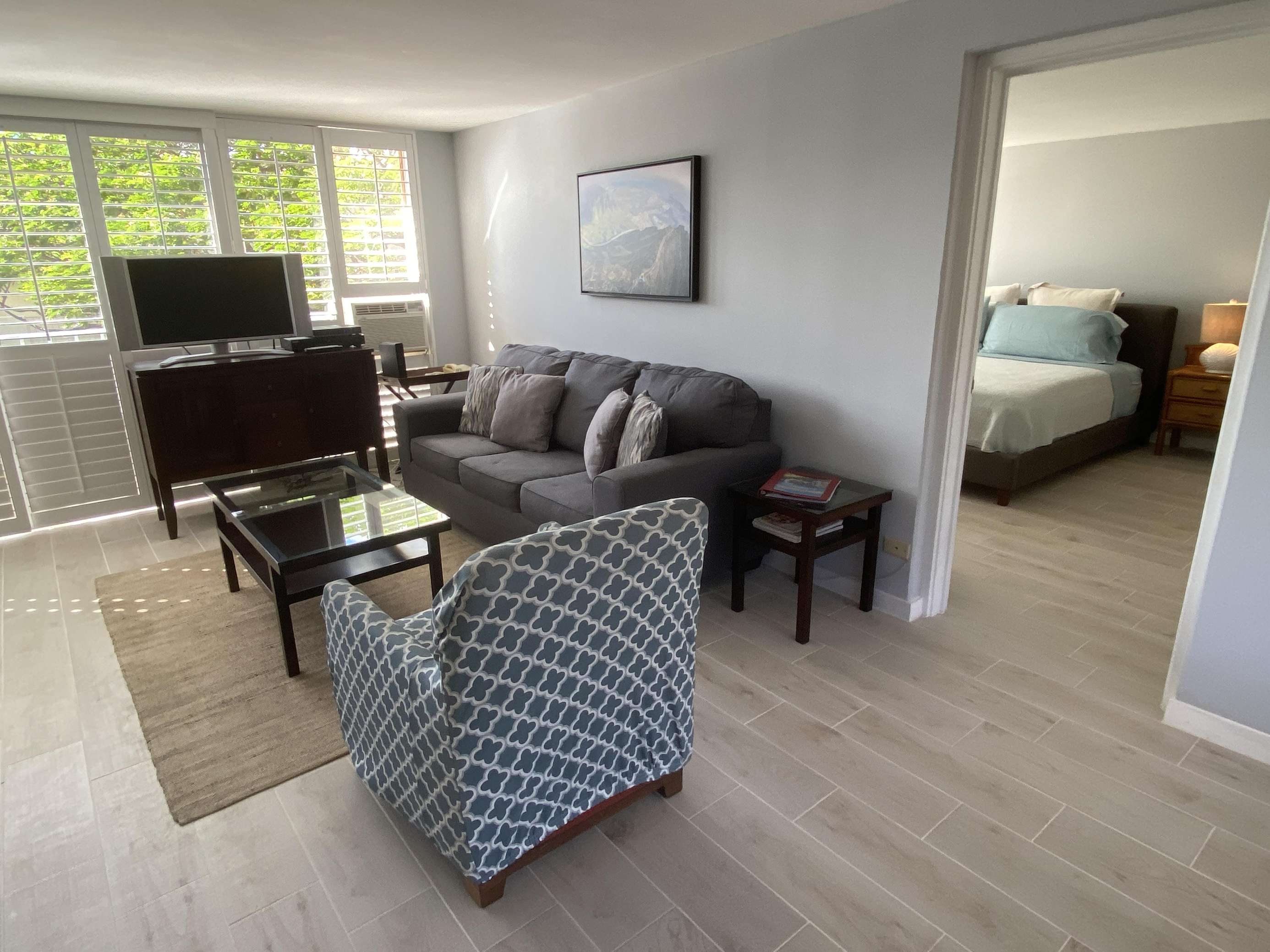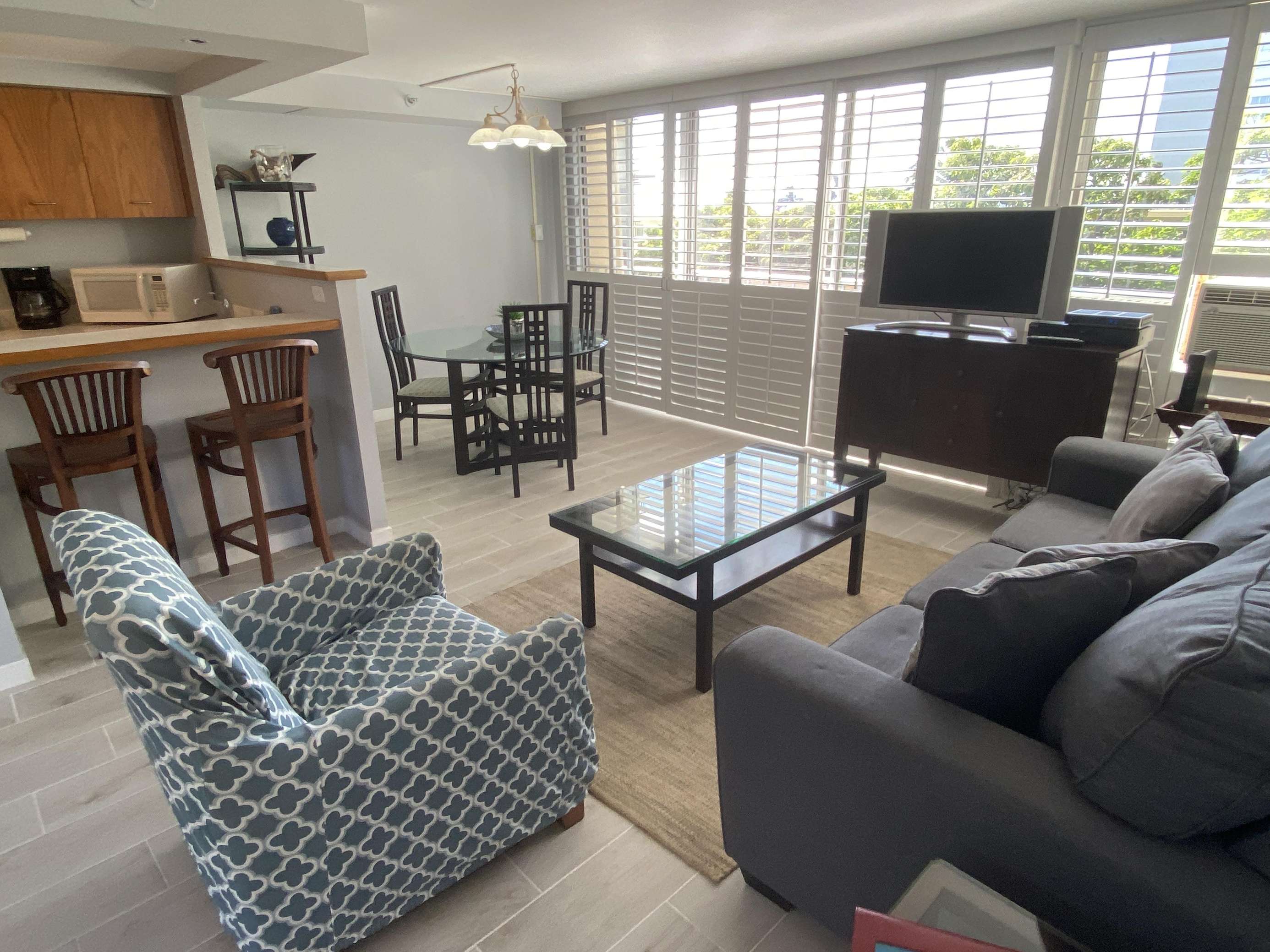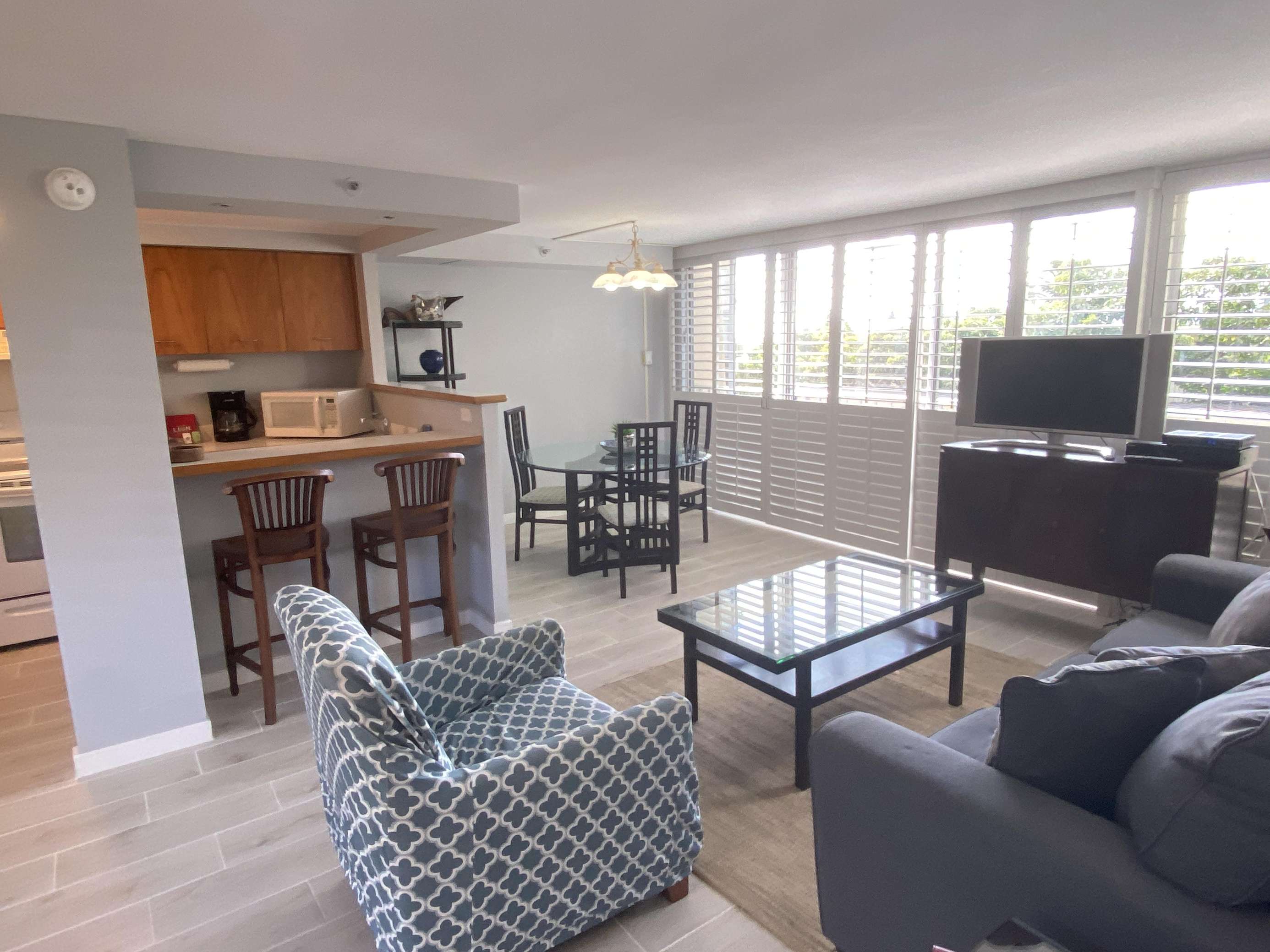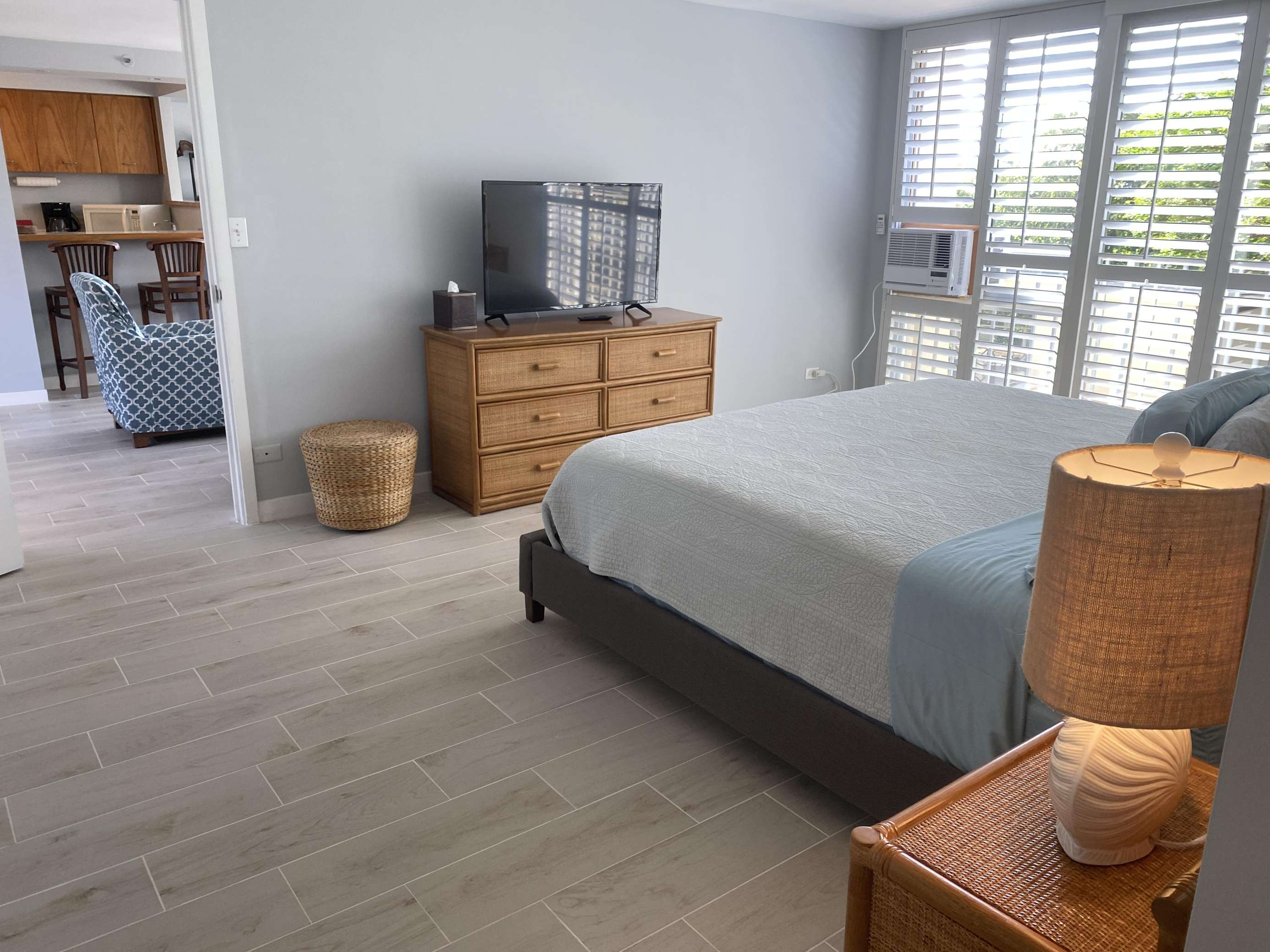 6th Floor with Full Kitchen 'Residential' Suite. Modern, clean and bright living areas with new flooring throughout. Relax on the modern comfortable sofabed & enjoying either the ocean breezes or powerful (and quiet) A/C after a day at the beach or enjoying our oceanfront garden area. This beautifully furnished 1 bedroom King bed suite living room, flat screen TV & dining table for 3. Open the windows on each side of the unit for the trade winds. A unique feature of the building is that each floor is only one unit wide, so getting a cooling cross breeze is accomplished by opening windows on each side of the unit should you not wish to use the A/C which is located in all living areas.