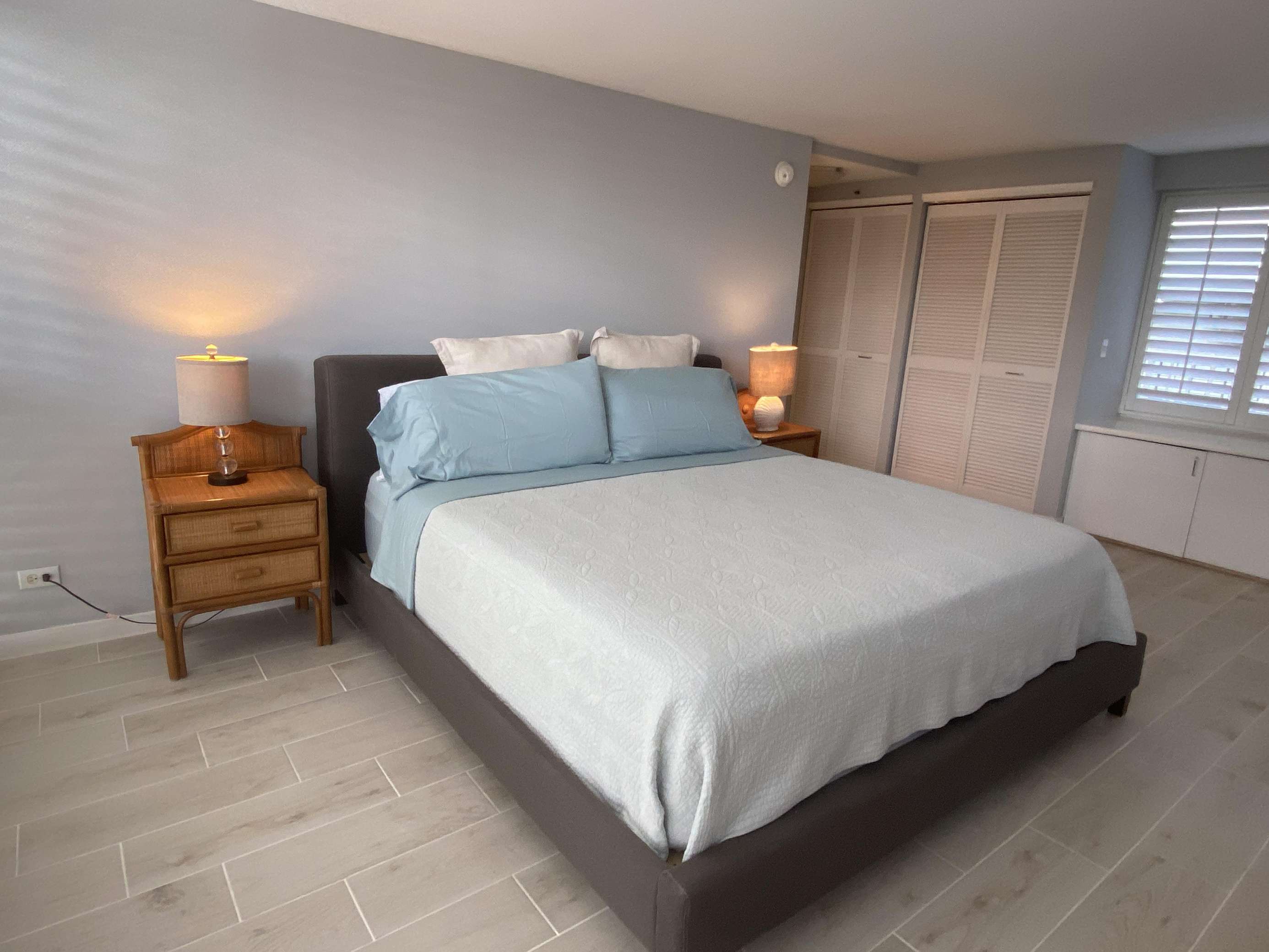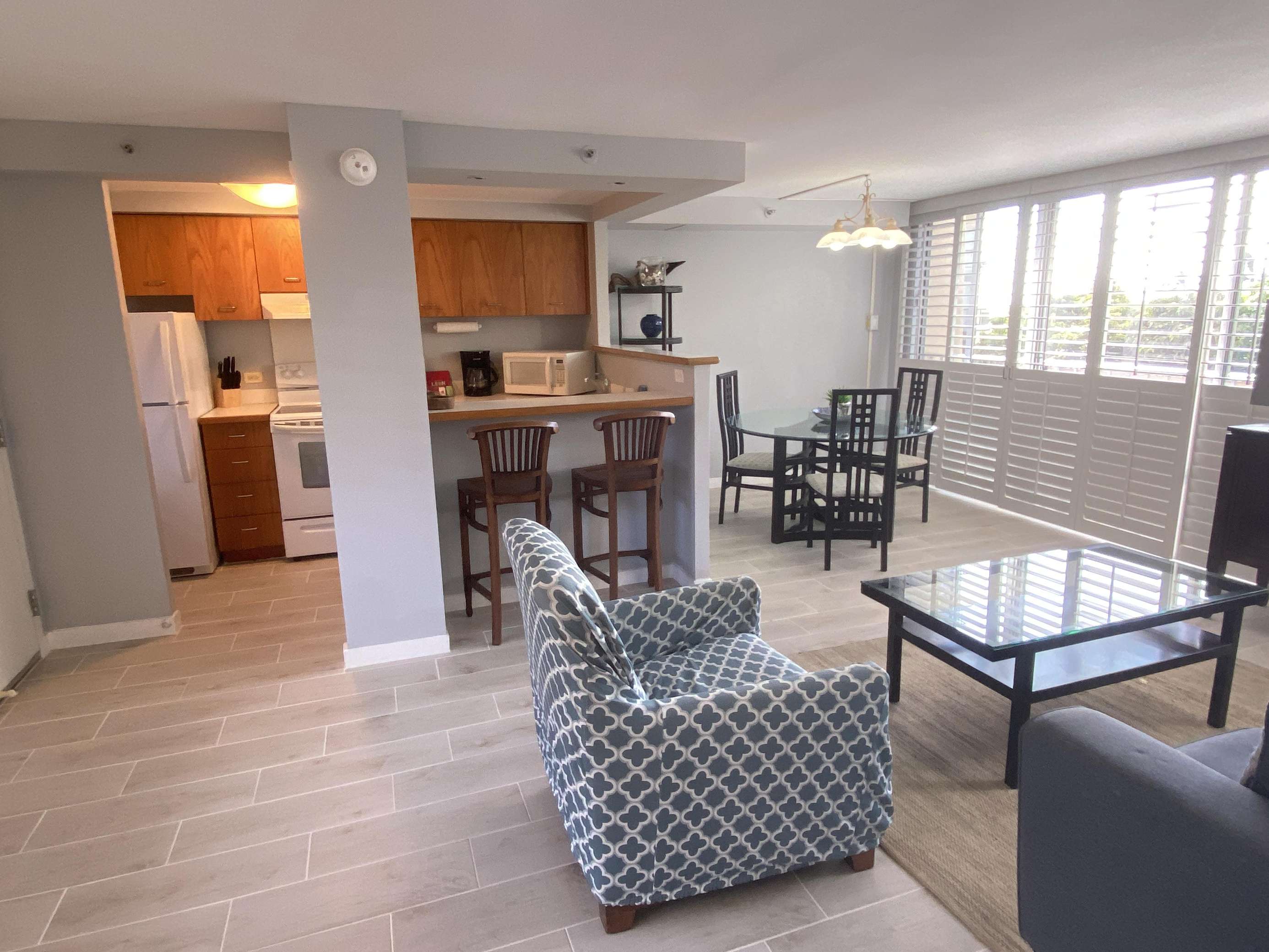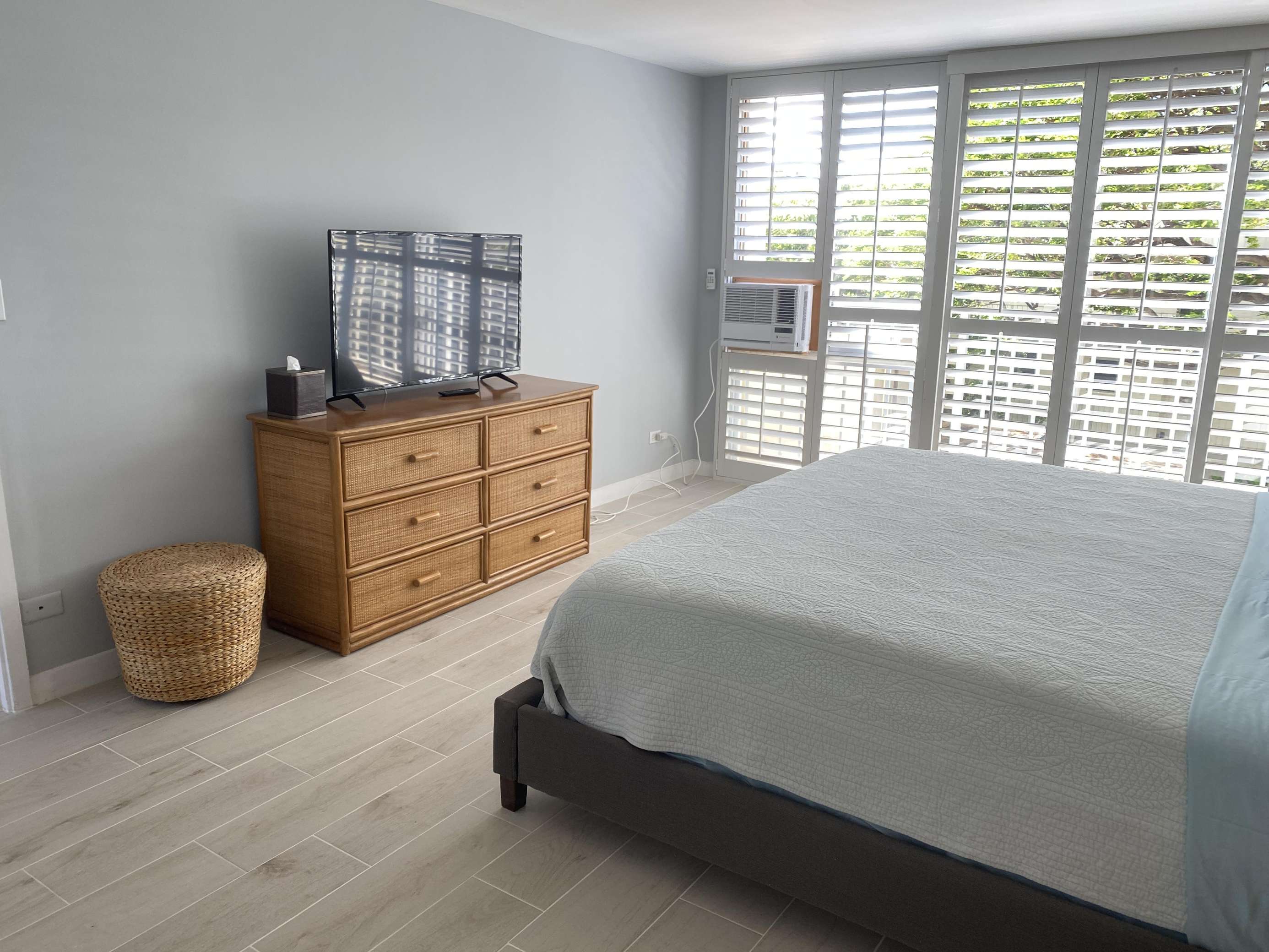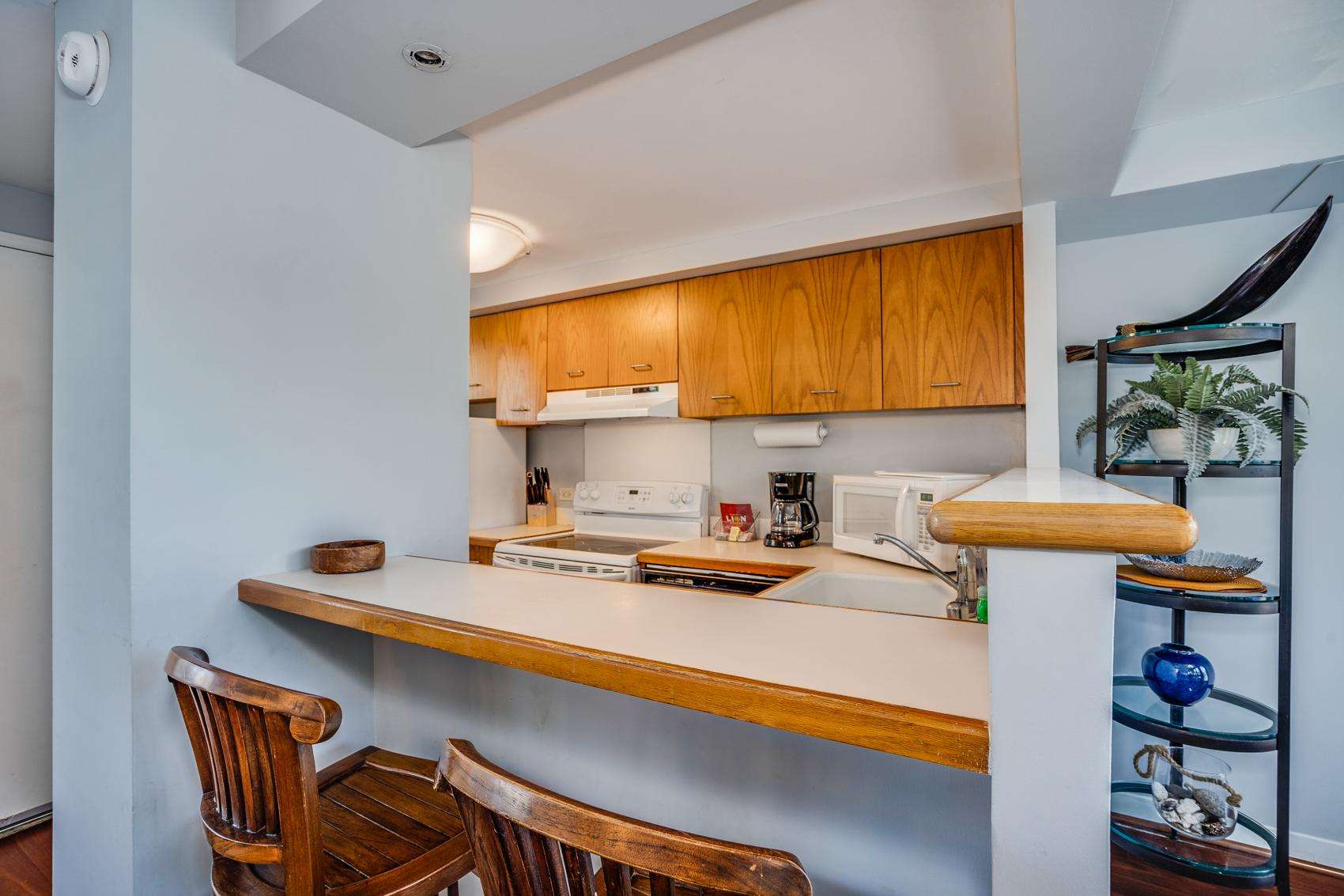 6th Floor with Full Kitchen 'Residential' Suite. Modern, clean and bright living areas with new flooring throughout. Relax on the modern comfortable sofabed & enjoying either the ocean breezes or powerful (and quiet) A/C after a day at the beach or enjoying our oceanfront garden area. This beautifully furnished 1 bedroom King bed suite living room, flat screen TV & dining table for 3. Open the windows on each side of the unit for the trade winds. A unique feature of the building is that each floor is only one unit wide, so getting a cooling cross breeze is accomplished by opening windows on each side of the unit should you not wish to use the A/C which is located in all living areas.