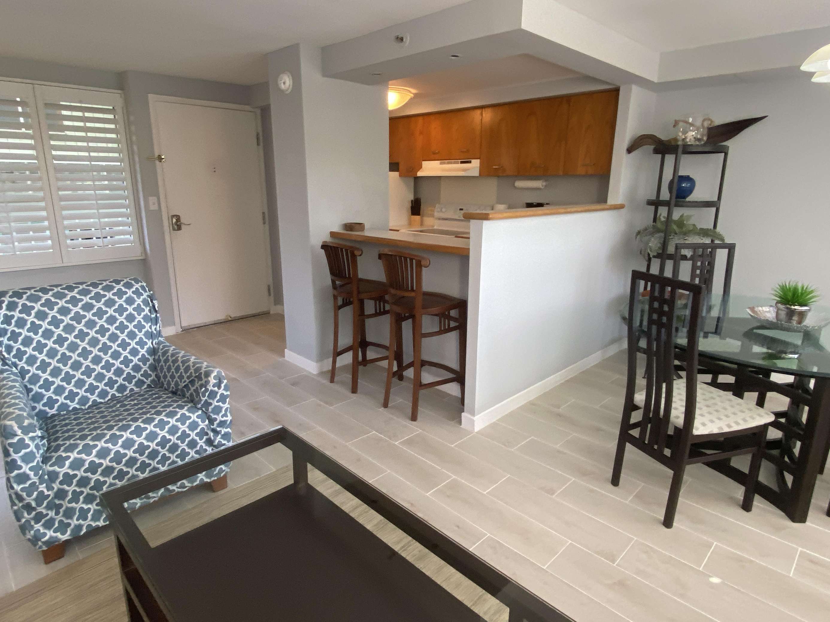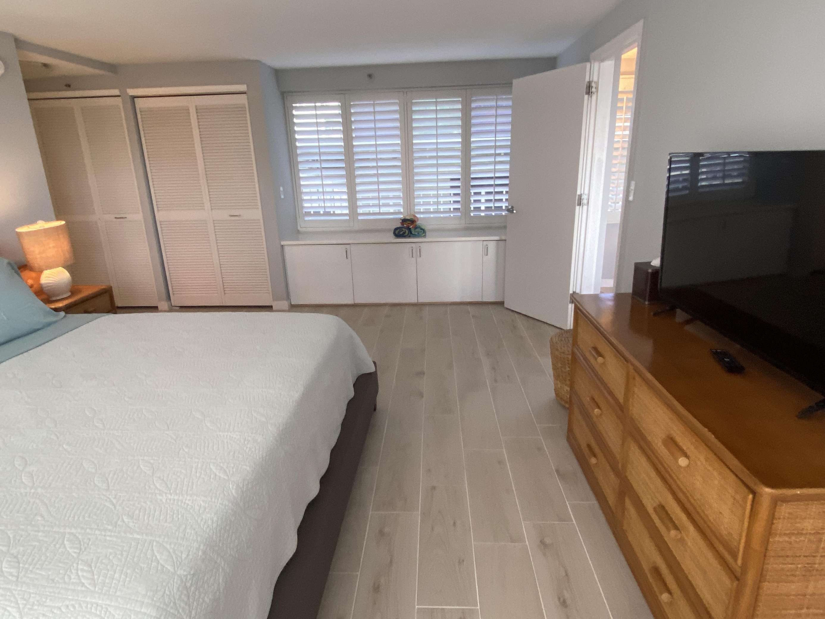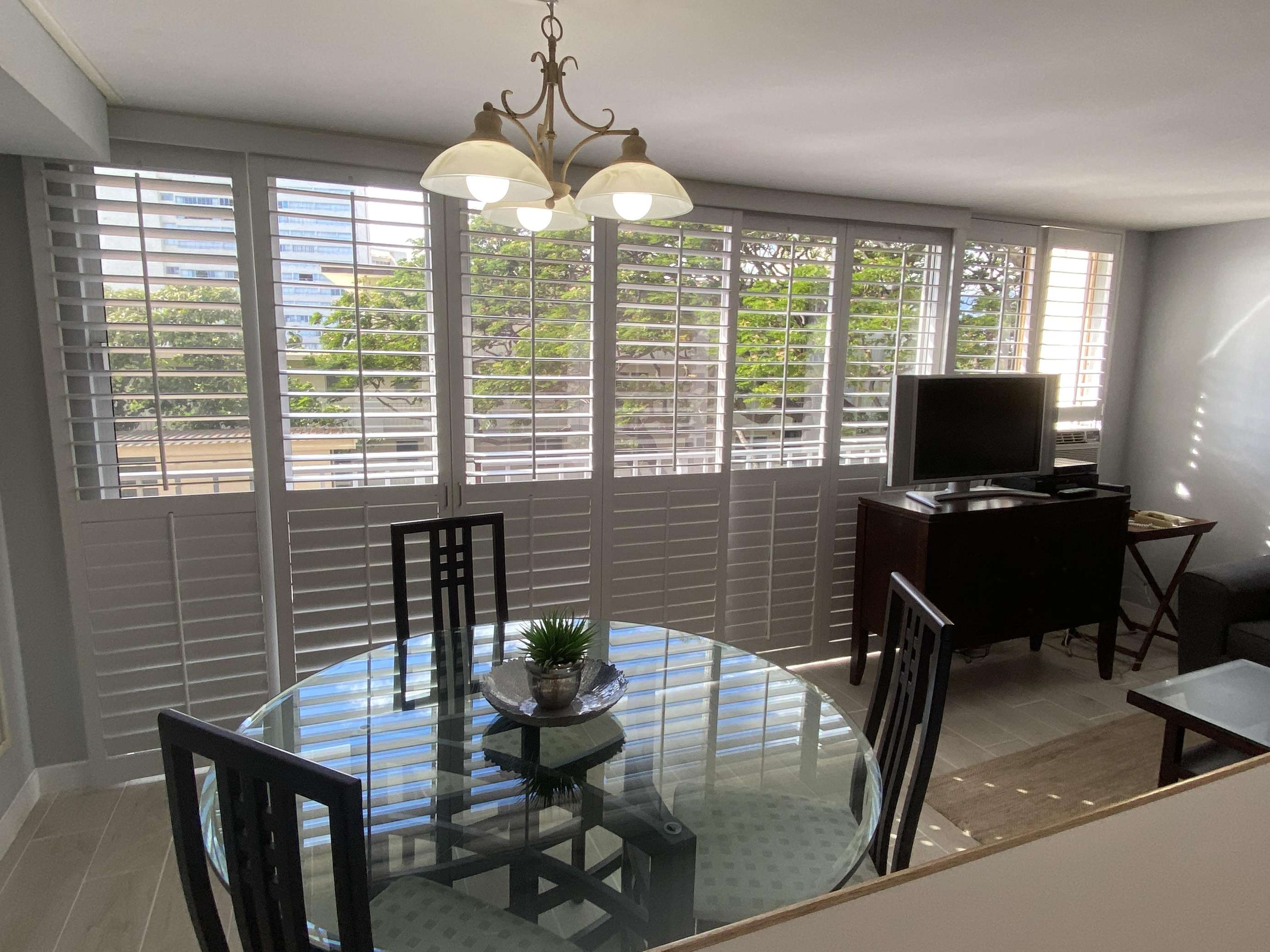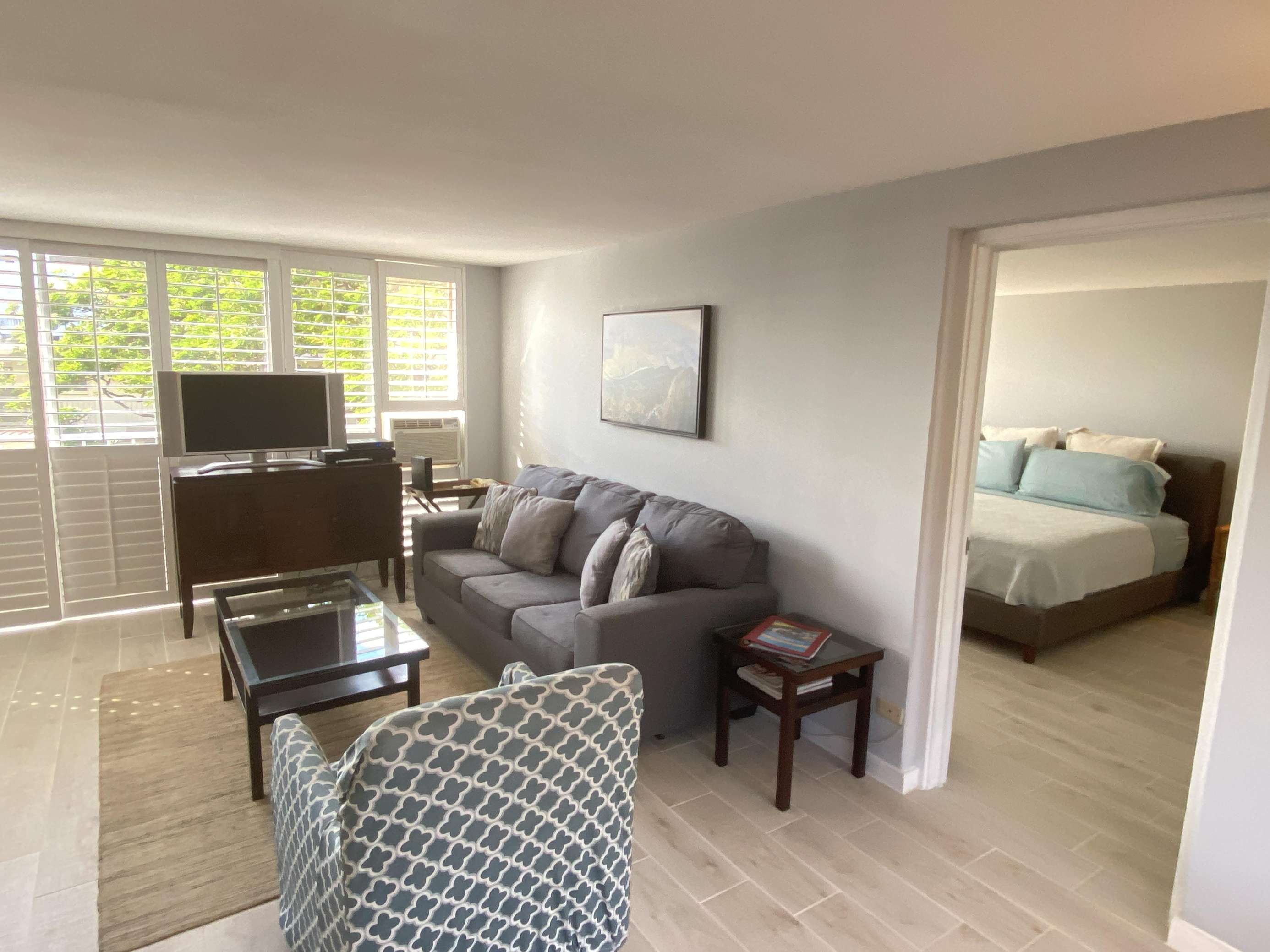 6th Floor with Full Kitchen 'Residential' Suite. Modern, clean and bright living areas with new flooring throughout. Relax on the modern comfortable sofabed & enjoying either the ocean breezes or powerful (and quiet) A/C after a day at the beach or enjoying our oceanfront garden area. This beautifully furnished 1 bedroom King bed suite living room, flat screen TV & dining table for 3. Open the windows on each side of the unit for the trade winds. A unique feature of the building is that each floor is only one unit wide, so getting a cooling cross breeze is accomplished by opening windows on each side of the unit should you not wish to use the A/C which is located in all living areas.