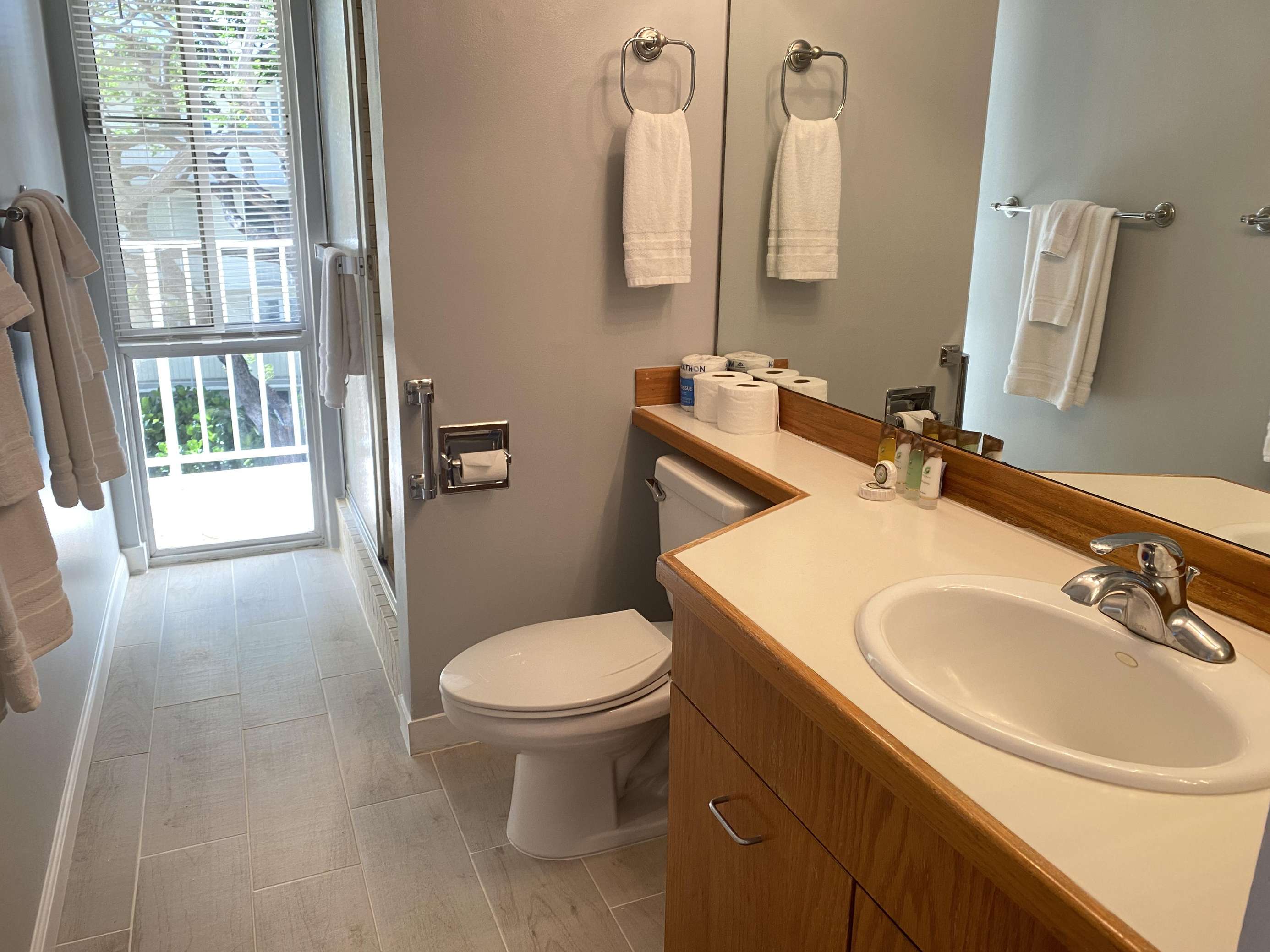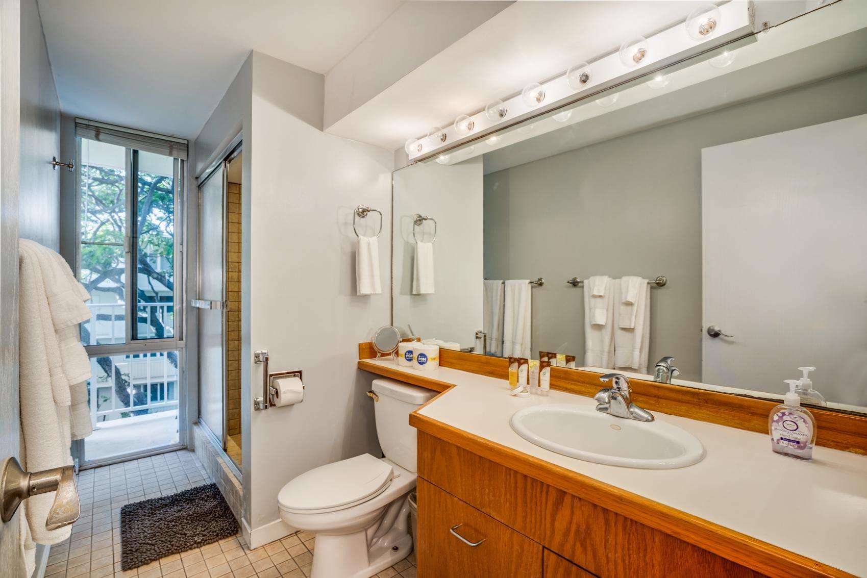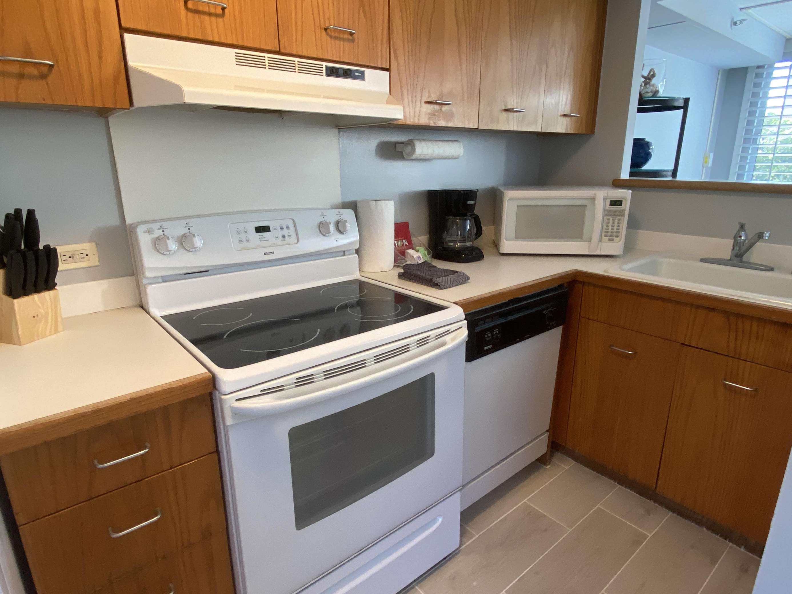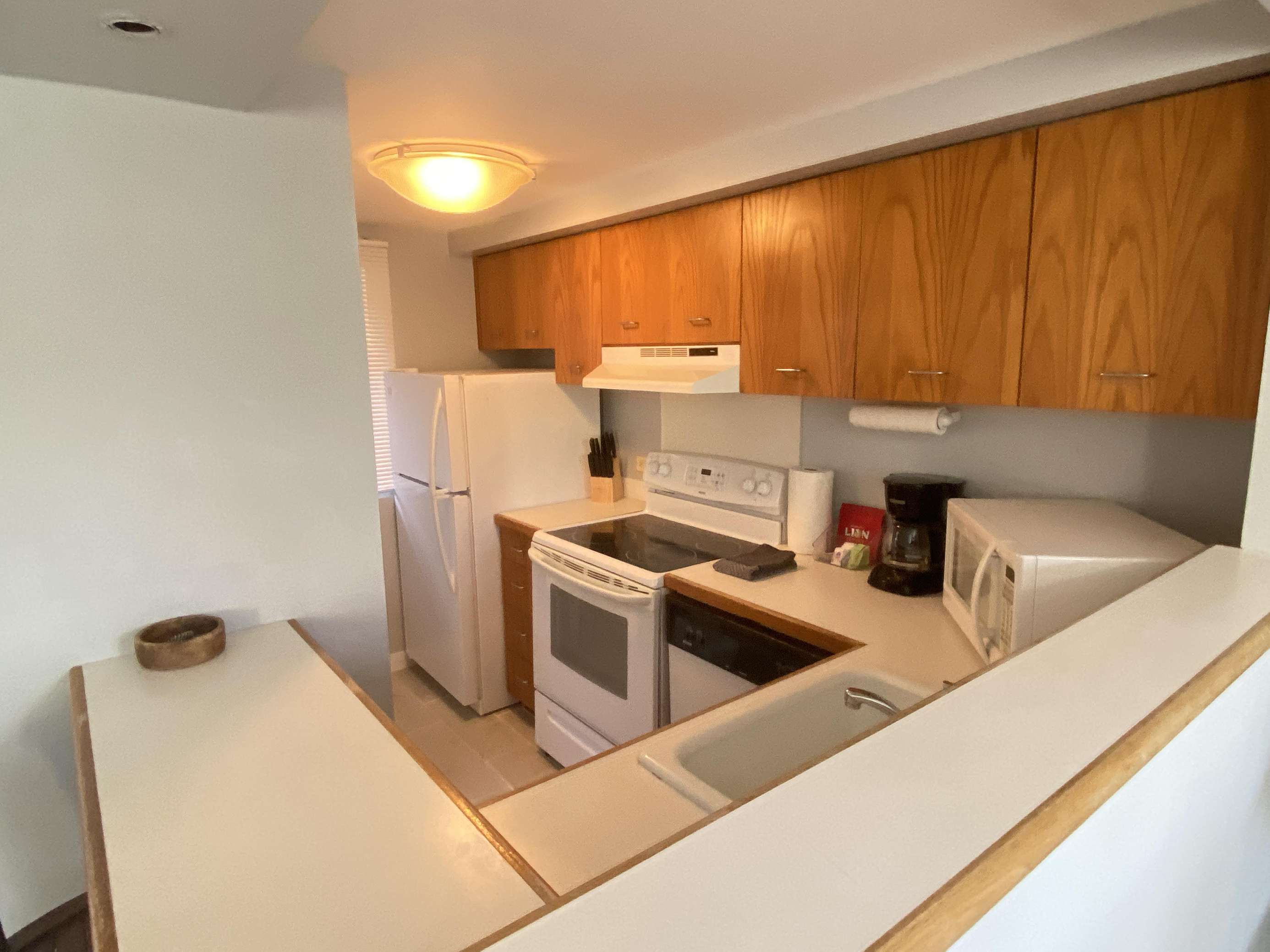 6th Floor with Full Kitchen 'Residential' Suite. Modern, clean and bright living areas with new flooring throughout. Relax on the modern comfortable sofabed & enjoying either the ocean breezes or powerful (and quiet) A/C after a day at the beach or enjoying our oceanfront garden area. This beautifully furnished 1 bedroom King bed suite living room, flat screen TV & dining table for 3. Open the windows on each side of the unit for the trade winds. A unique feature of the building is that each floor is only one unit wide, so getting a cooling cross breeze is accomplished by opening windows on each side of the unit should you not wish to use the A/C which is located in all living areas.