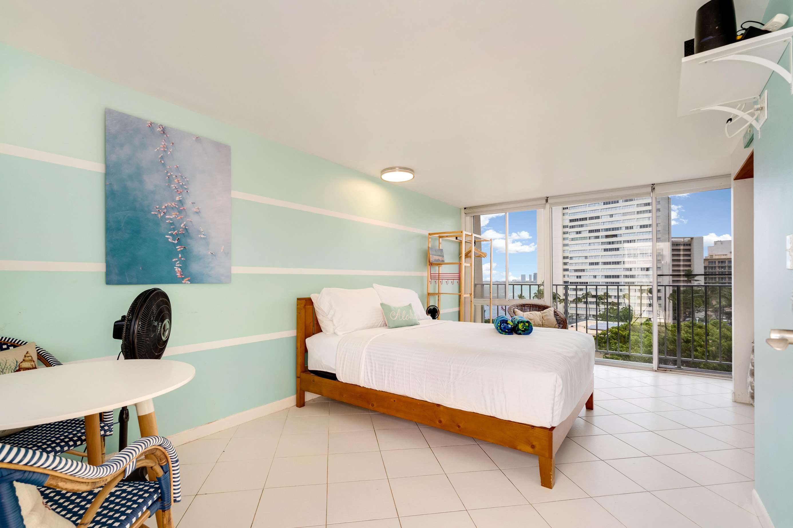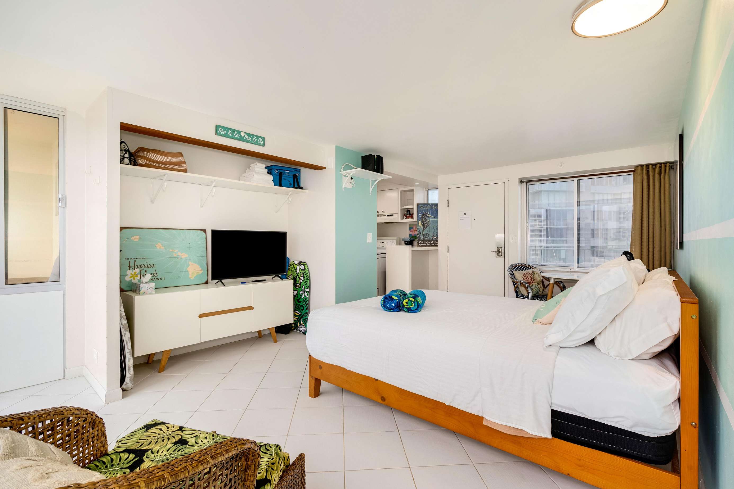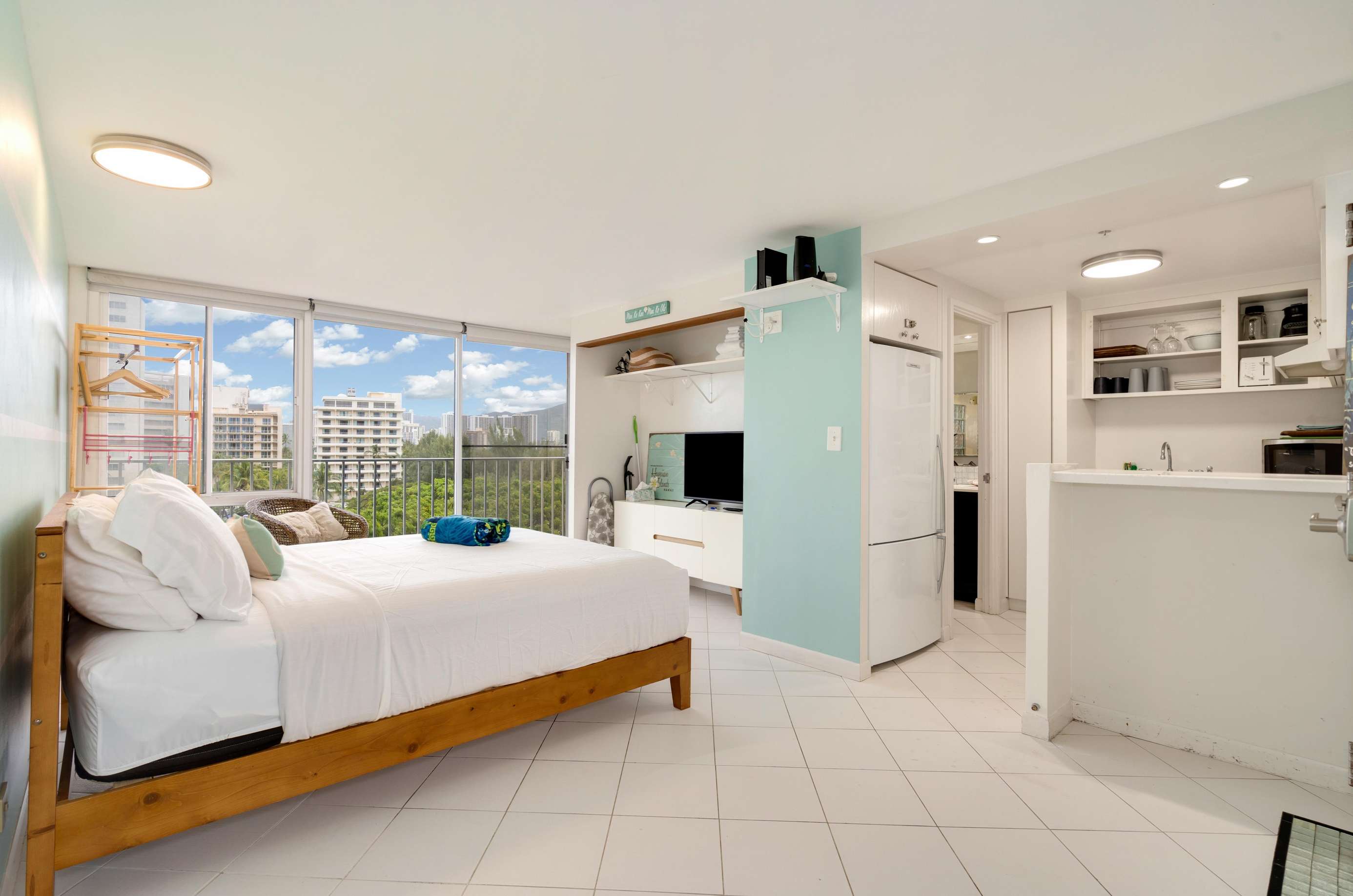 This unique studio on the 9th floor features a full kitchen and a private lanai facing West with small table and chairs, ideal for your morning coffee or maybe a romantic sunset cocktail?