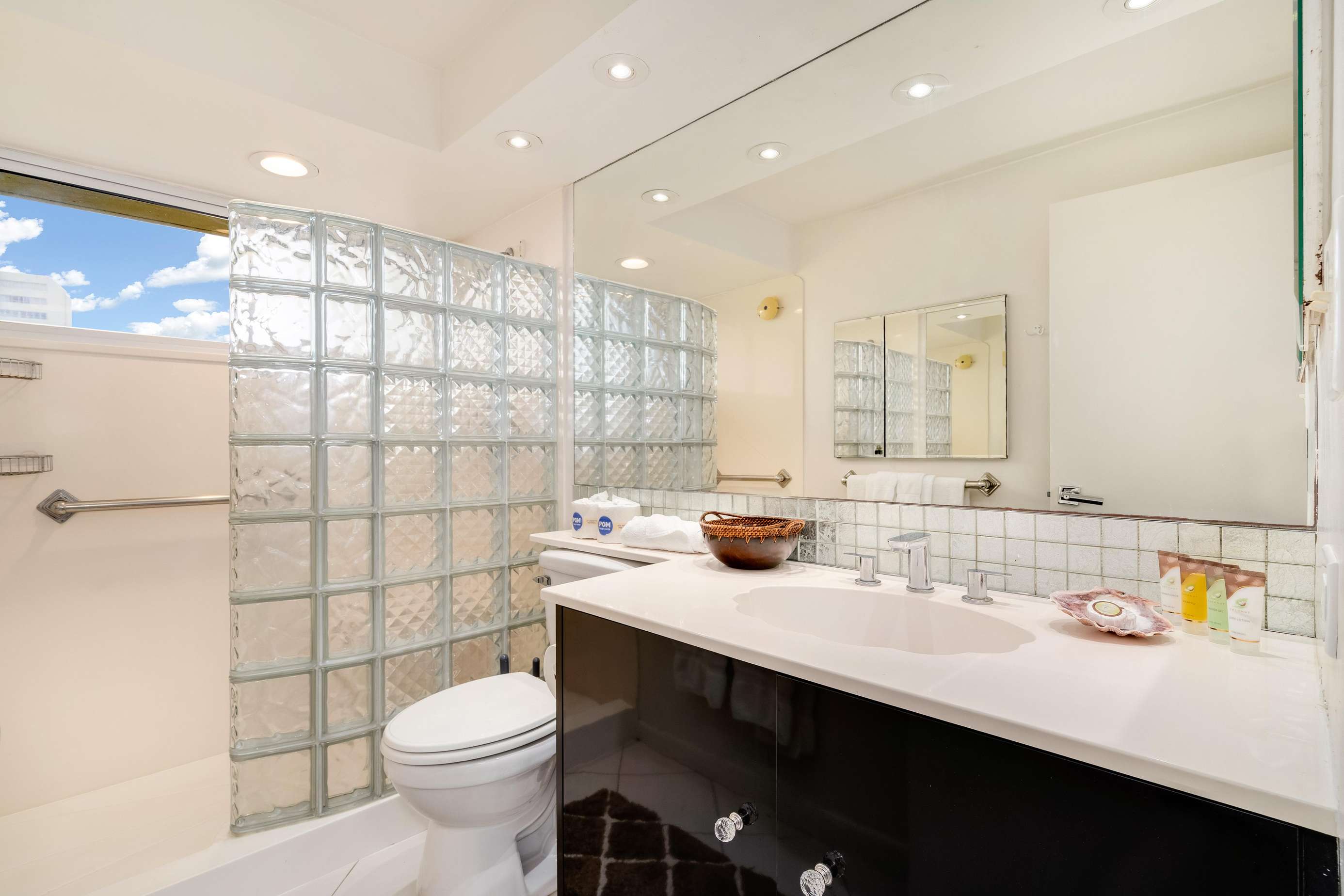 The bathroom has a simple well lit vanity area, toilet and an over sized walk in shower with low step-in, perfect for all ages.