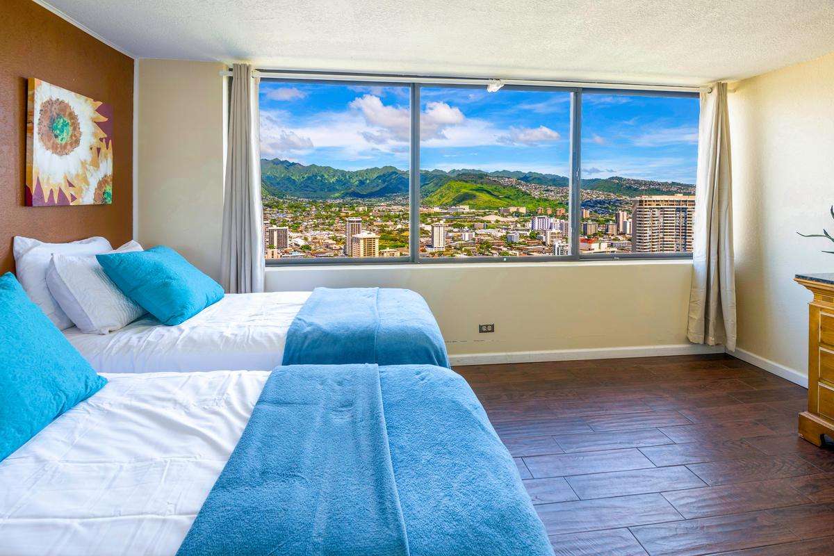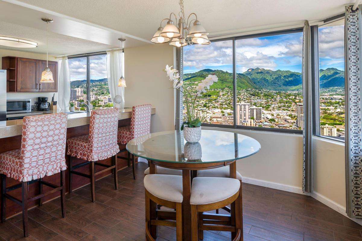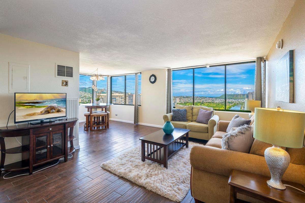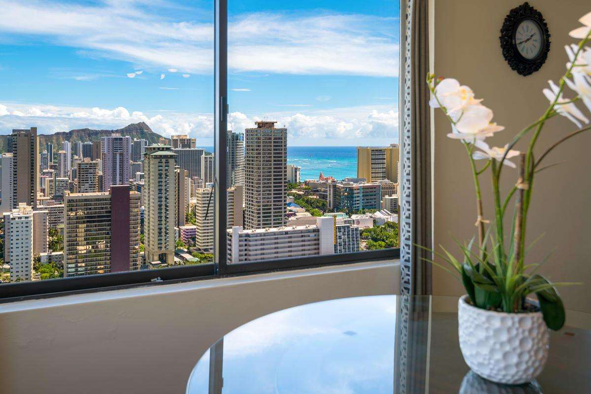 This great Waikiki 2BR/2BA Penthouse suite offers an incredible sweeping panoramic bird's view of the gorgeous lush mountain range, the brilliant colors of city lights, Ala Wai canal, golf course, Diamond Head, coastline and of course the Pacific Ocean