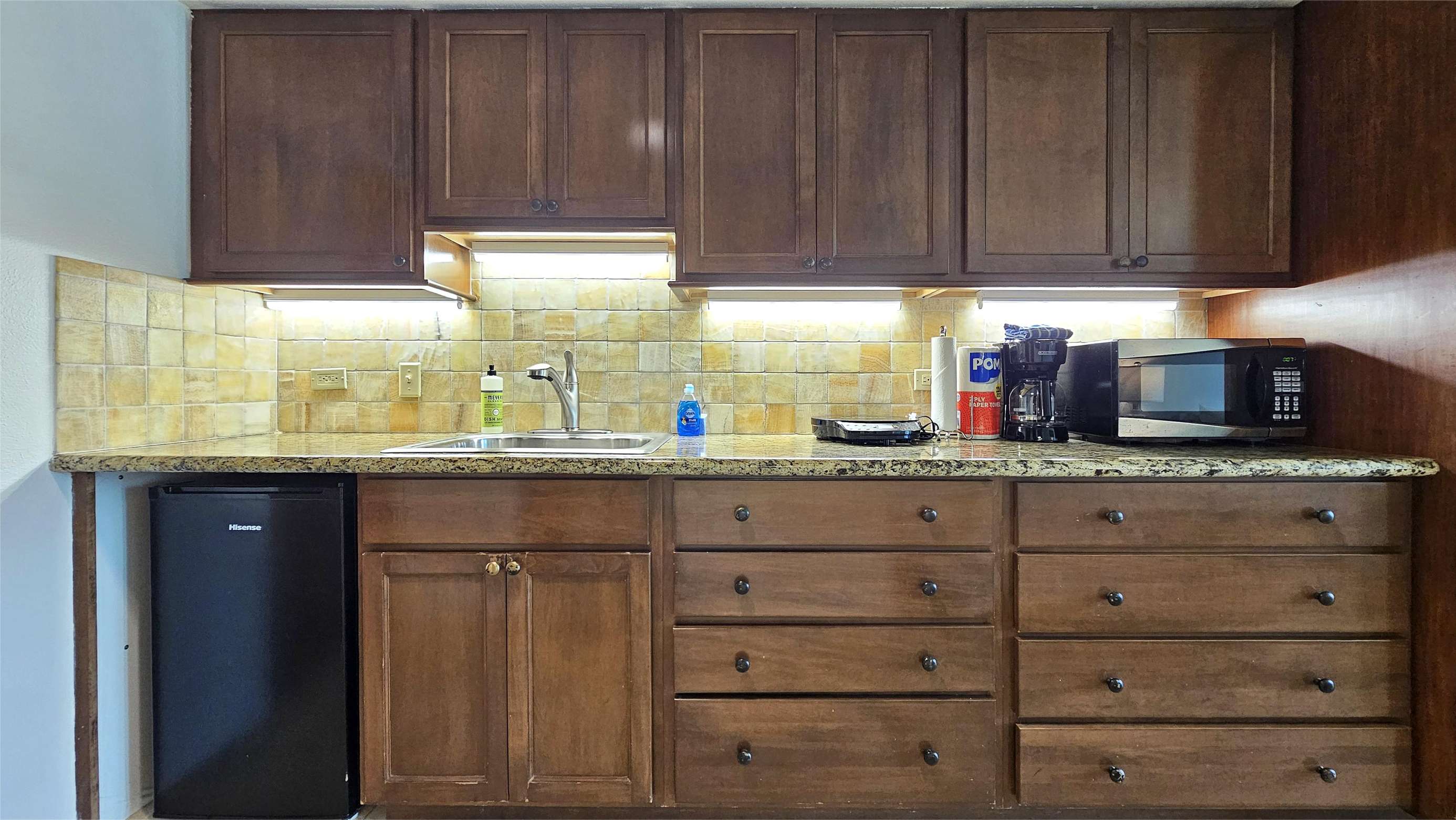 Fully equipped kitchen with filtered water on tap, refrigerator, microwave and stovetop.