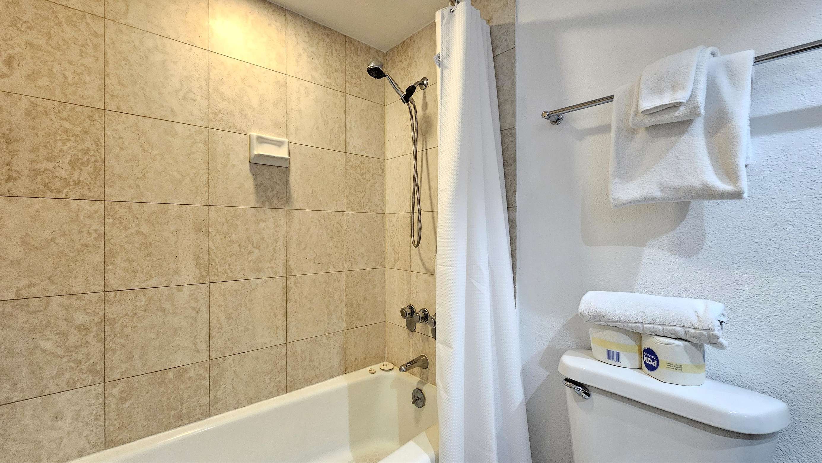 Bright & clean bathroom with tub/shower and fresh white cotton towels for each guest.