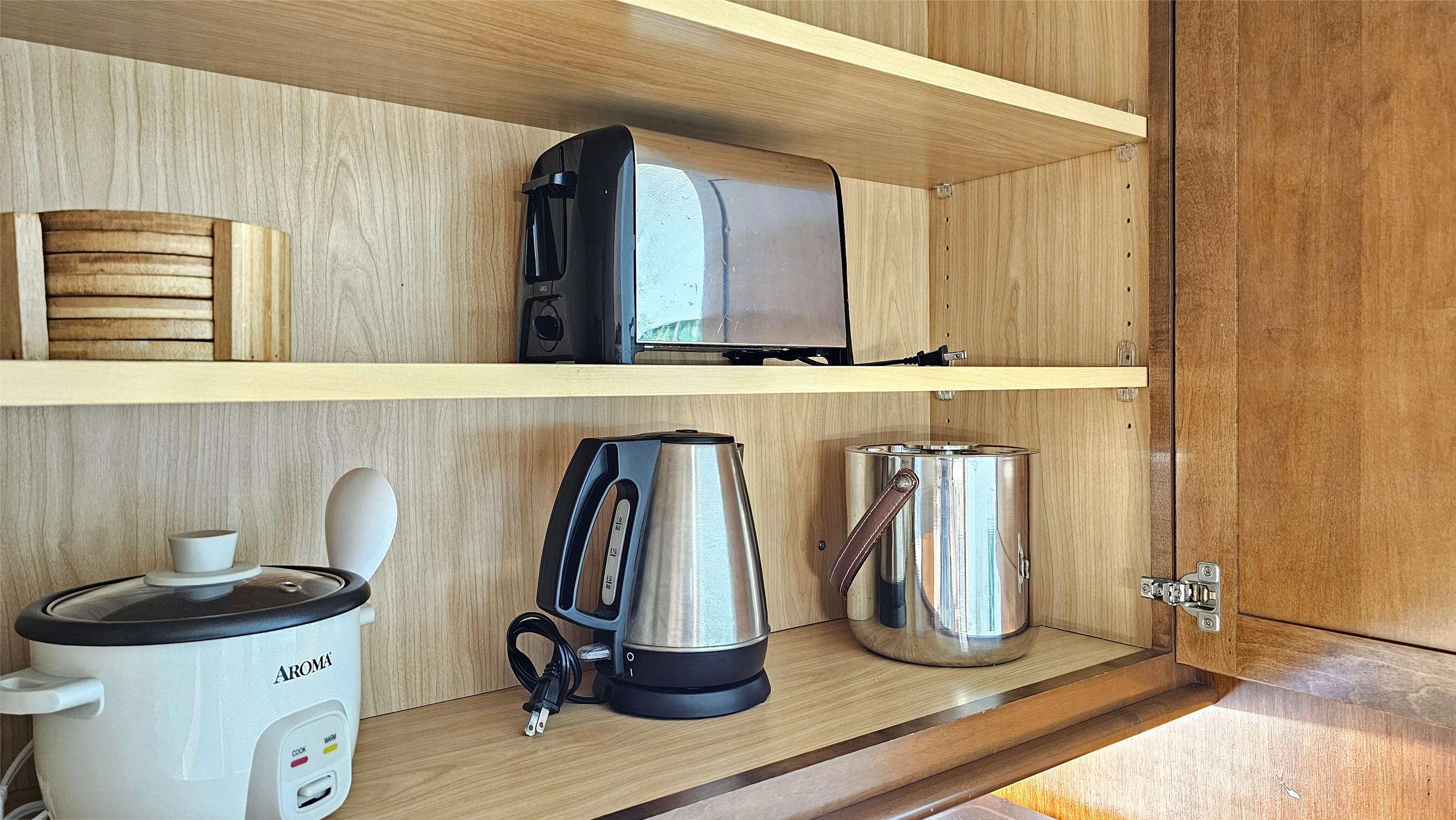 Coffee maker, electric hot water kettle, blender, toaster, rice cooker, dishes, cookware