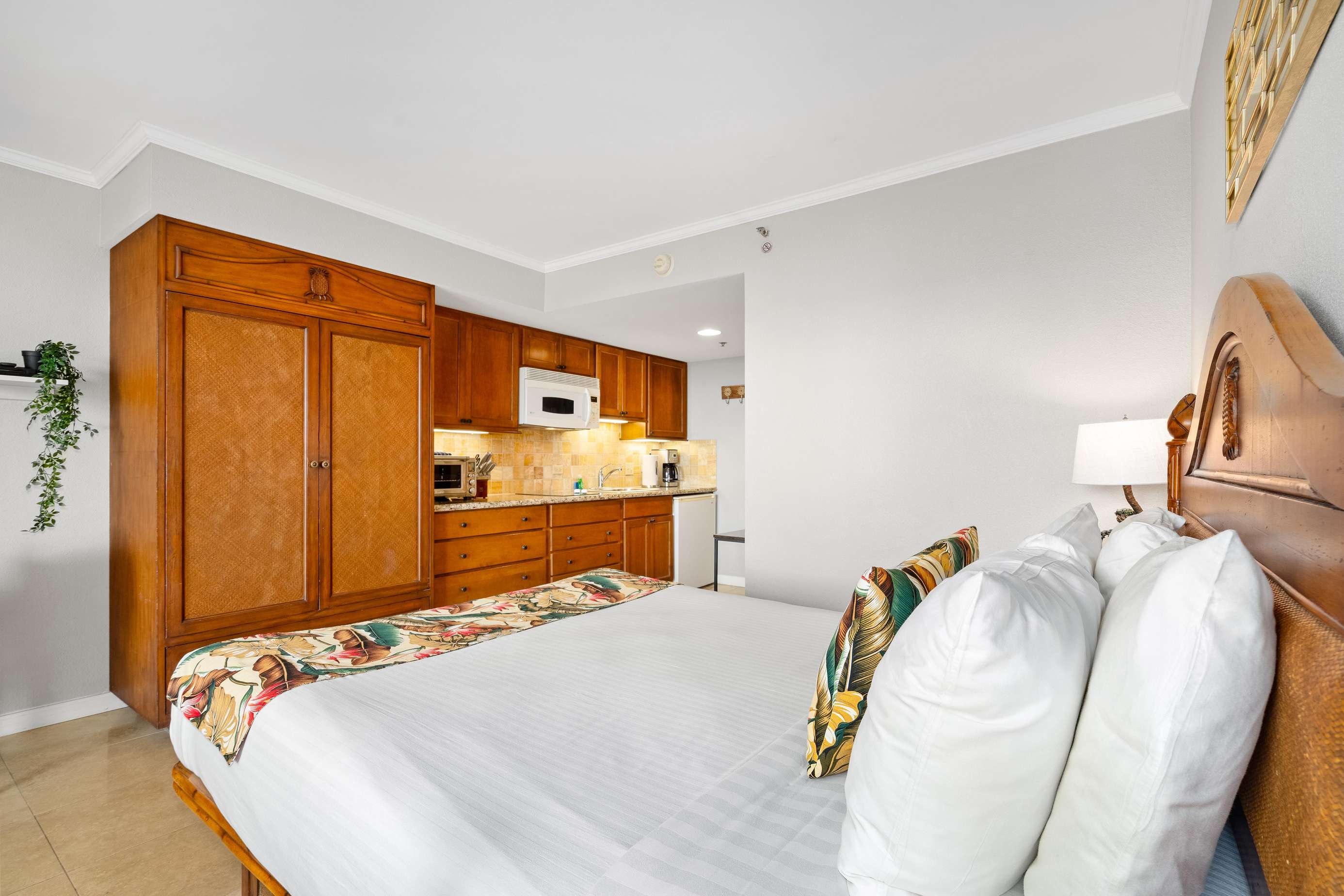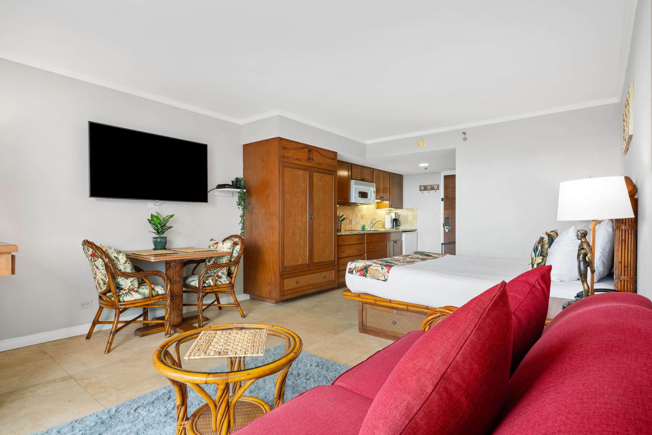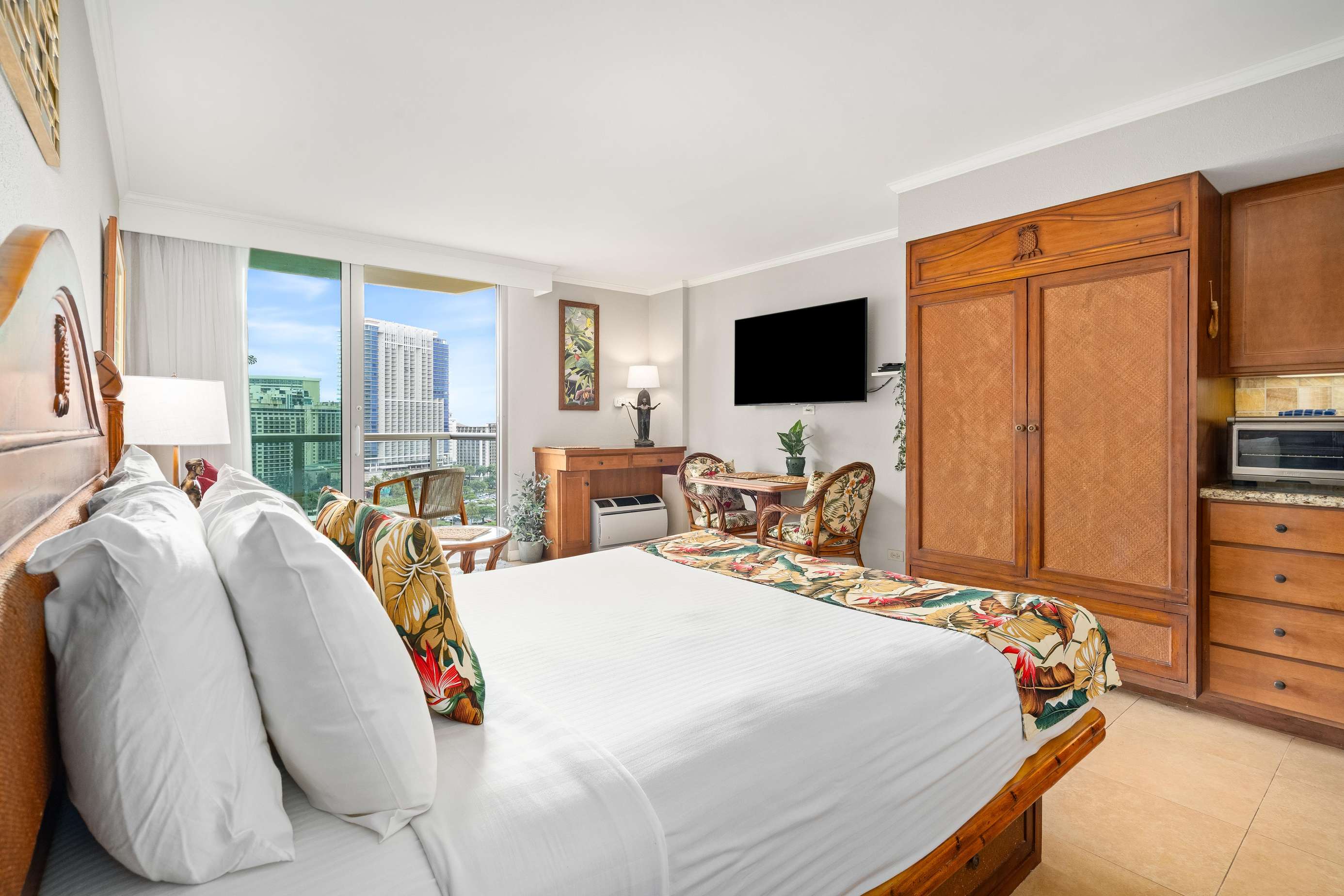 A true gem at the stunning Luana Hotel property. Our modern Queen bed Studio (plus Sofabed) Sleeps 4 and is located on the 15th floor with insane Park, Ocean & Waikiki views with Diamond Head as a backdrop.