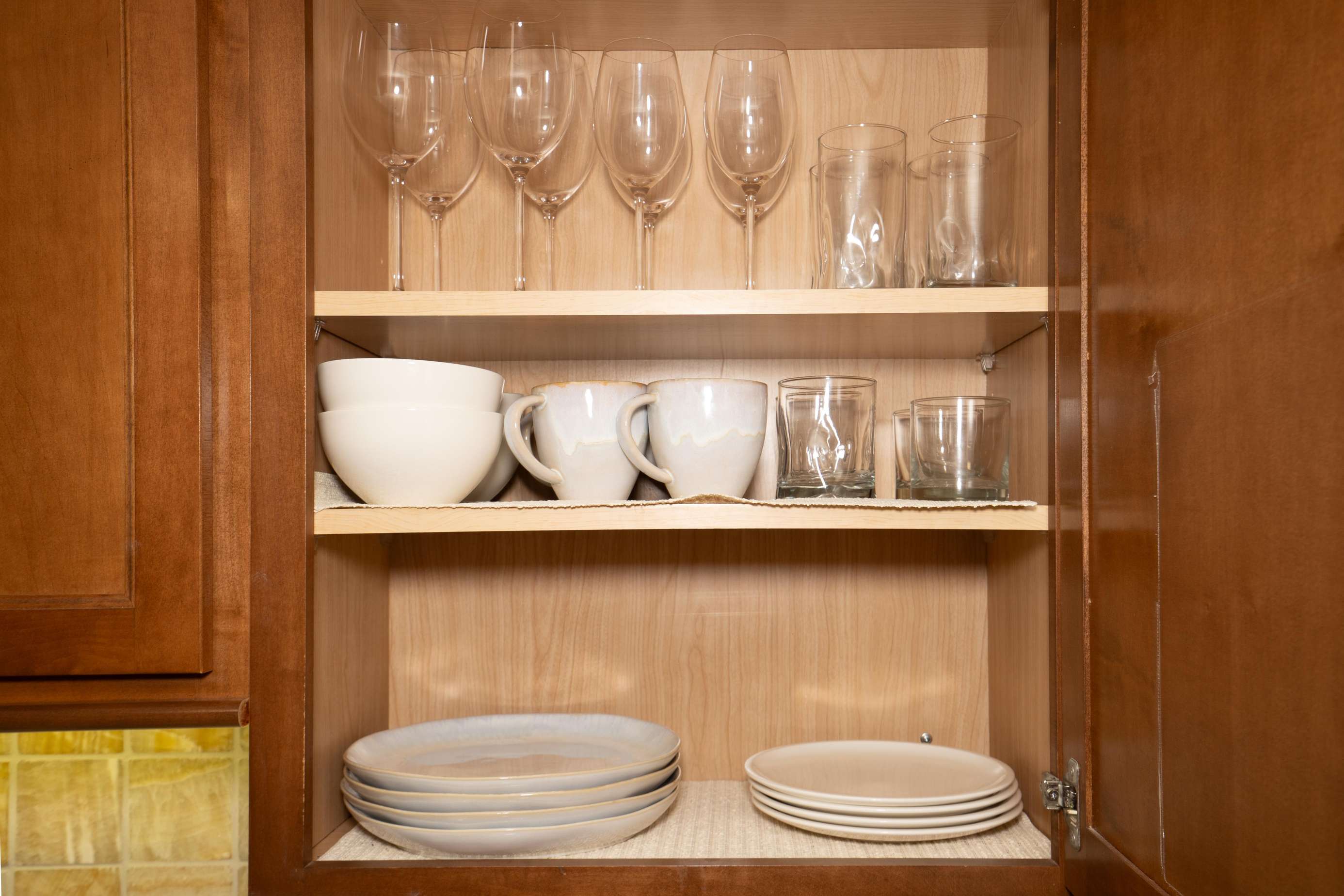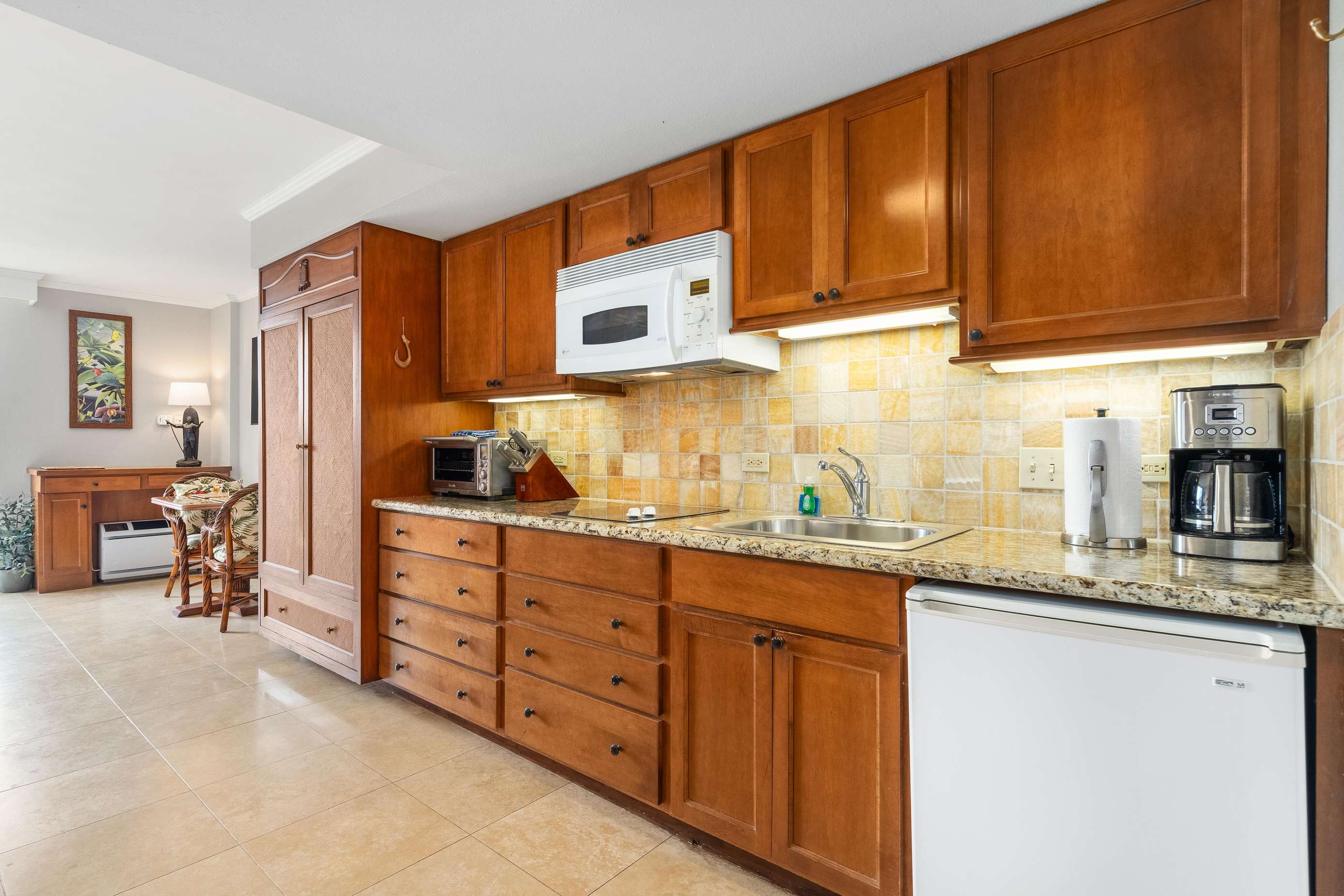 The impeccably clean kitchen area has an electric stovetop, microwave, coffee maker plus all cookware, dishware, glasses & utensils.