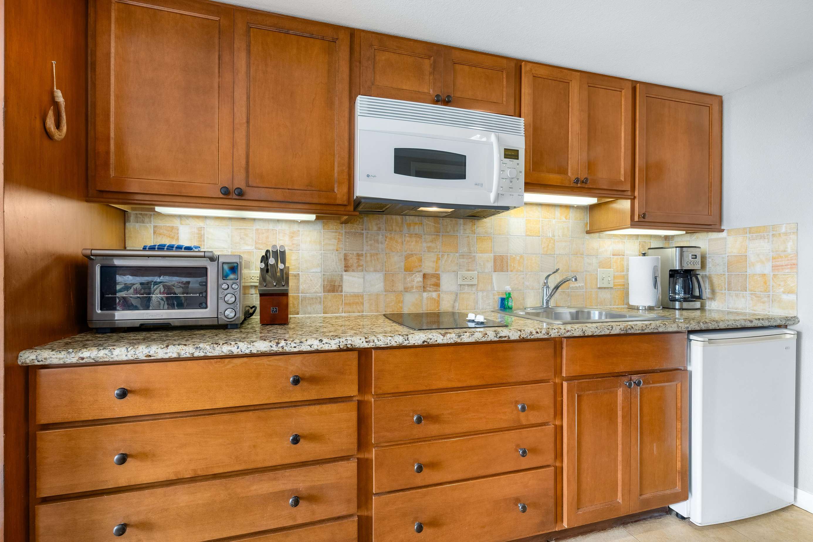 Fully equipped kitchen with filtered water on tap, refrigerator, microwave and stovetop.