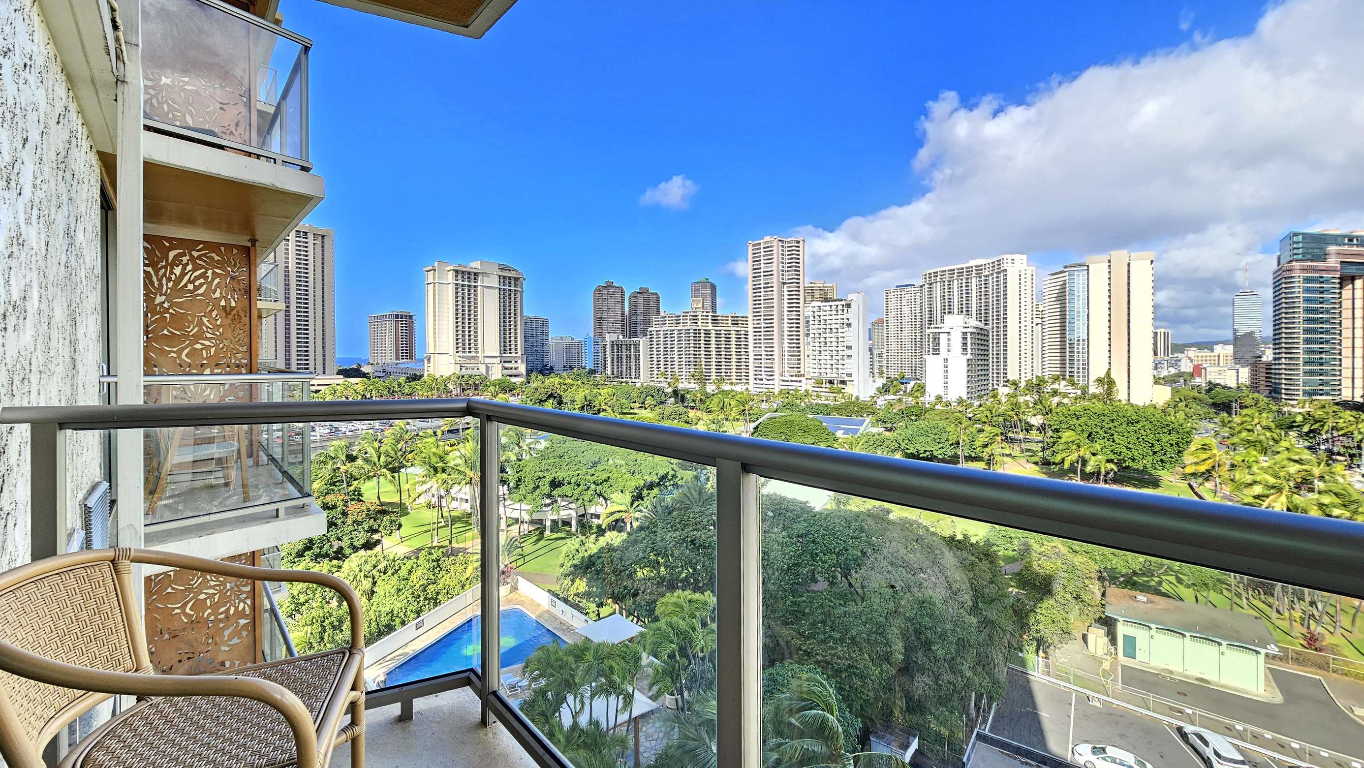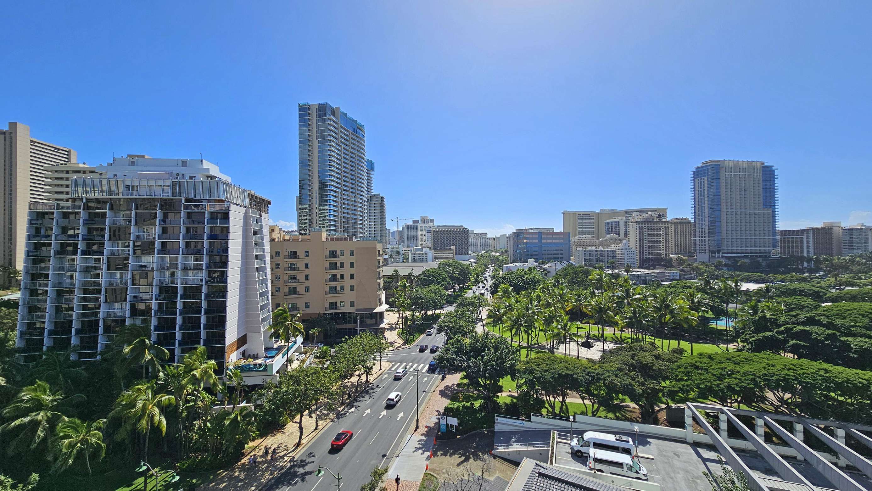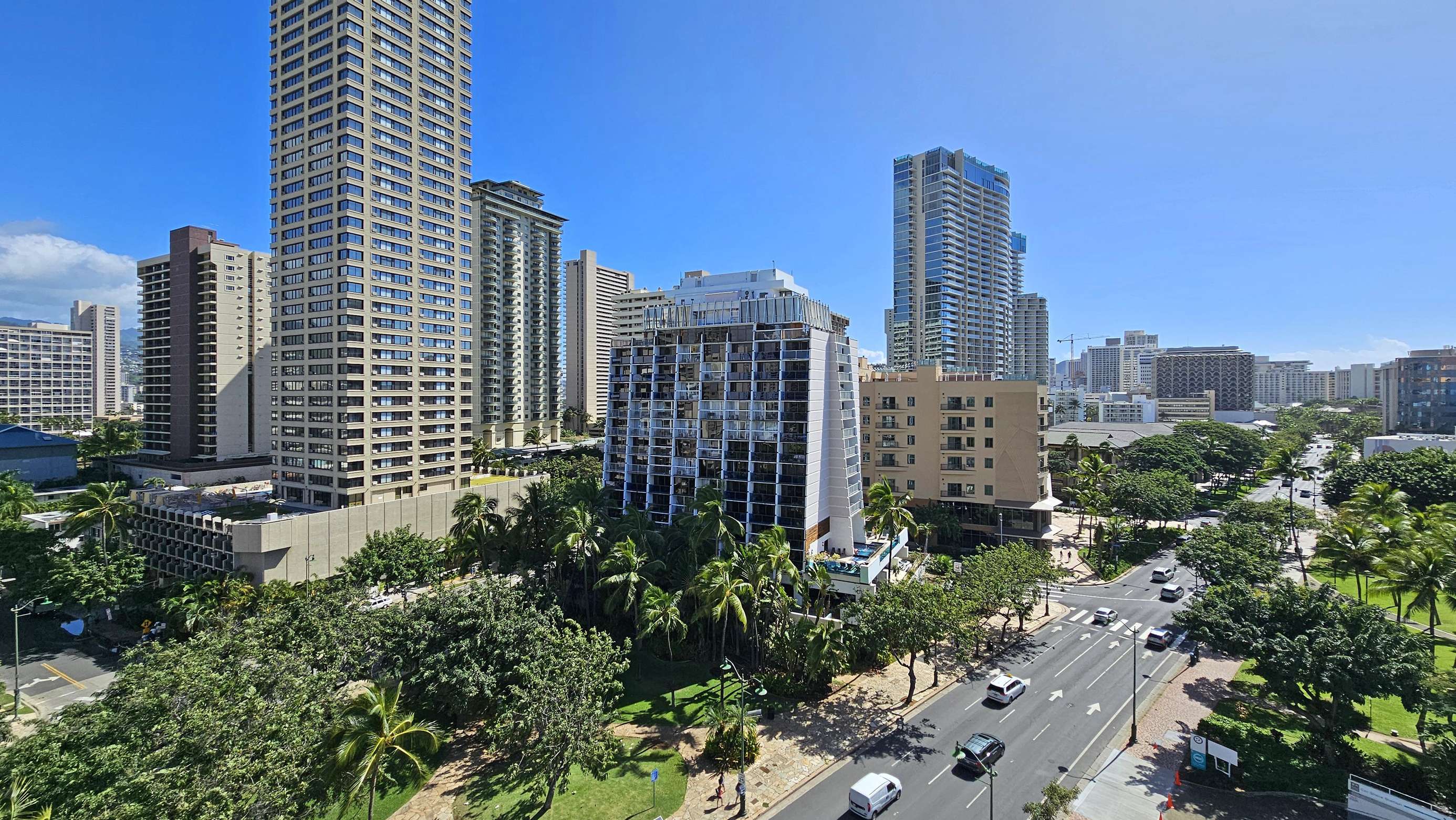 The surrounding area is lush with tropical foliage with vibrant people immersed in a beachy lifestyle. The Waikiki Grand is a convenient centrally located Condotel located at the heart of the city's vibrant nightlife, perfect for those looking to explore the city's lively bar or surf scene in Waikiki.