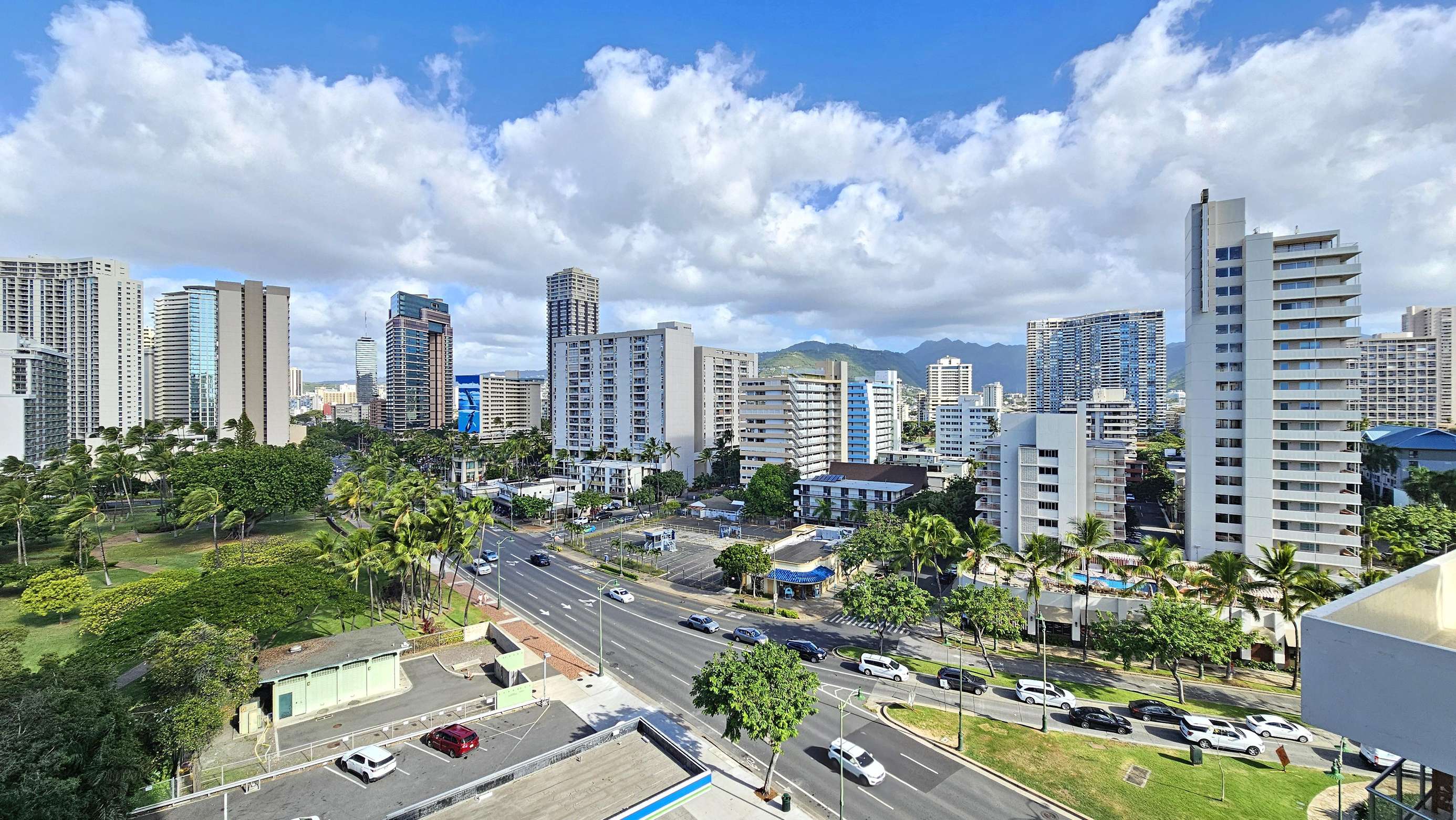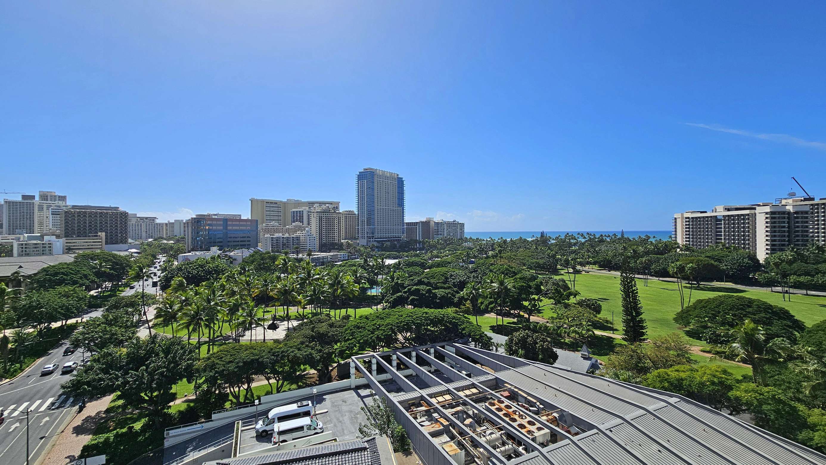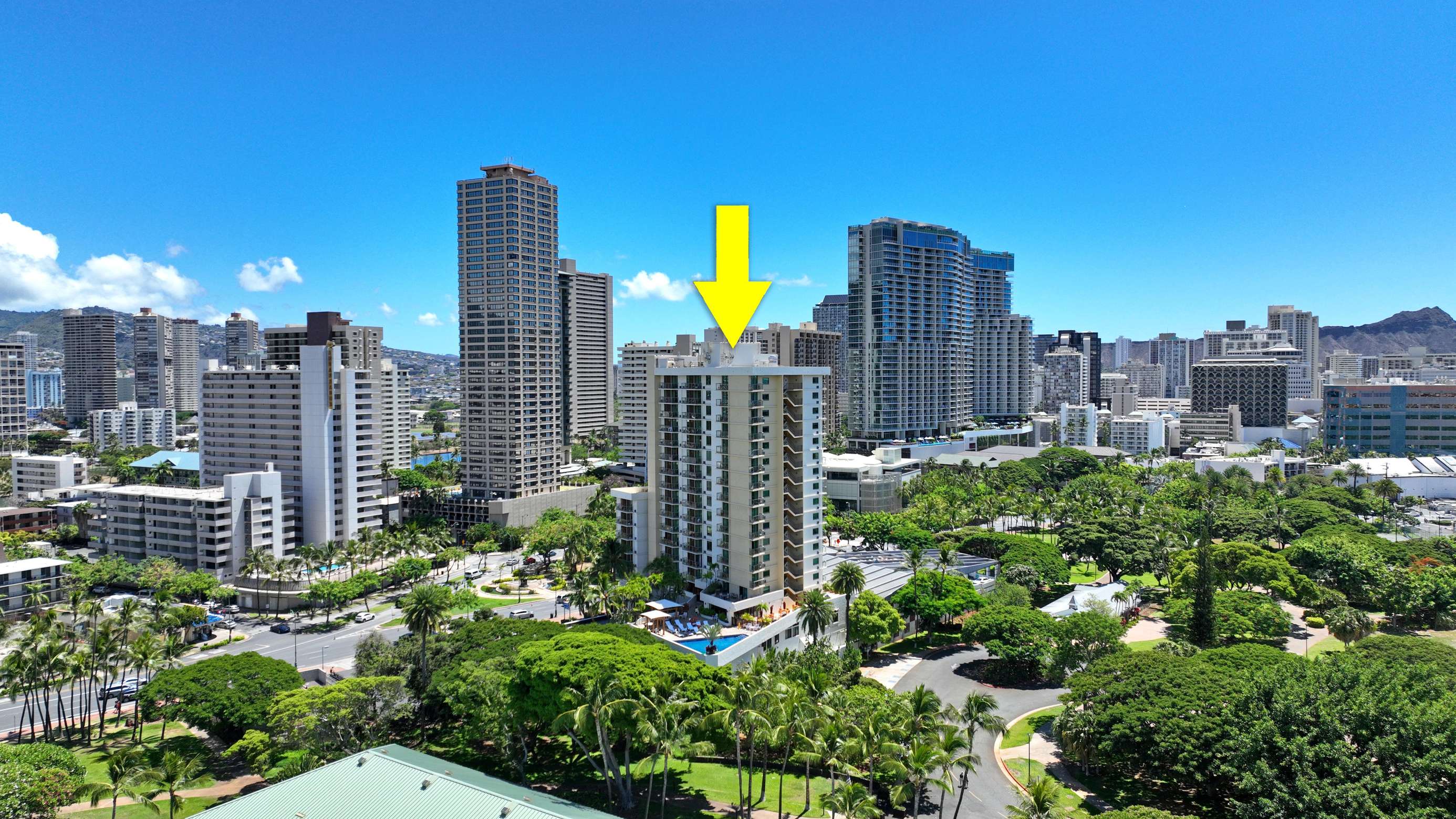 The surrounding area is lush with tropical foliage with vibrant people immersed in a beachy lifestyle. The Waikiki Grand is a convenient centrally located Condotel located at the heart of the city's vibrant nightlife, perfect for those looking to explore the city's lively bar or surf scene in Waikiki.