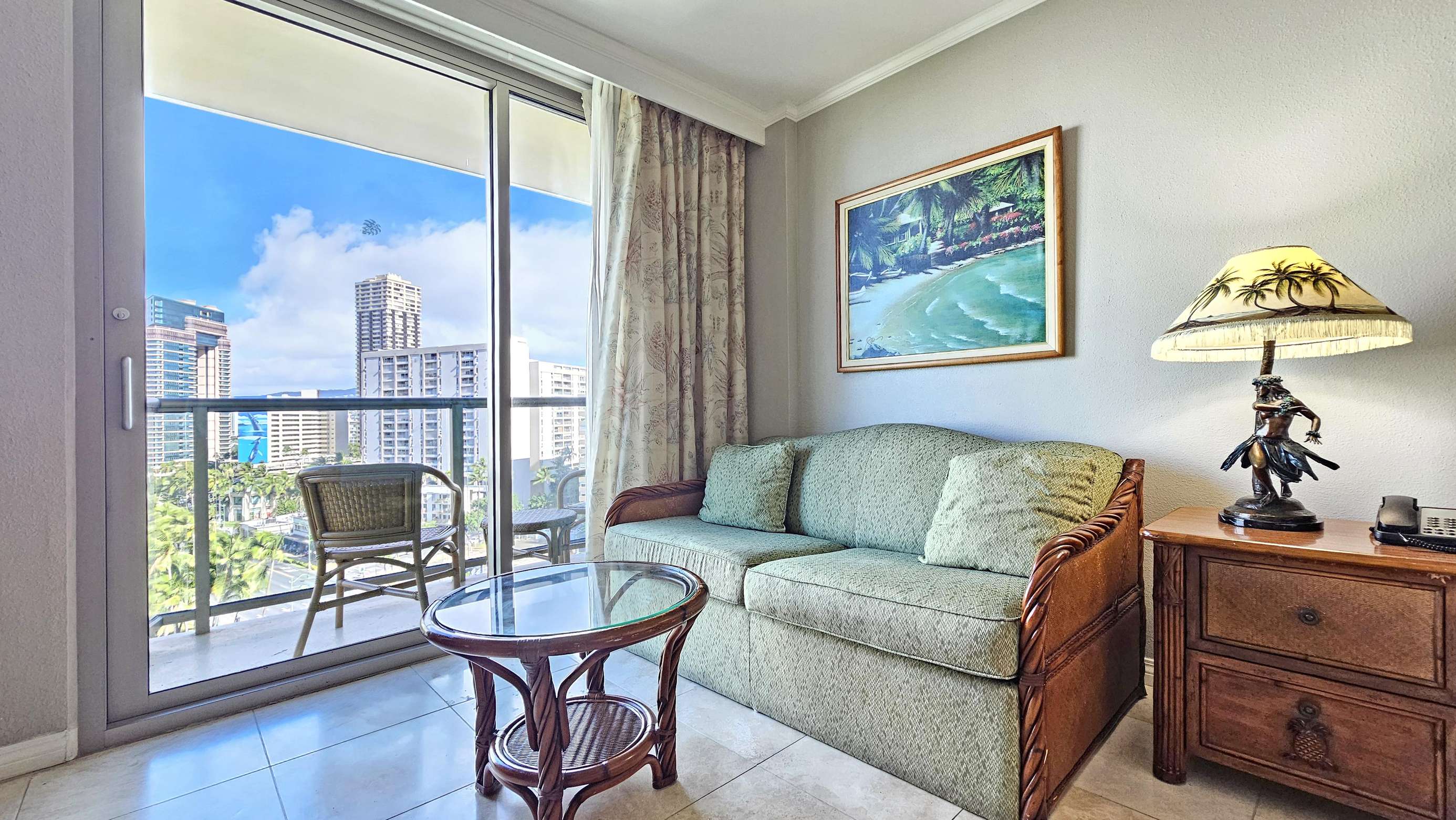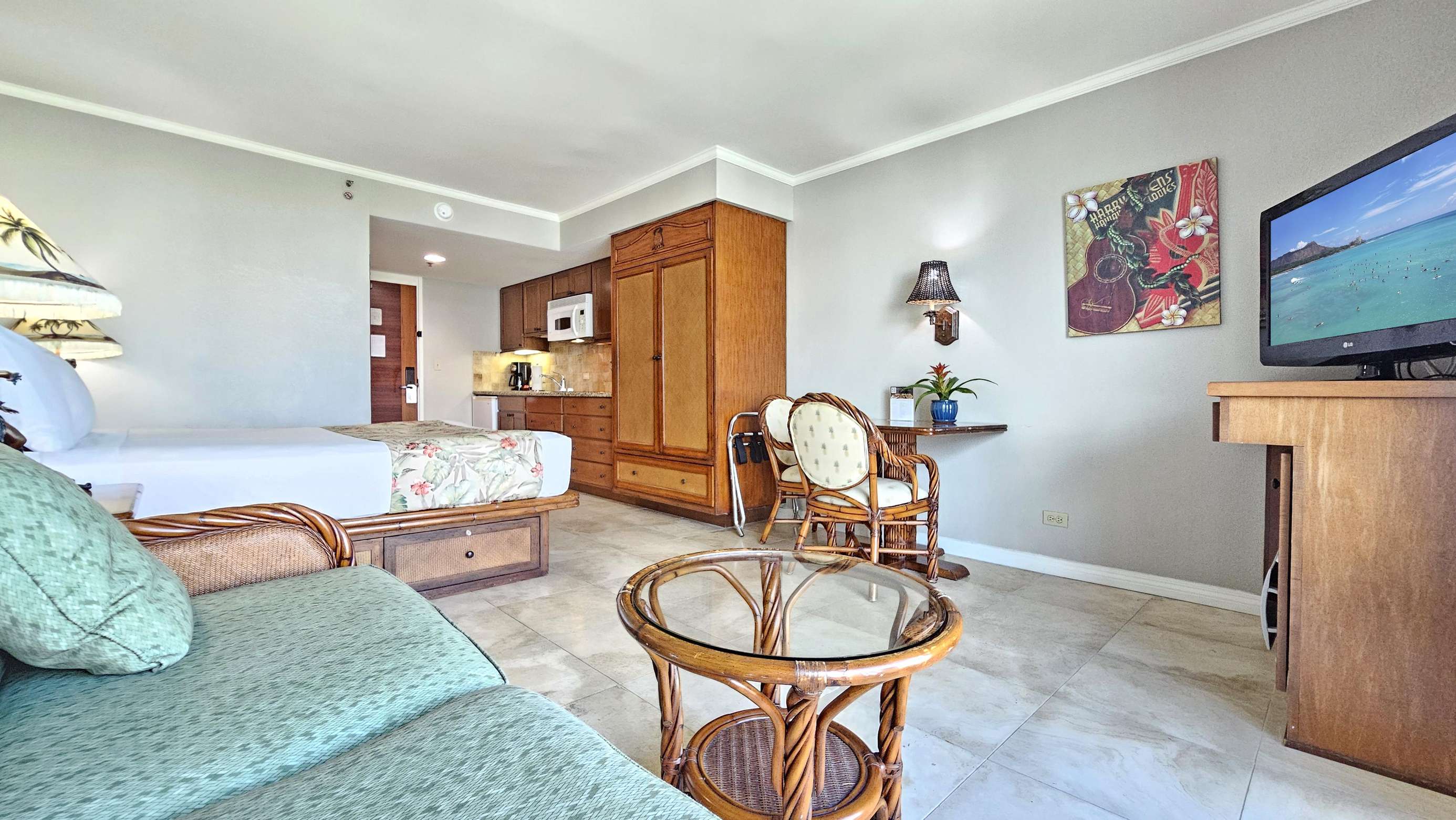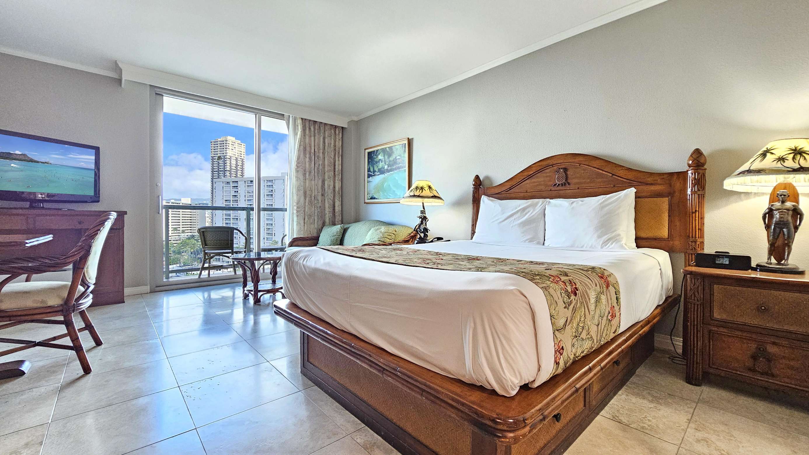 Our modern Queen bed Studio (plus Sofabed) Sleeps 4 and is located on the 8th floor. The lanai offers great Waikiki views with Diamond Head as a backdrop.
