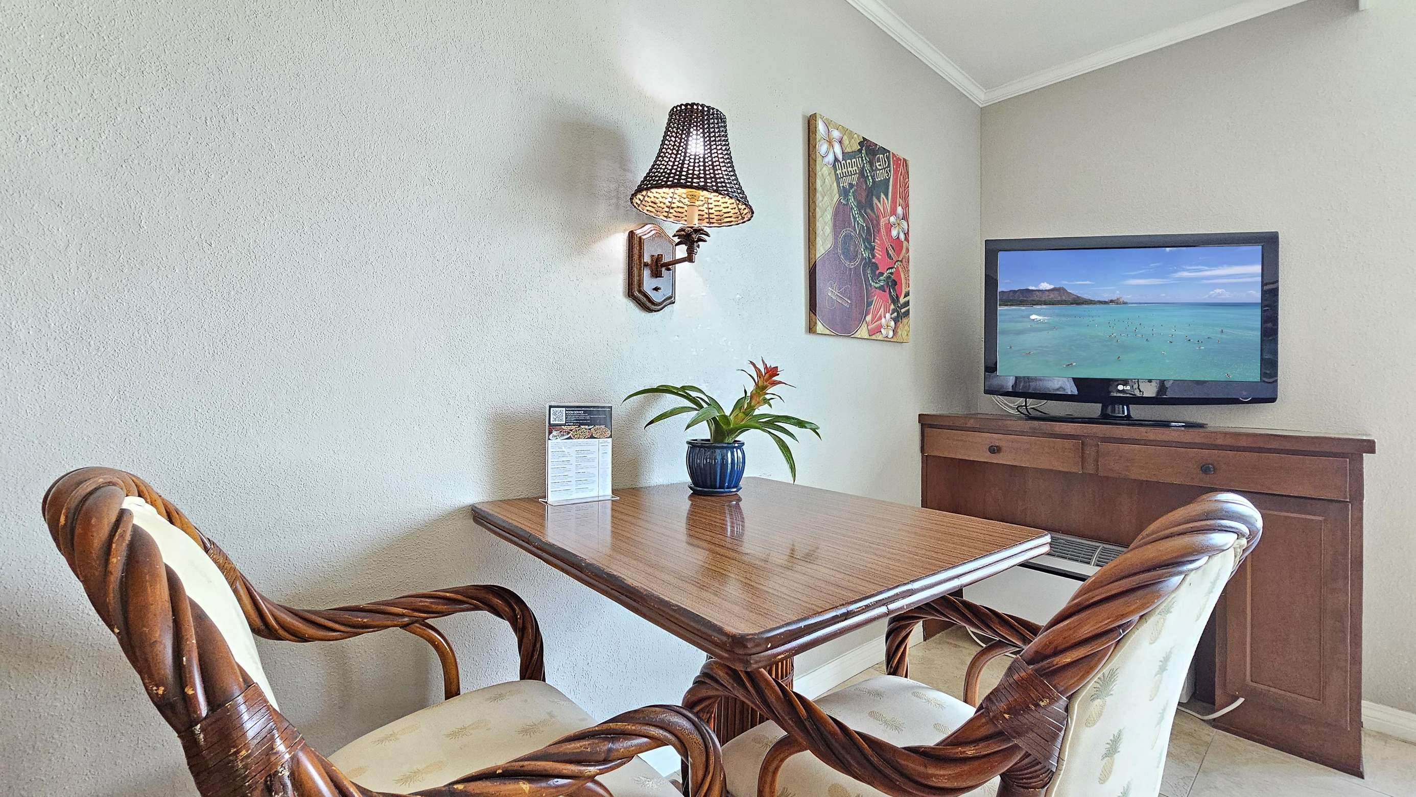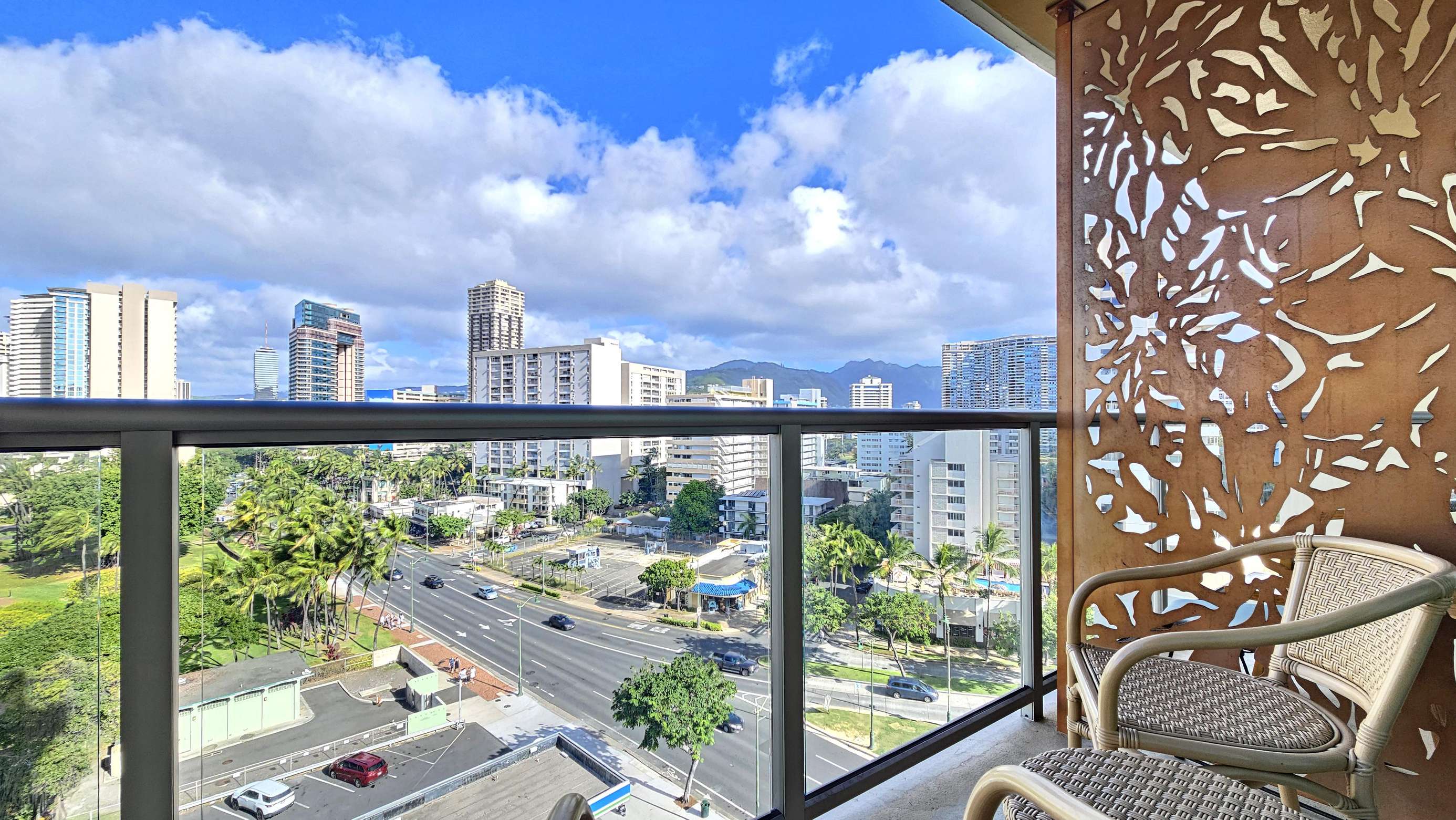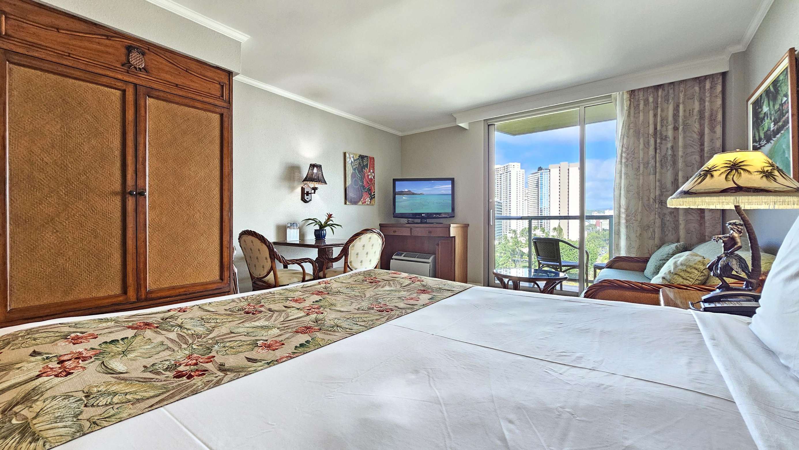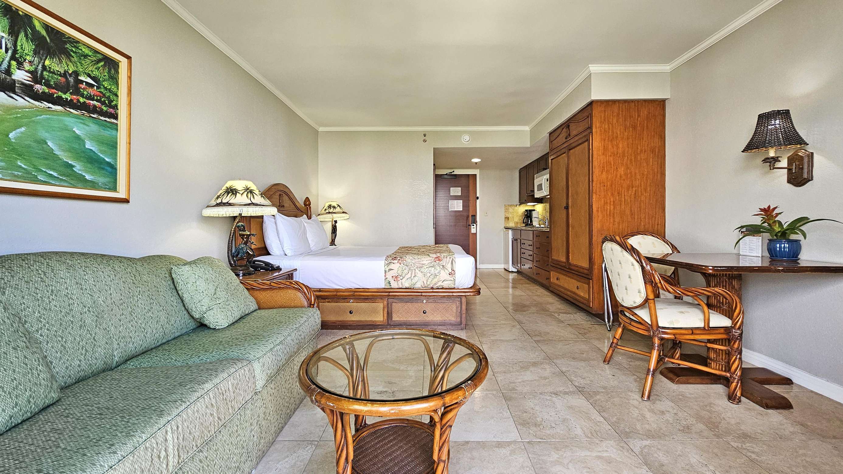 Our modern Queen bed Studio (plus Sofabed) Sleeps 4 and is located on the 8th floor. The lanai offers great Waikiki views with Diamond Head as a backdrop.