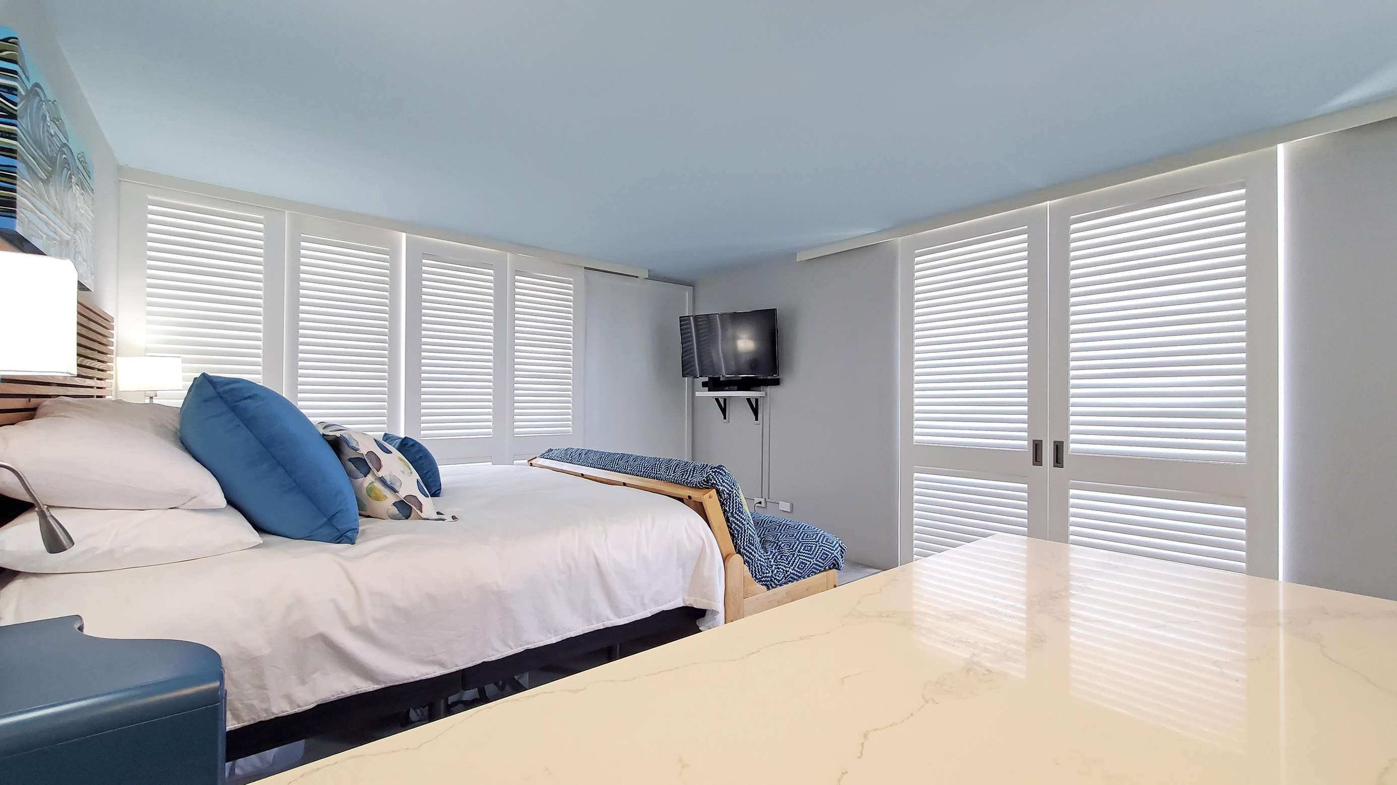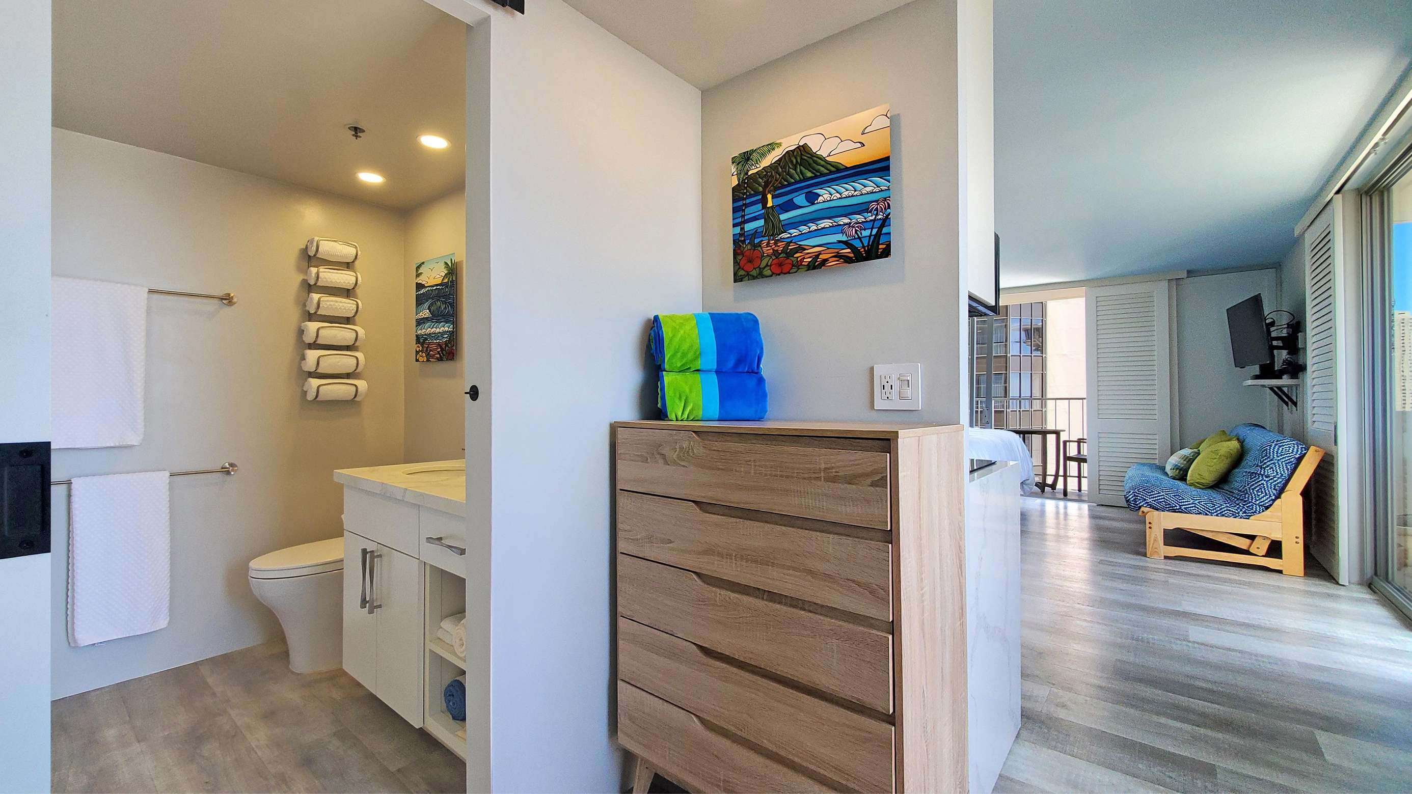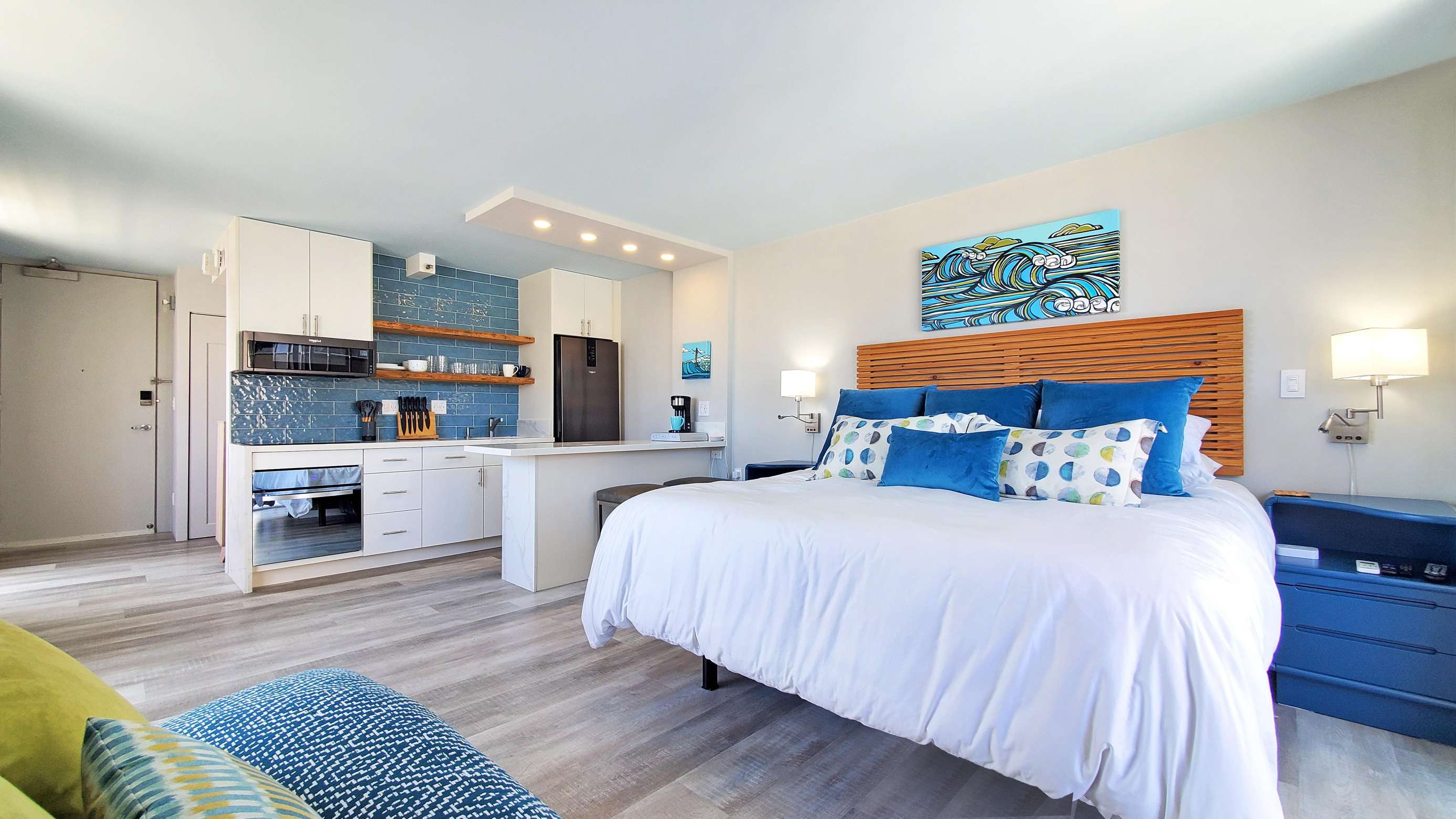 You'll appreciate the stunning views, the super comfortable king size bed and a fold flat full-size futon in the main living area, The studio has an awesome bright, modern kitchen and bathroom. Every attention to detail was meticulously planned and implemented during the full redesign, Enjoy the mountain, city & ocean views as you drink your coffee in the morning and your cocktail at sunset.