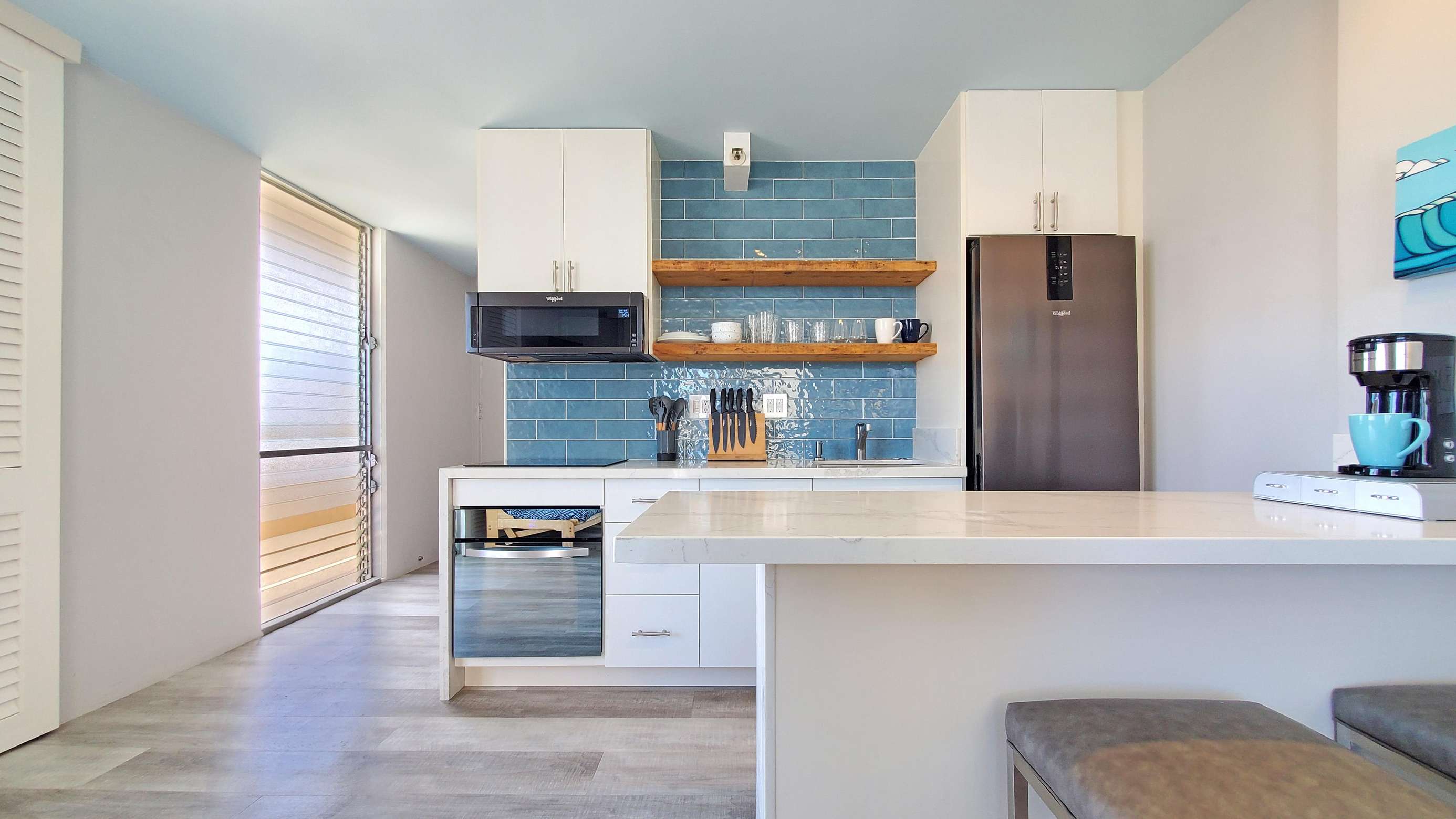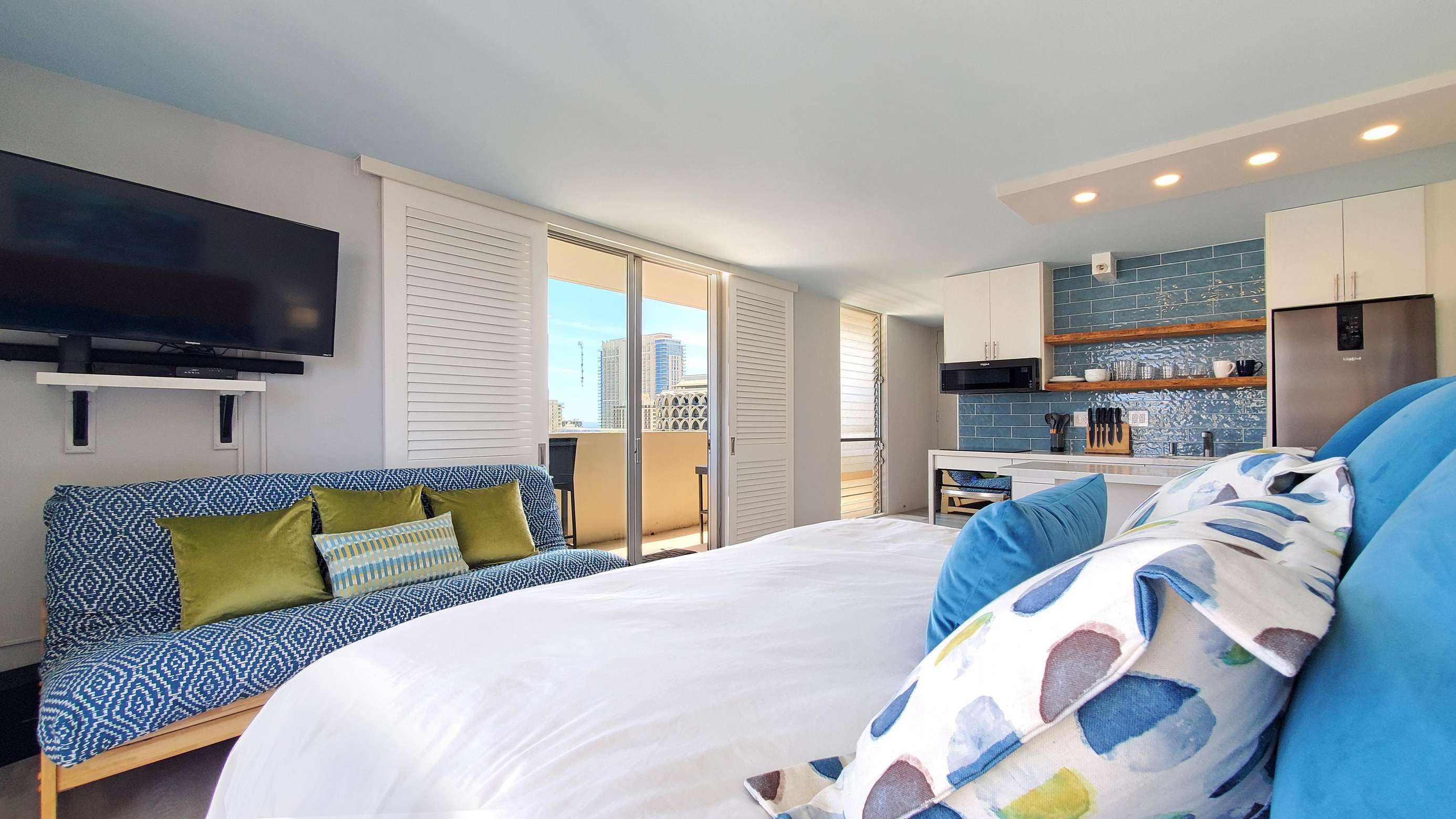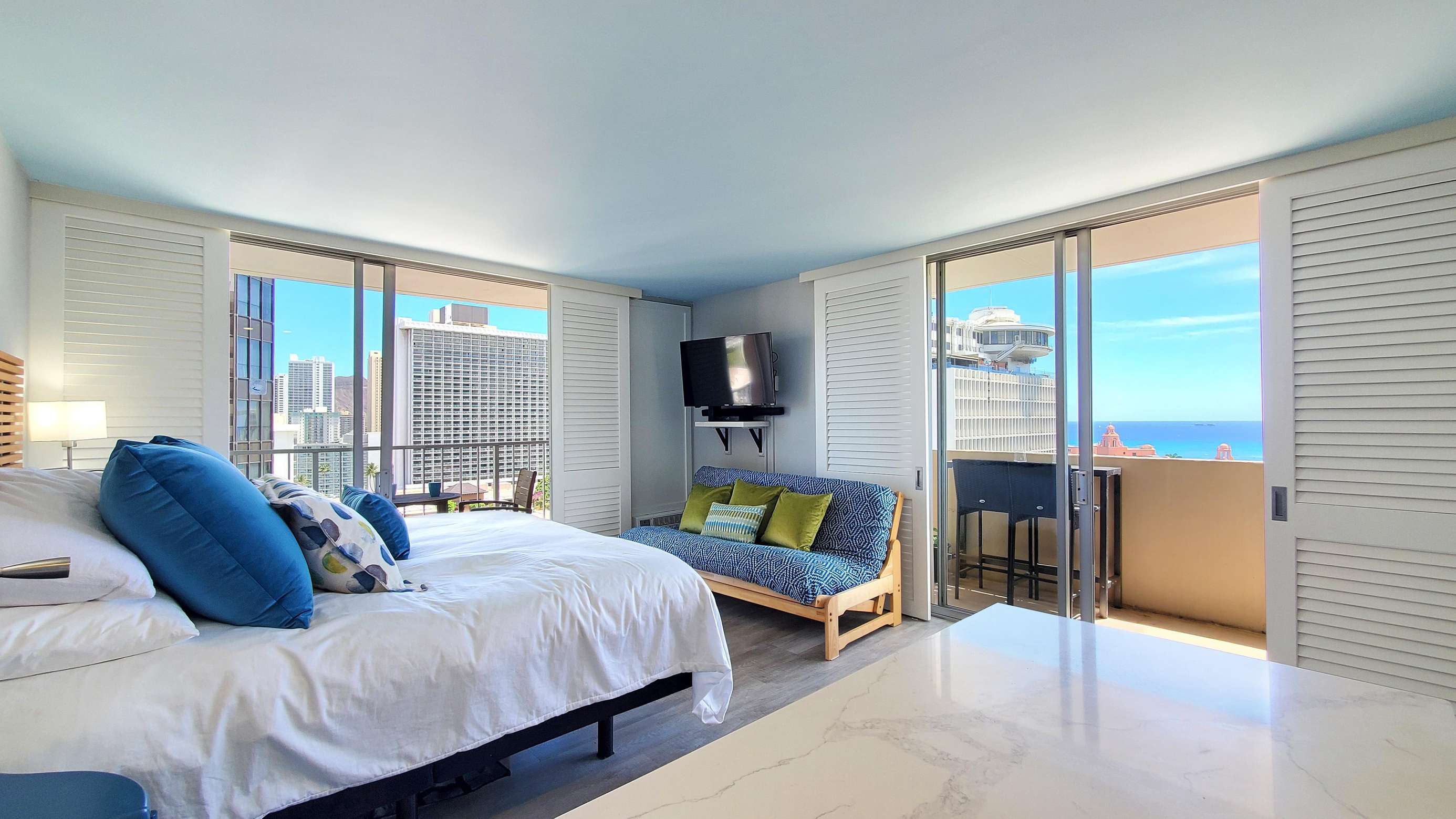 A beautiful fully modernized 17th floor King bed Studio in the heart of Waikiki. Cook from home with ease in this beautiful kitchen. Relax away the cares of your day in the floor to ceiling tile oversized walk-in shower. Even shaving or applying make-up has been made a dream with our ultra modern backlit mirror above the machine crafted custom vanity.