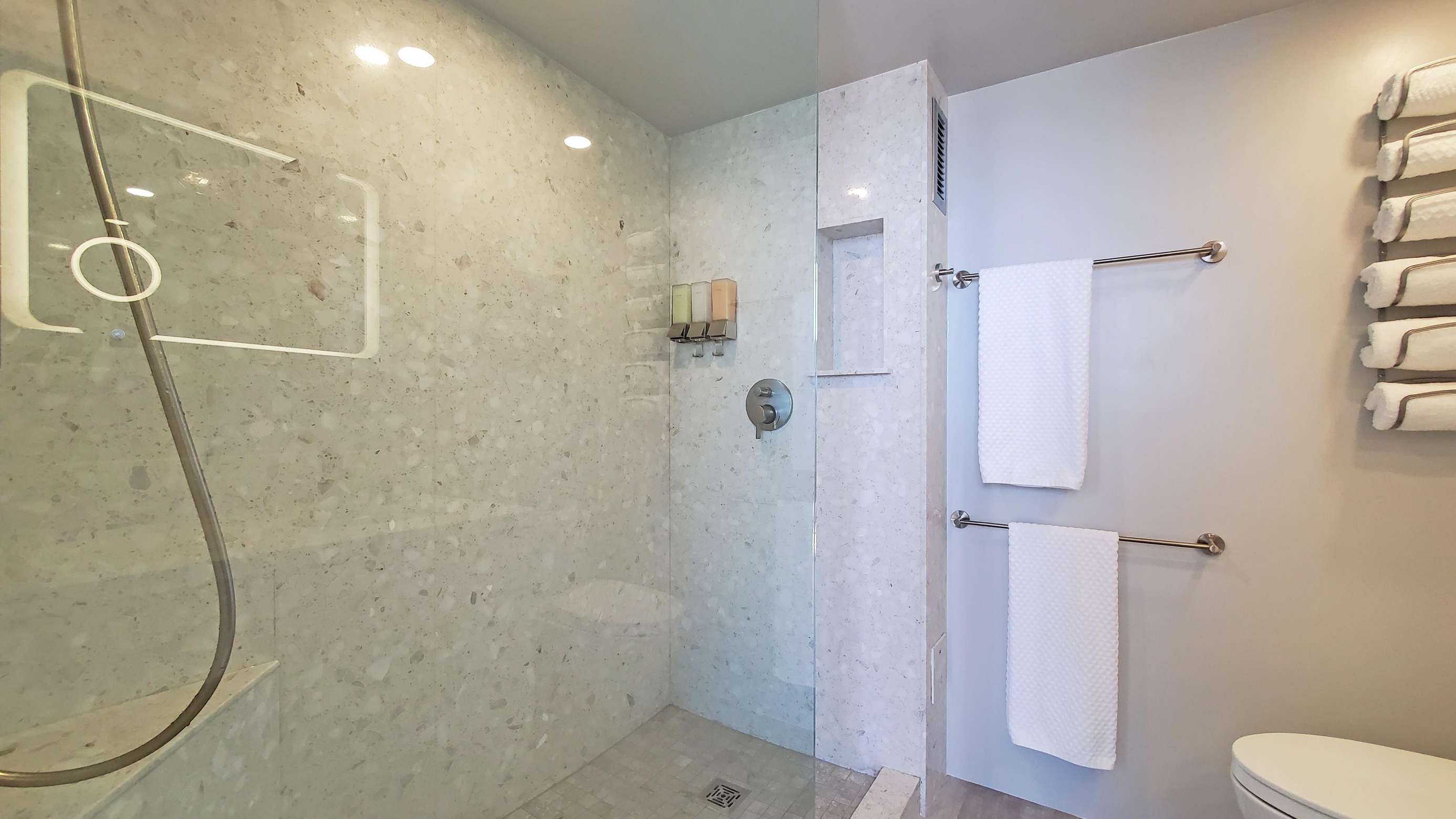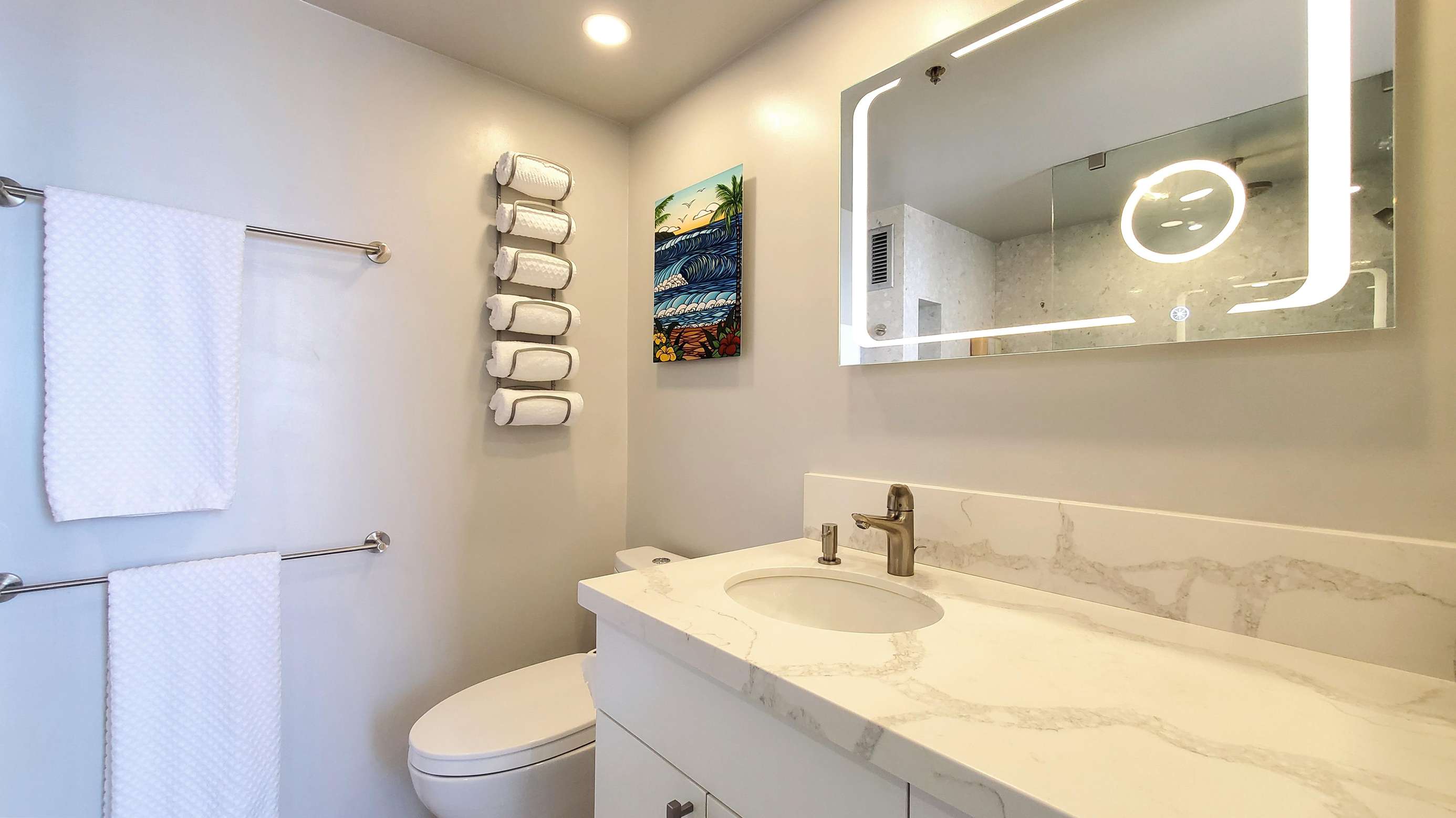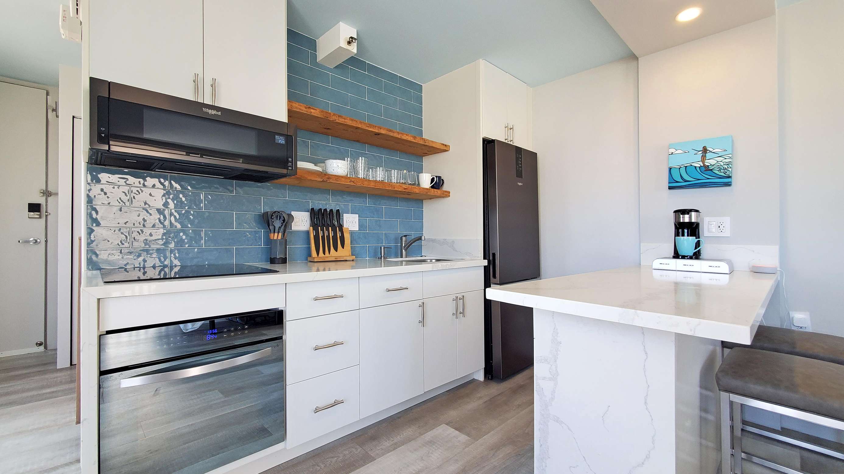 A beautiful fully modernized 17th floor King bed Studio in the heart of Waikiki. Cook from home with ease in this beautiful kitchen. Relax away the cares of your day in the floor to ceiling tile oversized walk-in shower. Even shaving or applying make-up has been made a dream with our ultra modern backlit mirror above the machine crafted custom vanity.