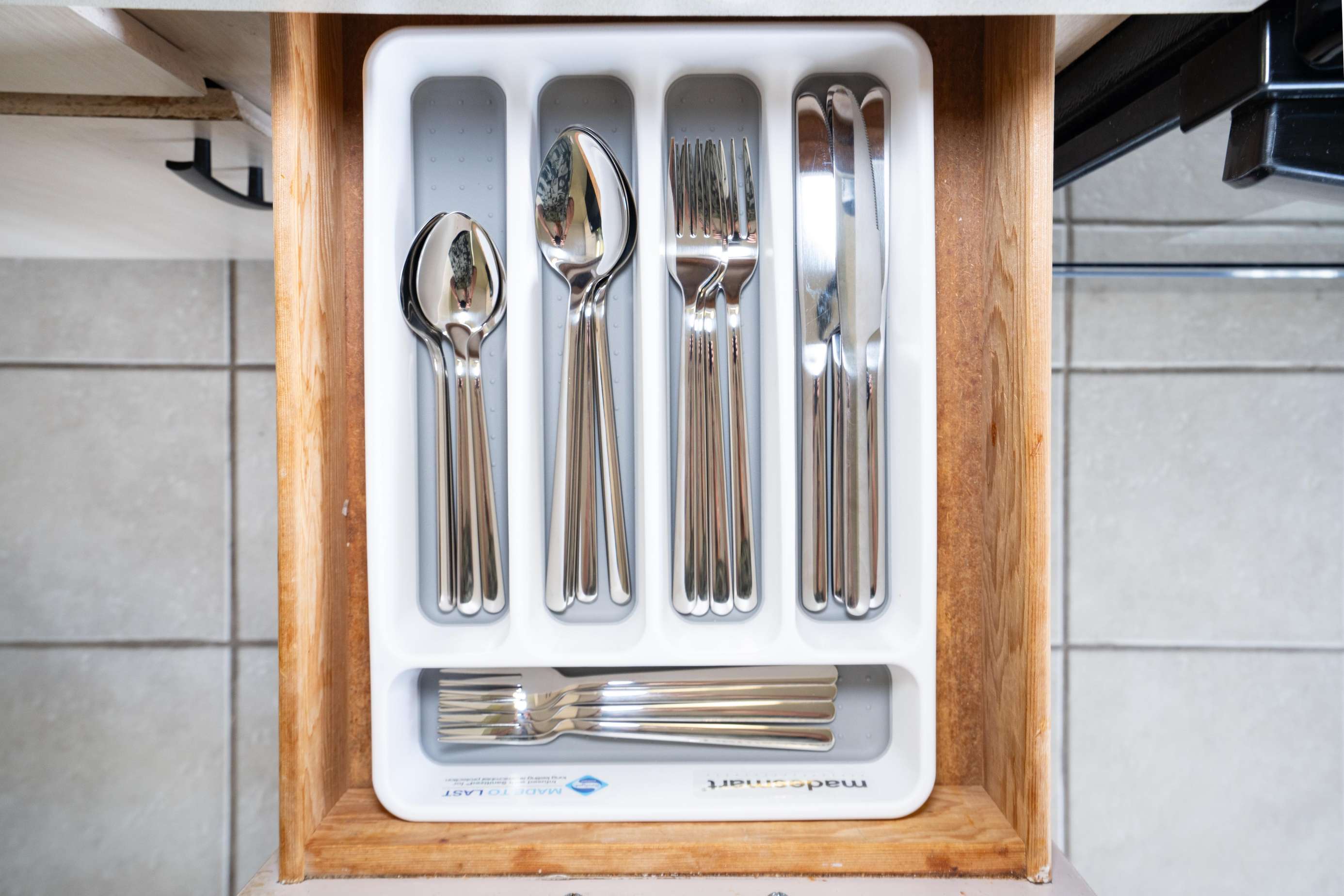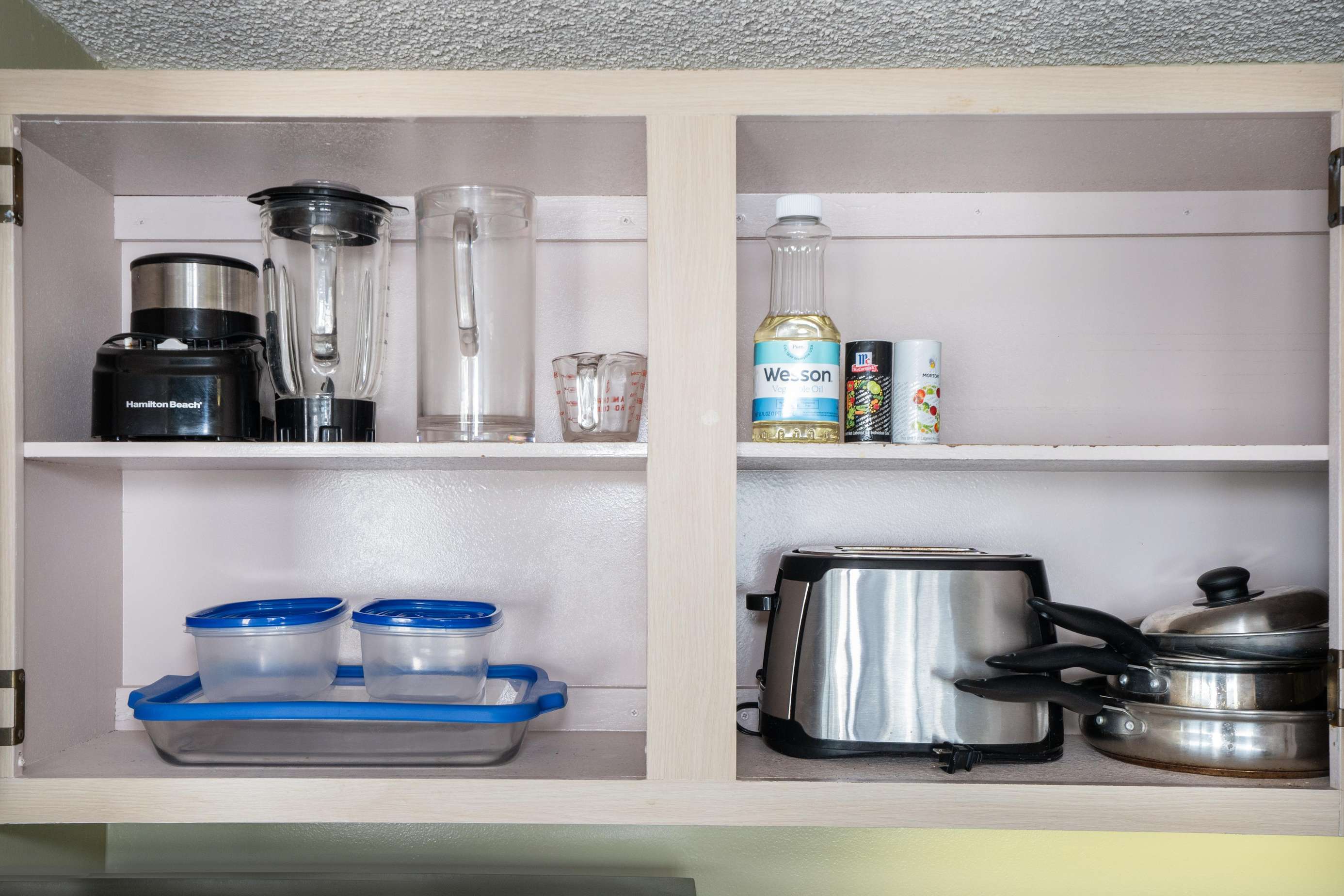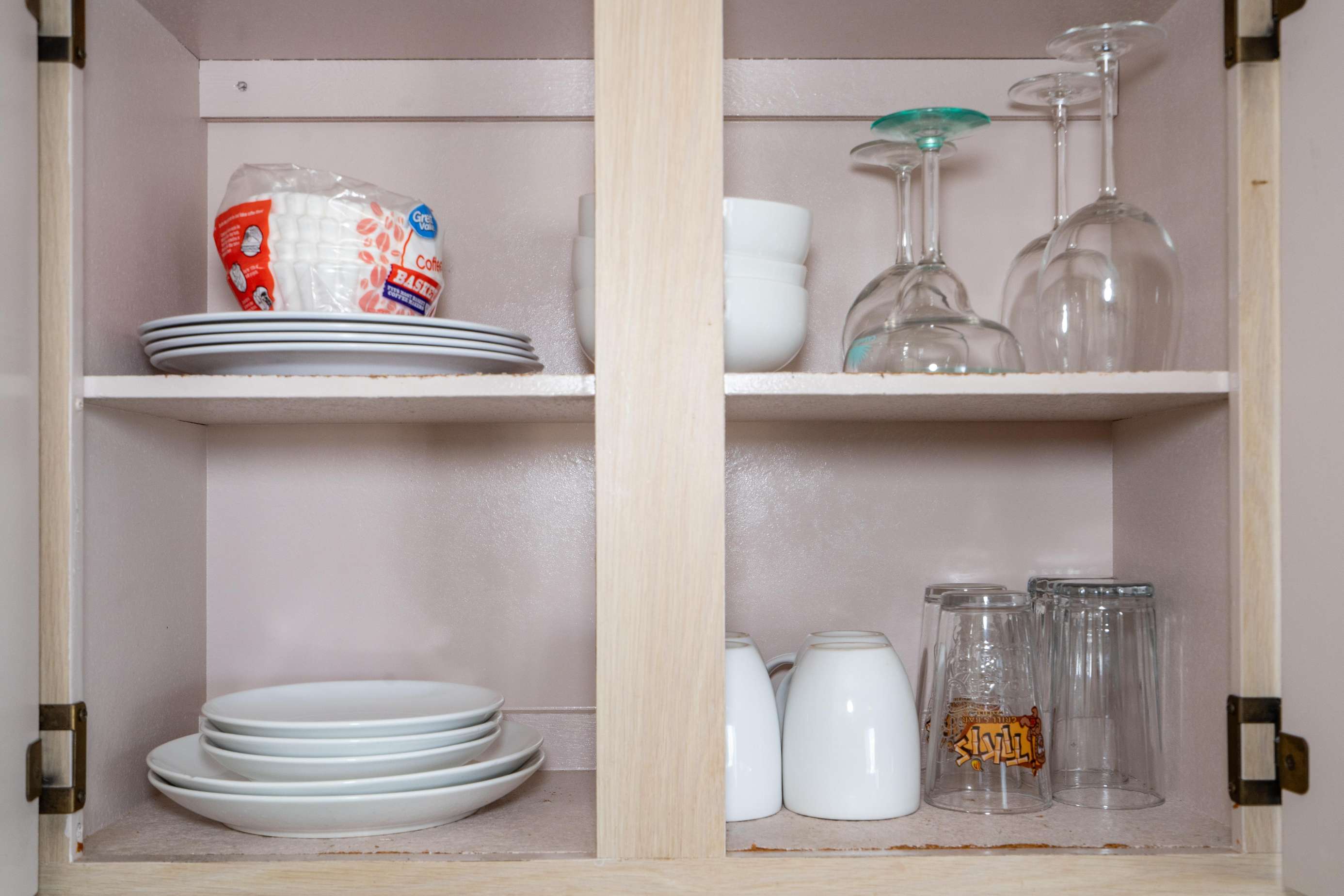 There's a full kitchen with 4 burner stove & oven along with microwave, blender, coffee maker, plus all pots, pans, dishware & silverware. Ample glasses and mugs.