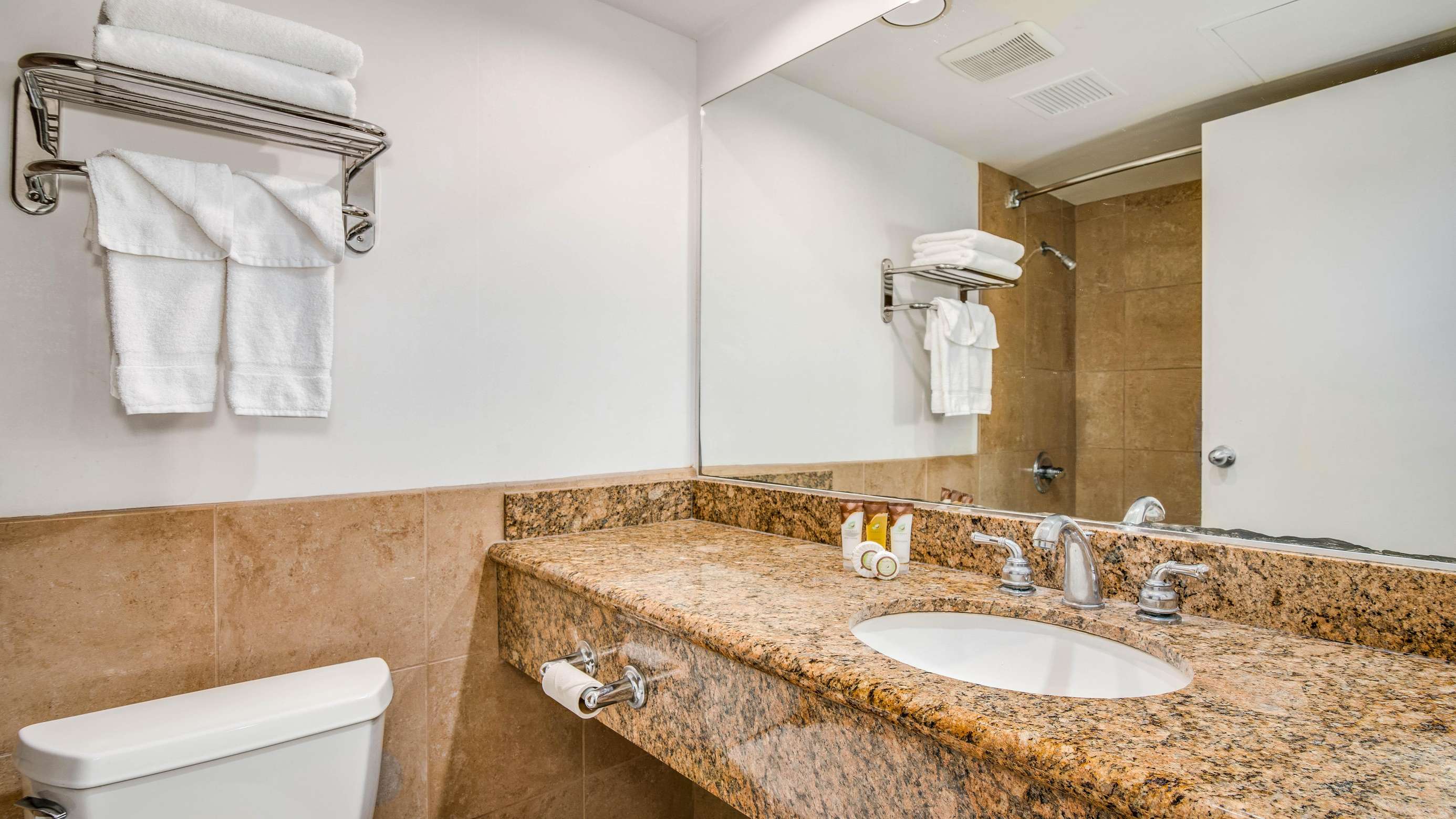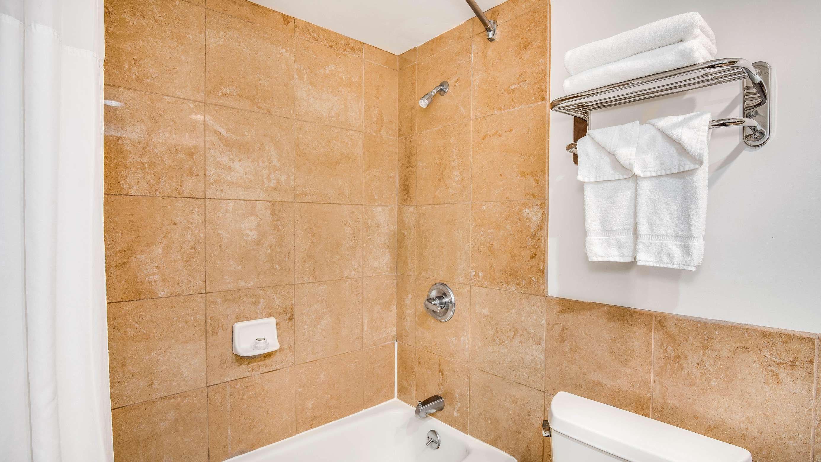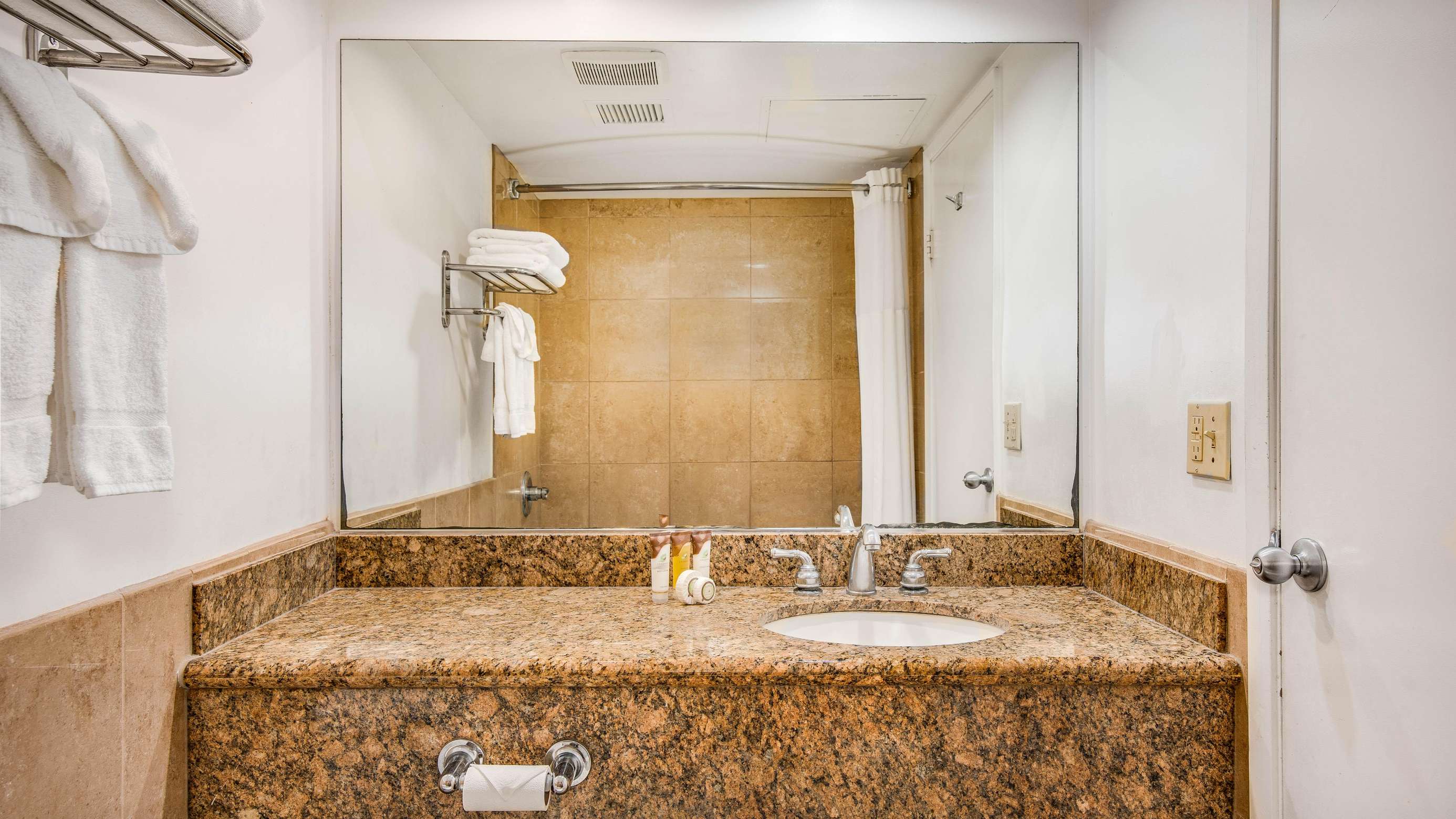 This property is elevator accessible and all guests have access to the on site parking lot for $25/night (check with front desk for availability), pool and laundromat. Also available on site is IHOP (International House of Pancakes).