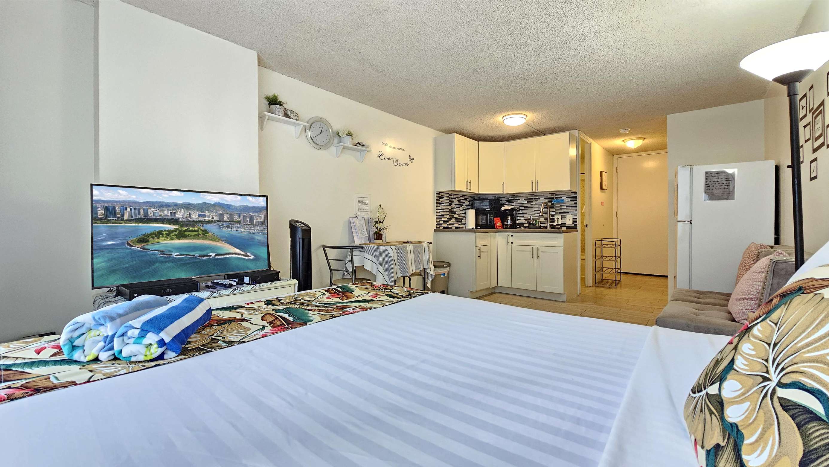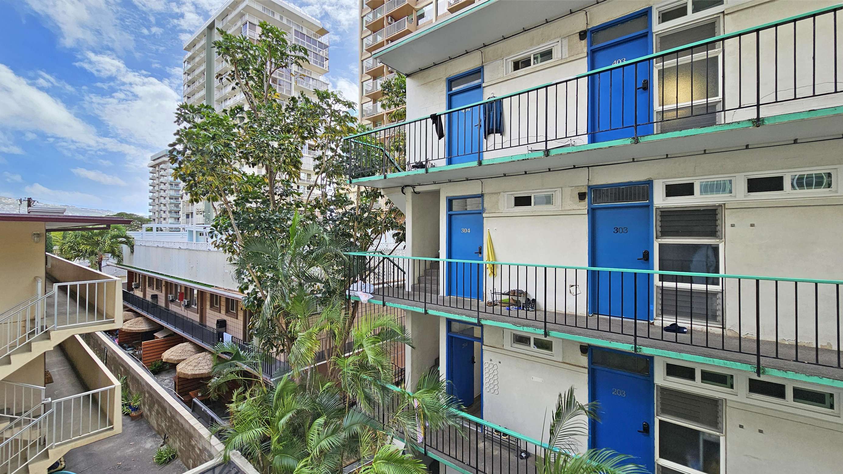 Tradewinds Plaza # 309 on the 3rd floor and is bright and cool. Very clean room with a queen bed and a double chair, plus air conditioner. Dining area for 2 and kitchen.