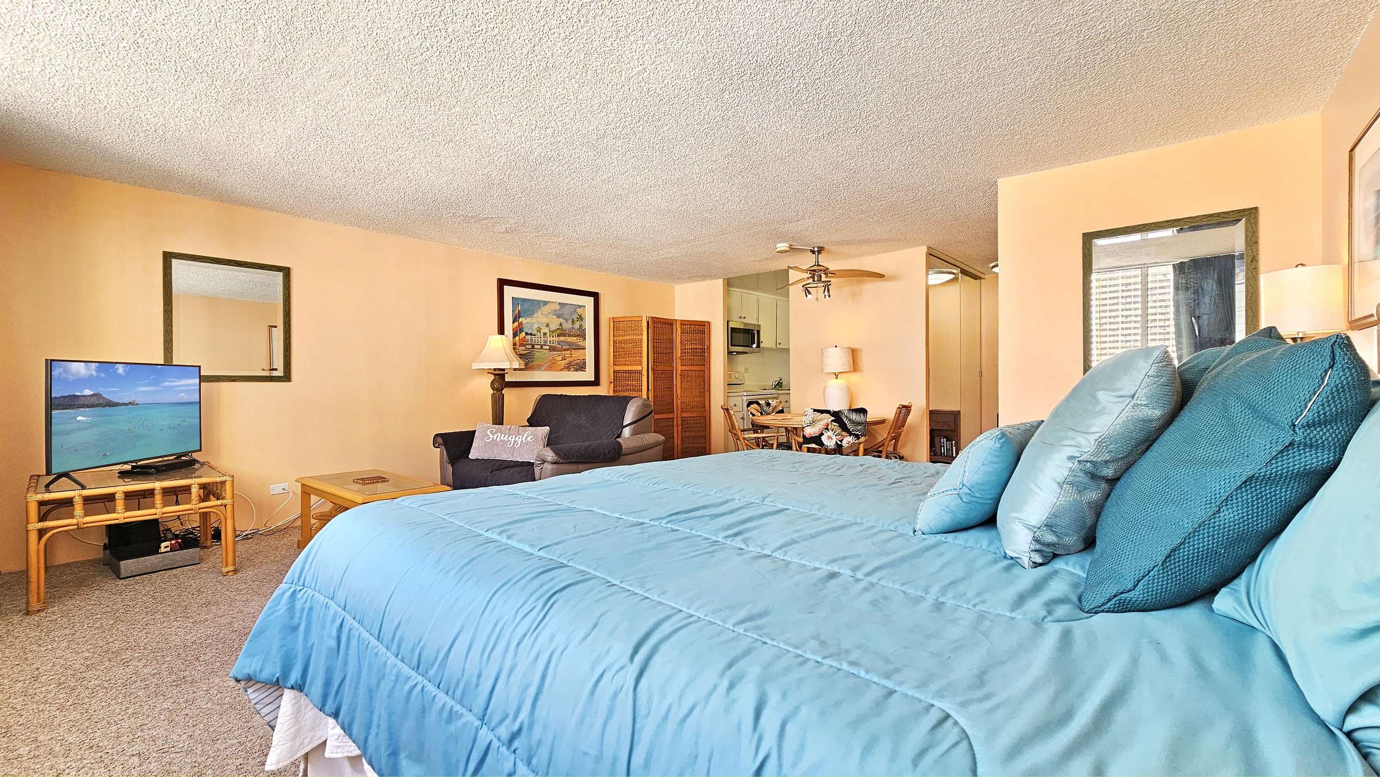 Our 30 Day Rental offers free parking, WiFi & Cable, onsite laundry facilities and has partial ocean views.
