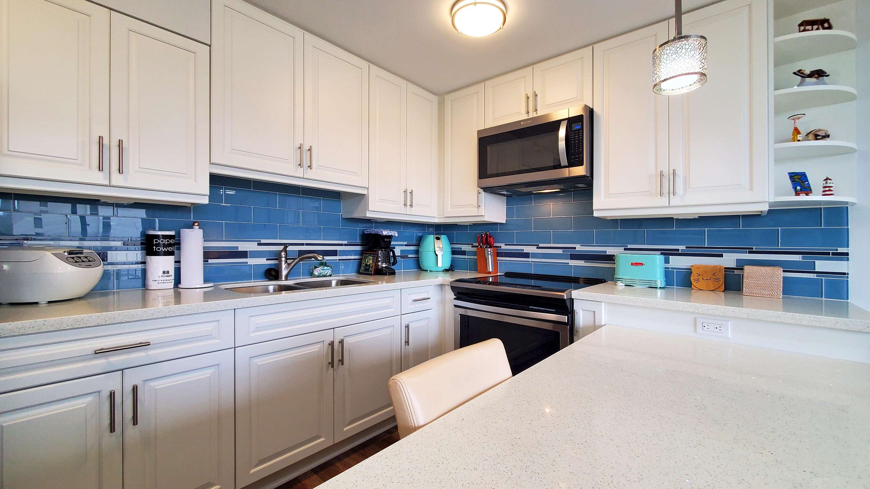 The spacious living area offers TV & cable and ample seating. The modern full kitchen is well equipped with everything you need to cook at home, along with ample dishes, glassware, for the family.